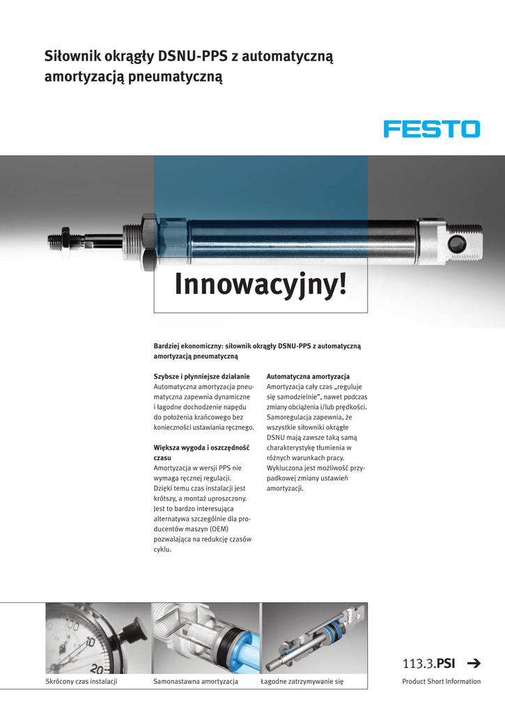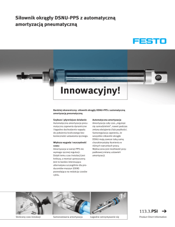 Siłownik okrągły DSNU-PPS z automatyczną amortyzacją pneumatyczną Innowacyjny! Bardziej ekonomiczny: siłownik okrągły DSNU-PPS z automatyczną amortyzacją pneumatyczną Szybsze i płynniejsze działanie Automatyczna amortyzacja pneumatyczna zapewnia dynamiczne i łagodne dochodzenie napędu do położenia krańcowego bez konieczności ustawiania ręcznego. Większa wygoda i oszczędność czasu Amortyzacja w wersji PPS nie wymaga ręcznej regulacji. Dzięki temu czas instalacji jest krótszy, a montaż uproszczony. Jest to bardzo interesująca alternatywa szczególnie dla producentów maszyn (OEM) pozwalająca na redukcję czasów cyklu. Automatyczna amortyzacja Amortyzacja cały czas „reguluje się samodzielnie”, nawet podczas zmiany obciążenia i/lub prędkości. Samoregulacja zapewnia, że wszystkie siłowniki okrągłe DSNU mają zawsze taką samą charakterystykę tłumienia w różnych warunkach pracy. Wykluczona jest możliwość przypadkowej zmiany ustawień amortyzacji. 113.3.PSI Skrócony czas instalacji Samonastawna amortyzacja Łagodne zatrzymywanie się Product Short Information Siłownik okrągły DSNU-PPS z automatyczną amortyzacją pneumatyczną Potencjalne oszczędności dzięki amortyzacji PPS – przykład System do sortowania paczek składa się z 60 stanowisk, z których każde jest wyposażone w jeden siłownik DSNU. Łącznie wykorzystywanych jest 60 siłowników. Instalacja i regulacja dla każdego siłownika jest krótsza o 5 minut. W rezultacie dla 60 siłowników możliwe jest zaoszczędzenie 300 minut czyli 5 godzin pracy. Samonastawna amortyzacja pneumatyczna jest wysoce innowacyjnym wariantem amortyzacji, zapewnia dynamiczne i łagodne dochodzenie napędu do położenia krańcowego bez konieczności ustawiania ręcznego. Zapewnia to konstrukcja tłoka z długimi rowkami, przez które powietrze jest wypychane w sposób kontrolowany. Festo Sp. z o.o. Janki k/Warszawy ul. Mszczonowska 7 05-090 Raszyn Contact Center tel. +48 22 711 41 00 fax +48 22 711 41 02 [email protected] www.festo.pl Zastrzega się możliwość zmian • DSNU - siłownik podstawowy: - gwintowana pokrywa przednia - pokrywa tylna (AD) z nagwintowanym trzpieniem i mocowaniem wahliwym • DSNU-..-MQ: - gwintowana pokrywa przednia - pokrywa tylna (AD) z przyłączem pneumatycznym prostopadłym do osi siłownika • Wersja CRDSNU ze stali nierdzewnej zapewnia lepszą ochronę przed korozją Innowacja: amortyzacja PPS 250510 Gama siłowników DSNU-PPS • Średnice 16, 20, 25, 32, 40, 50, 63 mm (siłowniki dwustronnego działania) • Skoki od 1 do 500 mm