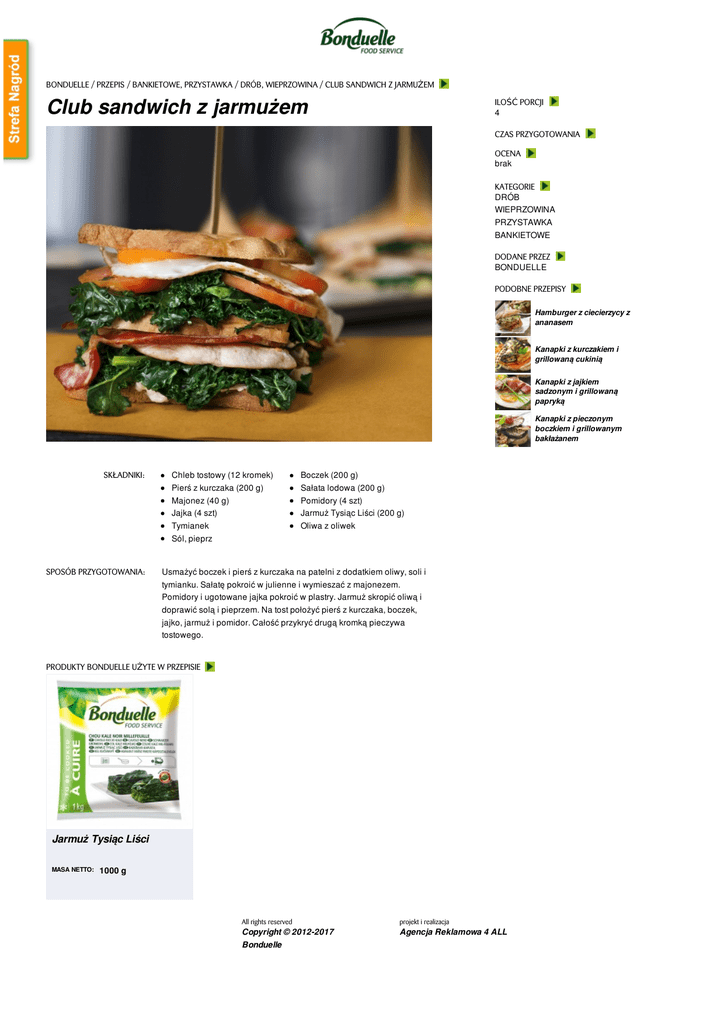 BONDUELLE / PRZEPIS / BANKIETOWE, PRZYSTAWKA / DRÓB, WIEPRZOWINA / CLUB SANDWICH Z JARMUŻEM Club sandwich z jarmużem ILOŚĆ PORCJI 4 CZAS PRZYGOTOWANIA OCENA brak KATEGORIE DRÓB WIEPRZOWINA PRZYSTAWKA BANKIETOWE DODANE PRZEZ BONDUELLE PODOBNE PRZEPISY Hamburger z ciecierzycy z ananasem Kanapki z kurczakiem i grillowaną cukinią Kanapki z jajkiem sadzonym i grillowaną papryką Kanapki z pieczonym boczkiem i grillowanym bakłażanem SKŁADNIKI: SPOSÓB PRZYGOTOWANIA: Chleb tostowy (12 kromek) Boczek (200 g) Pierś z kurczaka (200 g) Majonez (40 g) Jajka (4 szt) Sałata lodowa (200 g) Pomidory (4 szt) Jarmuż Tysiąc Liści (200 g) Tymianek Sól, pieprz Oliwa z oliwek Usmażyć boczek i pierś z kurczaka na patelni z dodatkiem oliwy, soli i tymianku. Sałatę pokroić w julienne i wymieszać z majonezem. Pomidory i ugotowane jajka pokroić w plastry. Jarmuż skropić oliwą i doprawić solą i pieprzem. Na tost położyć pierś z kurczaka, boczek, jajko, jarmuż i pomidor. Całość przykryć drugą kromką pieczywa tostowego. PRODUKTY BONDUELLE UŻYTE W PRZEPISIE Jarmuż Tysiąc Liści MASA NETTO: 1000 g All rights reserved projekt i realizacja Copyright © 2012-2017 Bonduelle Agencja Reklamowa 4 ALL