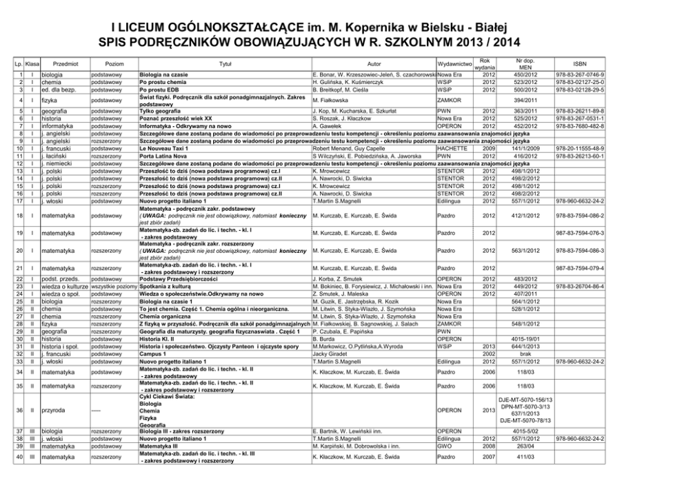I LICEUM OGÓLNOKSZTAŁCĄCE im. M. Kopernika w Bielsku - Białej SPIS PODRĘCZNIKÓW OBOWIĄZUJĄCYCH W R. SZKOLNYM 2013 / 2014 Lp. Klasa 1 2 3 I I I 4 I 5 6 7 8 9 10 11 12 13 14 15 16 17 I I I I I I I I I I I I I 18 I 19 I 20 I 21 I 22 23 24 25 26 27 28 29 30 31 32 33 I I I II II II II II II II II II 34 II 35 II 36 II 37 38 39 III III III 40 III Przedmiot Poziom Tytuł Autor Wydawnictwo Rok wydania 2012 2012 2012 Nr dop. MEN 450/2012 523/2012 500/2012 Biologia na czasie E. Bonar, W. Krzeszowiec-Jeleń, S. czachorowski Nowa Era Po prostu chemia H. Gulińska, K. Kuśmierczyk WSiP Po prostu EDB B. Breitkopf, M. Cieśla WSiP Świat fizyki. Podręcznik dla szkół ponadgimnazjalnych. Zakres podstawowy M. Fiałkowska ZAMKOR 394/2011 fizyka podstawowy podstawowy Tylko geografia J. Kop, M. Kucharska, E. Szkurłat PWN 2012 363/2011 geografia podstawowy Poznać przeszłość wiek XX S. Roszak, J. Kłaczkow Nowa Era 2012 525/2012 historia podstawowy Informatyka - Odkrywamy na nowo A. Gawełek OPERON 2012 452/2012 informatyka podstawowy Szczegółowe dane zostaną podane do wiadomości po przeprowadzeniu testu kompetencji - określeniu poziomu zaawansowania znajomości języka j. angielski rozszerzony Szczegółowe dane zostaną podane do wiadomości po przeprowadzeniu testu kompetencji - określeniu poziomu zaawansowania znajomości języka j. angielski podstawowy Le Nouveau Taxi 1 Robert Menand, Guy Capelle HACHETTE 2009 141/1/2009 j. francuski rozszerzony Porta Latina Nova S Wilczyński, E. Pobiedzińska, A. Jaworska PWN 2012 416/2012 j. łaciński podstawowy Szczegółowe dane zostaną podane do wiadomości po przeprowadzeniu testu kompetencji - określeniu poziomu zaawansowania znajomości języka j. niemiecki podstawowy Przeszłość to dziś (nowa podstawa programowa) cz.I K. Mrowcewicz STENTOR 2012 498/1/2012 j. polski podstawowy Przeszłość to dziś (nowa podstawa programowa) cz.II A. Nawrocki, D. Siwicka STENTOR 2012 498/2/2012 j. polski rozszerzony Przeszłość to dziś (nowa podstawa programowa) cz.I K. Mrowcewicz STENTOR 2012 498/1/2012 j. polski rozszerzony Przeszłość to dziś (nowa podstawa programowa) cz.II A. Nawrocki, D. Siwicka STENTOR 2012 498/2/2012 j. polski podstawowy Nuovo progetto italiano 1 T.Martin S.Magnelli Edilingua 2012 557/1/2012 j. włoski Matematyka - podręcznik zakr. podstawowy podstawowy Pazdro 2012 412/1/2012 matematyka ( UWAGA: podręcznik nie jest obowiązkowy, natomiast konieczny M. Kurczab, E. Kurczab, E. Świda jest zbiór zadań) Matematyka-zb. zadań do lic. i techn. - kl. I podstawowy M. Kurczab, E. Kurczab, E. Świda Pazdro 2012 matematyka - zakres podstawowy Matematyka - podręcznik zakr. rozszerzony rozszerzony Pazdro 2012 563/1/2012 matematyka ( UWAGA: podręcznik nie jest obowiązkowy, natomiast konieczny M. Kurczab, E. Kurczab, E. Świda jest zbiór zadań) Matematyka-zb. zadań do lic. i techn. - kl. I rozszerzony M. Kurczab, E. Kurczab, E. Świda Pazdro 2012 matematyka - zakres podstawowy i rozszerzony podstawowy Podstawy Przedsiębiorczości J. Korba, Z. Smutek OPERON 2012 483/2012 podst. przeds. M. Bokiniec, B. Forysiewicz, J. Michałowski i inn. Nowa Era 2012 449/2012 wiedza o kulturze wszystkie poziomy Spotkania z kulturą podstawowy Wiedza o społeczeństwie.Odkrywamy na nowo Z. Smutek, J. Maleska OPERON 2012 407/2011 wiedza o społ. rozszerzony Biologia na czasie 1 M. Guzik, E. Jastrzębska, R. Kozik Nowa Era 564/1/2012 biologia podstawowy To jest chemia. Część 1. Chemia ogólna i nieorganiczna. M. Litwin, S. Styka-Wlazło, J. Szymońska Nowa Era 528/1/2012 chemia rozszerzony Chemia organiczna M. Litwin, S. Styka-Wlazło, J. Szymońska Nowa Era chemia rozszerzony Z fizyką w przyszłość. Podręcznik dla szkół ponadgimnazjalnych –M.zakres Fiałkowskiej, rozszerzony B. Sagnowskiej, J. Salach ZAMKOR 548/1/2012 fizyka rozszerzony Geografia dla maturzysty. geografia fizycznaswiata . Część 1 P. Czubala, E. Papińska PWN geografia podstawowy Historia Kl. II B. Burda OPERON 4015-19/01 historia podstawowy Historia i społeczeństwo. Ojczysty Panteon i ojczyste spory M.Markowicz, O.Pytlińska,A.Wyroda WSiP 2013 644/1/2013 historia i społ. podstawowy Campus 1 Jacky Giradet 2002 brak j. francuski podstawowy Nuovo progetto italiano 1 T.Martin S.Magnelli Edilingua 2012 557/1/2012 j. włoski Matematyka-zb. zadań do lic. i techn. - kl. II podstawowy K. Kłaczkow, M. Kurczab, E. Świda Pazdro 2006 118/03 matematyka - zakres podstawowy Matematyka-zb. zadań do lic. i techn. - kl. II rozszerzony K. Kłaczkow, M. Kurczab, E. Świda Pazdro 2006 118/03 matematyka - zakres podstawowy i rozszerzony Cykl Ciekawi Świata: DJE-MT-5070-156/13 Biologia DPN-MT-5070-3/13 ----OPERON 2013 przyroda Chemia 637/1/2013 Fizyka DJE-MT-5070-78/13 Geografia rozszerzony Biologia III - zakres rozszerzony E. Bartnik, W. Lewińskii inn. OPERON 4015-5/02 biologia podstawowy Nuovo progetto italiano 1 T.Martin S.Magnelli Edilingua 2012 557/1/2012 j. włoski podstawowy Matematyka III M. Karpiński, M. Dobrowolska i inn. GWO 2008 263/04 matematyka Matematyka-zb. zadań do lic. i techn. - kl. III rozszerzony K. Kłaczkow, M. Kurczab, E. Świda Pazdro 2007 411/03 matematyka - zakres podstawowy i rozszerzony biologia chemia ed. dla bezp. podstawowy podstawowy podstawowy ISBN 978-83-267-0746-9 978-83-02127-25-0 978-83-02128-29-5 978-83-26211-89-8 978-83-267-0531-1 978-83-7680-482-8 978-20-11555-48-9 978-83-26213-60-1 978-960-6632-24-2 978-83-7594-086-2 987-83-7594-076-3 978-83-7594-086-3 987-83-7594-079-4 978-83-26704-86-4 978-960-6632-24-2 978-960-6632-24-2