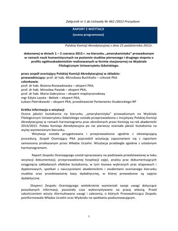 Załącznik nr 1 do Uchwały Nr 462 /2012 Prezydium RAPORT Z WIZYTACJI (ocena programowa) Polskiej Komisji Akredytacyjnej z dnia 25 października 2012r. dokonanej w dniach 1 – 2 czerwca 2015 r. na kierunku „amerykanistyka” prowadzonym w ramach nauk humanistycznych na poziomie studiów pierwszego i drugiego stopnia o profilu ogólnoakademickim realizowanych w formie stacjonarnej na Wydziale Filologicznym Uniwersytetu Gdańskiego. przez zespół oceniający Polskiej Komisji Akredytacyjnej w składzie: przewodniczący: prof. dr hab. Mirosława Buchholtz – członek PKA członkowie: prof. dr hab. Bożena Rozwadowska – ekspert PKA, prof. dr hab. Mirosław Pawlak – ekspert PKA, prof. dr hab. Maria Gabryśova – ekspert międzynarodowy mgr Edyta Lasota - Bełżek – ekspert PKA, Łukasz Pietrzkowski – ekspert PKA, przedstawiciel Parlamentu Studenckiego RP Krótka informacja o wizytacji Ocena jakości kształcenia na kierunku „amerykanistyka” prowadzonym na Wydziale Filologicznym Uniwersytetu Gdańskiego została przeprowadzona z inicjatywy Polskiej Komisji Akredytacyjnej w ramach harmonogramu prac określonych przez Komisję na rok akademicki 2014/2015. Polska Komisja Akredytacyjna po raz pierwszy oceniała jakość kształcenia na wyżej wymienionym kierunku. Wizytacja została przygotowana i przeprowadzona zgodnie z obowiązującą procedurą. Zespół Oceniający PKA poprzedził wizytację zapoznaniem się z raportem samooceny przekazanym przez Władze Uczelni. Wizytacja przebiegła zgodnie z ustalonym harmonogramem. Raport Zespołu Oceniającego został opracowany na podstawie przedstawionej w toku wizytacji dokumentacji, przeprowadzonej hospitacji zajęć, analizy prac dokumentujących osiągnięcia zakładanych efektów kształcenia, w tym losowo wybranych prac etapowych i dyplomowych, spotkań z nauczycielami akademickimi i studentami ocenianego kierunku studiów oraz przedstawionej bazy dydaktycznej, w której prowadzone są zajęcia dydaktyczne. Eksperci Zespołu Oceniającego wielokrotnie wymieniali swoje uwagi dotyczące pozyskanych informacji, pozostały czas wykorzystywano na pracę własną. Przed zakończeniem wizyty sformułowano uwagi i zalecenia, o których Przewodnicząca Zespołu poinformowała Władze Uczelni oraz Wydziału na spotkaniu podsumowującym. 1 Załącznik nr 1 Podstawa prawna wizytacji Załącznik nr 2 Szczegółowy harmonogram przeprowadzonej wizytacji uwzględniający podział zadań pomiędzy członków zespołu oceniającego. 1. Koncepcja rozwoju ocenianego kierunku sformułowana przez jednostkę1 1) Koncepcja kształcenia nawiązuje do misji Uczelni oraz odpowiada celom określonym w strategii jednostki, Strategia Rozwoju Uniwersytetu Gdańskiego została przyjęta Uchwałą Senatu Uniwersytetu Gdańskiego nr 25S/10 z dnia 25 lutego 2010 roku (z późn. zm.). Strategia ta została opracowana na czas do roku 2020. Za formułowanie koncepcji kształcenia na ocenianym kierunku odpowiada Rada Wydziału, która współpracuje z Radą Instytutu, Radą Programową dla kierunku oraz Wydziałowym Zespołem ds. Zapewniania Jakości Kształcenia. Kształcenie na kierunku amerykanistyka odbywa się na studiach stacjonarnych pierwszego i drugiego stopnia o profilu ogólnoakademickim. Zgodnie z informacją zawartą w Raporcie samooceny, celem kształcenia na tym kierunku „jest uzyskanie zaawansowanych kompetencji językowych w zakresie języka angielskiego, kultury i literatury USA” (str. 2). Czytamy tam dalej, że zdobycie tego typu kompetencji ma stworzyć absolwentom możliwość zatrudnienia między innymi w środkach masowego przekazu, wydawnictwach, instytucjach edukacyjnych, firmach amerykańskich w Polsce, w obsłudze ruchu turystycznego, w izbach gospodarczych, w biurach tłumaczeń, we własnych firmach tłumaczeniowych i doradczych, w dyplomacji itp. Absolwenci kierunku mają być wysokiej klasy specjalistami w zakresie literatury, kultury, mediów, jak również wiedzy o społeczeństwie i historii USA, prezentując poziom opanowania języka angielskiego B2, przy czym w przypadku studiów drugiego stopnia są w stanie wykonywać zadania w tych obszarach charakteryzujące się wyższym stopniem złożoności. Tak zarysowana koncepcja kształcenia wpisuje się w misję i strategię Uczelni, przyjętą uchwałą Senatu Uniwersytetu Gdańskiego nr 25S/10 z dnia 25 lutego 2010 roku w sprawie Strategii Rozwoju Uniwersytetu Gdańskiego do roku 2020, z późniejszymi uzupełnieniami i zmianami, jak również w Strategię Rozwoju Wydziału Filologicznego na kadencję 2012-2016, określoną uchwałą Rady Wydziału z dnia 7 marca 2013 roku. Na str. 2 ww. uchwały Senatu Uniwersytetu Gdańskiego można przeczytać w odniesieniu do misji Uczelni, że „Posłannictwem Uniwersytetu jest kształcenie cenionych absolwentów wyposażonych we wszechstronną wiedzę, umiejętności i kompetencje niezbędne w życiu gospodarczospołecznym opartym na wiedzy oraz wnoszenie trwałego wkładu w naukowe poznanie świata i rozwiązywanie jego istotnych współczesnych problemów”. Z kolei na str. 3 w punkcie Kształcenie akademickie na światowym poziomie czytamy, że „Uniwersytet Gdański będzie troszczył się o wysoki poziom kwalifikacji absolwentów i ich dobre przygotowanie do kariery zawodowej w integrującej się Europie. Podnoszenie poziomu i jakości kształcenia będzie realizowane poprzez nieustanne aktualizowanie przekazywanej wiedzy w ślad za najnowszymi osiągnięciami nauki i transformacją systemów społecznych, uelastycznienie procesu kształcenia w kontekście zarówno doboru zakresu wiedzy, jak i form jej przekazywania”. W drugiej części strategii rozwoju Wydziału Filologicznego, zatytułowanej Dydaktyka i studenci, zapisano natomiast m. in. takie cele, jak: „dostosowywanie oferty 1 Punkty 1 – 8 wraz z podpunktami odpowiadają kryteriom określonym w statucie Polskiej Komisji Akredytacyjnej. 2 kształcenia do potrzeb rynku prz