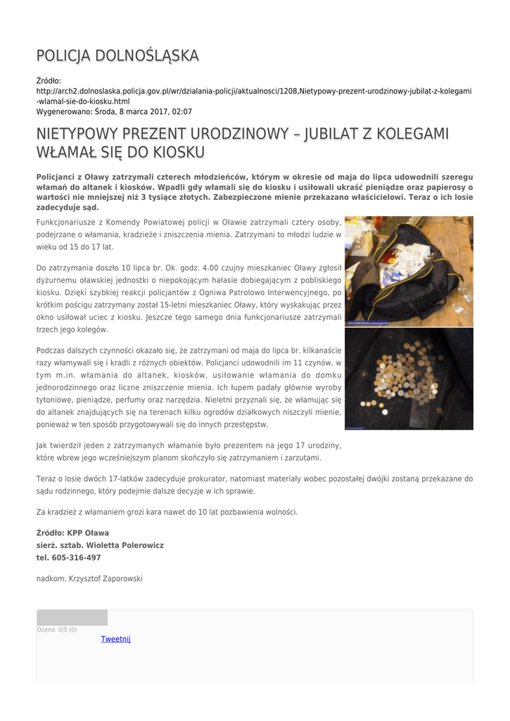 POLICJA DOLNOŚLĄSKA Źródło: http://arch2.dolnoslaska.policja.gov.pl/wr/dzialania-policji/aktualnosci/1208,Nietypowy-prezent-urodzinowy-jubilat-z-kolegami -wlamal-sie-do-kiosku.html Wygenerowano: Środa, 8 marca 2017, 02:07 NIETYPOWY PREZENT URODZINOWY – JUBILAT Z KOLEGAMI WŁAMAŁ SIĘ DO KIOSKU Policjanci z Oławy zatrzymali czterech młodzieńców, którym w okresie od maja do lipca udowodnili szeregu włamań do altanek i kiosków. Wpadli gdy włamali się do kiosku i usiłowali ukraść pieniądze oraz papierosy o wartości nie mniejszej niż 3 tysiące złotych. Zabezpieczone mienie przekazano właścicielowi. Teraz o ich losie zadecyduje sąd. Funkcjonariusze z Komendy Powiatowej policji w Oławie zatrzymali cztery osoby, podejrzane o włamania, kradzieże i zniszczenia mienia. Zatrzymani to młodzi ludzie w wieku od 15 do 17 lat. Do zatrzymania doszło 10 lipca br. Ok. godz. 4.00 czujny mieszkaniec Oławy zgłosił dyżurnemu oławskiej jednostki o niepokojącym hałasie dobiegającym z pobliskiego kiosku. Dzięki szybkiej reakcji policjantów z Ogniwa Patrolowo Interwencyjnego, po krótkim pościgu zatrzymany został 15-letni mieszkaniec Oławy, który wyskakując przez okno usiłował uciec z kiosku. Jeszcze tego samego dnia funkcjonariusze zatrzymali trzech jego kolegów. Podczas dalszych czynności okazało się, że zatrzymani od maja do lipca br. kilkanaście razy włamywali się i kradli z różnych obiektów. Policjanci udowodnili im 11 czynów, w tym m.in. włamania do altanek, kiosków, usiłowanie włamania do domku jednorodzinnego oraz liczne zniszczenie mienia. Ich łupem padały głównie wyroby tytoniowe, pieniądze, perfumy oraz narzędzia. Nieletni przyznali się, że włamując się do altanek znajdujących się na terenach kilku ogrodów działkowych niszczyli mienie, ponieważ w ten sposób przygotowywali się do innych przestępstw. Jak twierdził jeden z zatrzymanych włamanie było prezentem na jego 17 urodziny, które wbrew jego wcześniejszym planom skończyło się zatrzymaniem i zarzutami. Teraz o losie dwóch 17-latków zadecyduje prokurator, natomiast materiały wobec pozostałej dwójki zostaną przekazane do sądu rodzinnego, który podejmie dalsze decyzje w ich sprawie. Za kradzież z włamaniem grozi kara nawet do 10 lat pozbawienia wolności. Źródło: KPP Oława sierż. sztab. Wioletta Polerowicz tel. 605-316-497 nadkom. Krzysztof Zaporowski Ocena: 0/5 (0) Tweetnij