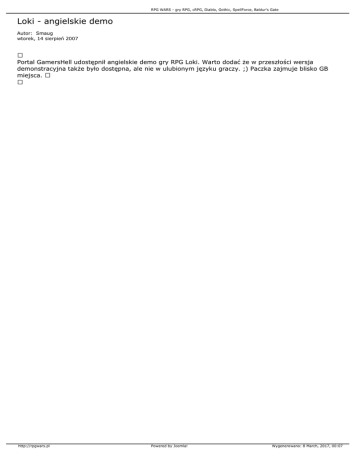 RPG WARS - gry RPG, cRPG, Diablo, Gothic, SpellForce, Baldur's Gate Loki - angielskie demo Autor: Smaug wtorek, 14 sierpień 2007 Portal GamersHell udostępnił angielskie demo gry RPG Loki. Warto dodać że w przeszłości wersja demonstracyjna także było dostępna, ale nie w ulubionym języku graczy. ;) Paczka zajmuje blisko GB miejsca. http://rpgwars.pl Powered by Joomla! Wygenerowano: 8 March, 2017, 00:07