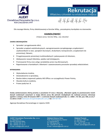 Dla naszego klienta, firmy zlokalizowanej w Gorzów Wlkp., poszukujemy kandydata na stanowisko HANDLOWIEC /miejsce pracy: Gorzów Wlkp., woj. lubuskie/ ZAKRES OBOWIĄZKÓW: • Sprzedaż i przygotowanie ofert, • Sprzedaż urządzeń wielofunkcyjnych, oprogramowania zarządzającego urządzeniami i użytkownikami w sieci, sprzętem biurowym, drukarkami, komputerami, urządzeniami do prezentacji, faksami, • Przygotowywanie prezentacji multimedialnych i pokazywanie ich klientom, • Zdobywanie nowych klientów, opieka nad istniejącymi, • Promowanie firmy oraz usług i produktów przez nią oferowanych, Raportowanie o kontaktach z klientami i zaawansowaniu procesów sprzedaży właścicielowi. • WYMAGANIA: • • • • • Wykształcenie średnie, Doświadczenie w sprzedaży, Bardzo dobra znajomość pakietu MS Office a w szczególności Power Pointa, Wysoka kultura osobista, Prawo jazdy kat. B. Osoby zainteresowane ofertą prosimy o przesłanie CV wraz z klauzulą: „Wyrażam zgodę na przetwarzanie moich danych osobowych zawartych w mojej ofercie pracy dla potrzeb niezbędnych do realizacji procesu rekrutacji zgodnie z ustawą z dnia 29 sierpnia 1997 r. o ochronie danych osobowych (Dz. U. z 2002 r. Nr 101, poz. 926, ze zm.)” na adres e-mail: [email protected] tel. 509 567 987. Agencja Doradztwa Personalnego nr rejestru 5335
