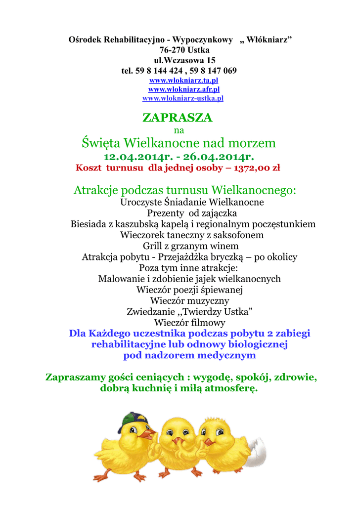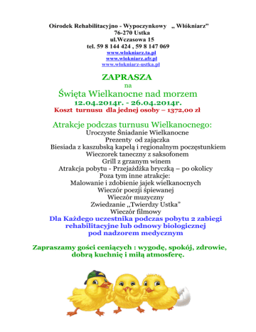 Ośrodek Rehabilitacyjno - Wypoczynkowy ,, Włókniarz” 76-270 Ustka ul.Wczasowa 15 tel. 59 8 144 424 , 59 8 147 069 www.wlokniarz.ta.pl www.wlokniarz.afr.pl www.wlokniarz-ustka.pl ZAPRASZA na Święta Wielkanocne nad morzem 12.04.2014r. - 26.04.2014r. Koszt turnusu dla jednej osoby – 1372,00 zł Atrakcje podczas turnusu Wielkanocnego: Uroczyste Śniadanie Wielkanocne Prezenty od zajączka Biesiada z kaszubską kapelą i regionalnym poczęstunkiem Wieczorek taneczny z saksofonem Grill z grzanym winem Atrakcja pobytu - Przejażdżka bryczką – po okolicy Poza tym inne atrakcje: Malowanie i zdobienie jajek wielkanocnych Wieczór poezji śpiewanej Wieczór muzyczny Zwiedzanie ,,Twierdzy Ustka” Wieczór filmowy Dla Każdego uczestnika podczas pobytu 2 zabiegi rehabilitacyjne lub odnowy biologicznej pod nadzorem medycznym Zapraszamy gości ceniących : wygodę, spokój, zdrowie, dobrą kuchnię i miłą atmosferę.