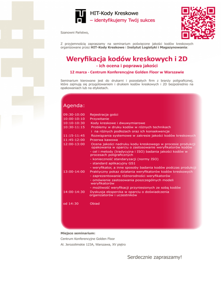 Szanowni Państwo, Z przyjemnością zapraszamy na seminarium poświęcone jakości kodów kreskowych organizowane przez HIT-Kody Kreskowe i Instytut Logistyki i Magazynowania: Weryfikacja kodów kreskowych i 2D - ich ocena i poprawa jakości 12 marca - Centrum Konferencyjne Golden Floor w Warszawie Seminarium kierowane jest do drukarni i pozostałych firm z branży poligraficznej, które zajmują się przygotowaniem i drukiem kodów kreskowych i 2D bezpośrednio na opakowaniach lub na etykietach. Agenda: 09:30-10:00 Rejestracja gości 10:00-10:10 Przywitanie 10:10-10:30 Kody kreskowe i dwuwymiarowe 10:30-11:15 Problemy w druku kodów w różnych technikach i na różnych podłożach oraz ich konsekwencje 11:15-11:45 Rozwiązania systemowe w zakresie jakości kodów kreskowych 11:45-12:00 Przerwa kawowa 12:00-13:00 Ocena jakości nadruku kodu kreskowego w procesie produkcji opakowania w oparciu o zastosowanie weryfikatorów kodów - cel i metody (tradycyjna i ISO) badania jakości kodów w procesach poligraficznych - konieczność standaryzacji (normy ISO) - standard aplikacyjny GS1 - weryfikator, a inne sposoby badania kodów podczas produkcji 13:00-14:00 Praktyczny pokaz działania weryfikatorów kodów kreskowych - zaprezentowanie różnorodności weryfikatorów - omówienie zastosowania poszczególnych modeli weryfikatorów - możliwość weryfikacji przyniesionych ze sobą kodów 14:00-14:30 Dyskusja ekspercka w oparciu o doświadczenia organizatorów i uczestników od 14:30 Obiad Miejsce seminarium: Centrum Konferencyjne Golden Floor Al. Jerozolimskie 123A, Warszawa, XV piętro Serdecznie zapraszamy!