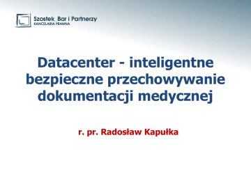 Datacenter - inteligentne bezpieczne przechowywanie dokumentacji medycznej r. pr. Radosław Kapułka Kluczowe daty: 31 lipca 2017 r. - koniec możliwości prowadzenia dokumentacji medycznej w formie papierowej [art. 56 ust. 1 Ustawy z dnia 28 kwietnia 2011 r. o systemie informacji w ochronie zdrowia (Dz. U. Nr 113, poz. 657 z późn. zm.)]. 1 sierpnia 2017 r. - wejście w życie art. 11 Ustawy z dnia 28 kwietnia 2011 r. o systemie informacji w ochronie zdrowia (Dz. U. Nr 113, poz. 657 z późn. zm.) - dokumentacja medyczna od tej pory może być prowadzona wyłącznie w formie elektronicznej. Podstawa prawna: Ustawa z dnia 28 kwietnia 2011 r. o systemie informacji w ochronie zdrowia (Dz. U. Nr 113, poz. 657 z późn. zm.), dalej jako Ustawa. Rozporządzenie Ministra Zdrowia z dnia 21 grudnia 2010 r. w sprawie rodzajów i zakresu dokumentacji medycznej oraz sposobu jej przetwarzania (Tekst jednolity Dz. U. z 2014 r. poz. 177 z późn. zm.), dalej jako Rozporządzenie. Czym jest Elektroniczna Dokumentacja Medyczna? Definicja w art. 2 pkt 6 Ustawy: a. dokument elektroniczny umożliwiający usługobiorcy uzyskanie świadczenia opieki zdrowotnej określonego rodzaju, w przypadku usługodawcy będącego świadczeniodawcą, o którym mowa w art. 5 pkt 41 lit. d ustawy z dnia 27 sierpnia 2004 r. o świadczeniach opieki zdrowotnej finansowanych ze środków publicznych (Dz. U. z 2008 r. Nr 164, poz. 1027, z późn. zm.), apteką ogólnodostępną lub punktem aptecznym; b. dokumentacja medyczna, o której mowa w ustawie z dnia 6 listopada 2008 r. o prawach pacjenta i Rzeczniku Praw Pacjenta (Dz. U. z 2009 r. Nr 52, poz. 417 i Nr 76, poz. 641, z 2010 r. Nr 96, poz. 620), wytworzoną w postaci elektronicznej, zawierającą dane o udzielonych, udzielanych i planowanych świadczeniach opieki zdrowotnej, w tym dokument elektroniczny umożliwiający usługobiorcy uzyskanie świadczenia opieki zdrowotnej określonego rodzaju, w przypadku usługodawcy innego niż wymieniony w lit. a. Kogo dotyczy obowiązek Dokumentacji Medycznej? prowadzenia Elektronicznej świadczeniodawców w rozumieniu art. 5 pkt 41 ustawy z dnia 27 sierpnia 2004 r. o świadczeniach opieki zdrowotnej finansowanych ze środków publicznych; aptek ogólnodostępnych’ punktów aptecznych [art. 2 pkt 15 Ustawy] Świadczeniodawca: a. podmiot wykonujący działalność leczniczą w rozumieniu przepisów o działalności leczniczej, b. osoba fizyczna inna niż wymieniona w lit. a, która uzyskała fachowe uprawnienia do udzielania świadczeń zdrowotnych i udziela ich w ramach wykonywanej działalności gospodarczej, c. podmiot realizujący czynności z zakresu zaopatrzenia w środki pomocnicze i wyroby medyczne będące przedmiotami ortopedycznymi. Struktura Rozporządzenia: • przepisy wspólne dla dokumentacji medycznej prowadzonej w formie papierowej i elektronicznej; • przepisy odrębne dla dokumentacji medycznej prowadzonej w formie elektronicznej. Kluczowe przepisy odrębne Rozporządzenia I: Paragraf 10 ust. 2 Rozporządzenia – podpis elektroniczny. Paragraf 80 Rozporządzenia – określenie wymogów bezpieczeństwa systemu teleinformatycznego. System teleinformatyczny musi zapewniać: a. zabezpieczenie dokumentacji przed uszkodzeniem lub utratą; b. zachowanie integralności i wiarygodności dokumentacji; c. stały dostęp do dokumentacji dla osób uprawnionych oraz zabezpieczenie przed dostępem osób nieuprawnionych; d. identyfikację osoby dokonującej wpisu oraz osoby udzielającej świadczeń zdrowotnych i dokonywanych przez te osoby zmian, w szczególności dla odpowiednich rodzajów dokumentacji przyporządkowanie cech informacyjnych, zgodnie z § 10 ust. 2 Rozporządzenia; e. udostępnienie, w tym przez eksport w postaci elektronicznej dokumentacji albo części dokumentacji będącej formą dokumentacji określonej w rozporządzeniu, w formacie XML i PDF; f. eksport całości danych w formacie XML, w sposób zapewniający możliwość odtworzenia tej dokumentacji w innym systemie teleinformatycznym; g. wydrukowanie dokumentacji w formach określonych w rozporządzeniu. Kluczowe przepisy odrębne Rozporządzenia II: Paragraf 81 Rozporządzenia – obowiązek umieszczenia w systemie teleinformatycznym odwzorowania cyfrowego innej dokumentacji (zdjęcia radiologiczne, dokumentacja w formie papierowej). Po odwzorowaniu dokumentację należy wydać pacjentowi lub zniszczyć. Paragraf 82 Rozporządzenia – obowiązek zastosowania odpowiednich do ilości danych i zastosowanej technologii rozwiązań technicznych zapewniających przechowywanie, używalność i wiarygodność dokumentacji znajdującej się w systemie informatycznym co najmniej do upływu okresu przechowywania dokumentacji. Paragraf 83 Rozporządzenia – zasady udostępniania elektronicznej dokumentacji medycznej (obowiązek zachowania integralności dokumentacji i ochrony danych osobowych): a. przekazanie informatycznego nośnika danych z zapisaną dokumentacją; b. dokonanie elektronicznej transmisji dokumentacji; c. przekazanie papierowych wydruków – wyłącznie na żądanie uprawnionych podmiotów lub organów. Kwestie techniczne: W przypadku przeniesienia dokumentacji do innego systemu teleinformatycznego, do przeniesionej dokumentacji przyporządkowuje się datę przeniesienia oraz informację, z jakiego systemu została przeniesiona [Paragraf 84 Rozporządzenia]. Dokumentację prowadzoną w postaci elektronicznej sporządza się z uwzględnieniem postanowień Polskich Norm, których przedmiotem są zasady gromadzenia i wymiany informacji w ochronie zdrowia, przenoszących normy europejskie lub normy innych państw członkowskich Europejskiego Obszaru Gospodarczego przenoszące te normy [Paragraf 85 ust. 1 Rozporządzenia]. W przypadku braku Polskich Norm przenoszących normy europejskie lub normy innych państw członkowskich Europejskiego Obszaru Gospodarczego przenoszące te normy uwzględnia się: a. normy międzynarodowe; b. Polskie Normy; c. 
