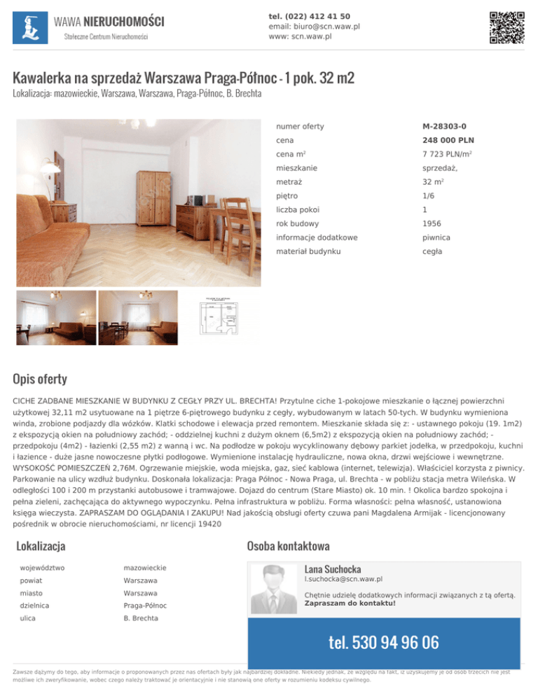 tel. (022) 412 41 50 email: [email protected] www: scn.waw.pl Kawalerka na sprzedaż Warszawa Praga-Północ - 1 pok. 32 m2 Lokalizacja: mazowieckie, Warszawa, Warszawa, Praga-Północ, B. Brechta numer oferty M-28303-0 cena 248 000 PLN cena m 7 723 PLN/m2 mieszkanie sprzedaż, metraż 32 m2 piętro 1/6 liczba pokoi 1 rok budowy 1956 informacje dodatkowe piwnica materiał budynku cegła 2 Opis oferty CICHE ZADBANE MIESZKANIE W BUDYNKU Z CEGŁY PRZY UL. BRECHTA! Przytulne ciche 1-pokojowe mieszkanie o łącznej powierzchni użytkowej 32,11 m2 usytuowane na 1 piętrze 6-piętrowego budynku z cegły, wybudowanym w latach 50-tych. W budynku wymieniona winda, zrobione podjazdy dla wózków. Klatki schodowe i elewacja przed remontem. Mieszkanie składa się z: - ustawnego pokoju (19. 1m2) z ekspozycją okien na południowy zachód; - oddzielnej kuchni z dużym oknem (6,5m2) z ekspozycją okien na południowy zachód; przedpokoju (4m2) - łazienki (2,55 m2) z wanną i wc. Na podłodze w pokoju wycyklinowany dębowy parkiet jodełka, w przedpokoju, kuchni i łazience - duże jasne nowoczesne płytki podłogowe. Wymienione instalację hydrauliczne, nowa okna, drzwi wejściowe i wewnętrzne. WYSOKOŚĆ POMIESZCZEŃ 2,76M. Ogrzewanie miejskie, woda miejska, gaz, sieć kablowa (internet, telewizja). Właściciel korzysta z piwnicy. Parkowanie na ulicy wzdłuż budynku. Doskonała lokalizacja: Praga Północ - Nowa Praga, ul. Brechta - w pobliżu stacja metra Wileńska. W odległości 100 i 200 m przystanki autobusowe i tramwajowe. Dojazd do centrum (Stare Miasto) ok. 10 min. ! Okolica bardzo spokojna i pełna zieleni, zachęcająca do aktywnego wypoczynku. Pełna infrastruktura w pobliżu. Forma własności: pełna własność, ustanowiona księga wieczysta. ZAPRASZAM DO OGLĄDANIA I ZAKUPU! Nad jakością obsługi oferty czuwa pani Magdalena Armijak - licencjonowany pośrednik w obrocie nieruchomościami, nr licencji 19420 Lokalizacja Osoba kontaktowa Lana Suchocka województwo mazowieckie powiat Warszawa [email protected] miasto Warszawa dzielnica Praga-Północ Chętnie udzielę dodatkowych informacji związanych z tą ofertą. Zapraszam do kontaktu! ulica B. Brechta tel. 530 94 96 06 Zawsze dążymy do tego, aby informacje o proponowanych przez nas ofertach były jak najbardziej dokładne. Niekiedy jednak, ze względu na fakt, iż uzyskujemy je od osób trzecich nie jest możliwe ich zweryfikowanie, wobec czego należy traktować je orientacyjnie i nie stanowią one oferty w rozumieniu kodeksu cywilnego.