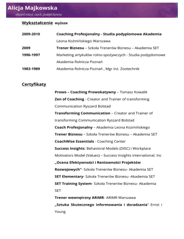 Wykształcenie wyższe 2009-2010 Coaching Profesjonalny - Studia podyplomowe Akademia Leona Koźmińskiego Warszawa 2009 Trener Biznesu – Szkoła Trenerów Biznesu – Akademia SET 1996-1997 Marketing artykułów rolno-spożywczych - Studia podyplomowe Akademia Rolnicza Poznań 1983-1989 Akademia Rolnicza Poznań , Mgr inż. Zootechnik Certyfikaty Prowo – Coaching Prowokatywny – Tomasz Kowalik Zen of Coaching - Creator and Trainer of transforming Communication Ryszard Bolstad Transforming Communication – Creator and Trainer of transforming Communication Ryszard Bolstad Coach Profesjonalny – Akademia Leona Kozmińskiego Trener Biznesu – Szkoła Trenerów Biznesu – Akademia SET CoachWise Essentials - Coaching Center Success Insights: Behavioral Models (DISC) i Workplace Motivators Model (Values) – Success Insights international. Inc „Ocena Efektywności i Rentowności Projektów Rozwojowych”- Szkoła Trenerów Biznesu- Akademia SET SET Elementary- Szkoła Trenerów Biznesu -Akademia SET SET Training System- Szkoła Trenerów Biznesu- Akademia SET Trener wewnętrzny ARiMR- ARiMR Warszawa „Sztuka Skutecznego informowania i doradzania” Ernst i Young