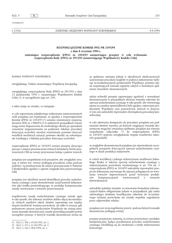 02/t. 5 PL Dziennik Urzędowy Unii Europejskiej 253 31994R2193 L 235/6 DZIENNIK URZĘDOWY WSPÓLNOT EUROPEJSKICH 9.9.1994 ROZPORZĄDZENIE KOMISJI (WE) NR 2193/94 z dnia 8 września 1994 r. zmieniające rozporządzenie (EWG) nr 2454/93 ustanawiające przepisy w celu wykonania rozporządzenia Rady (EWG) nr 2913/92 ustanawiającego Wspólnotowy Kodeks Celny KOMISJA WSPÓLNOT EUROPEJSKICH, uwzględniając Traktat ustanawiający Wspólnotę Europejską, uwzględniając rozporządzenie Rady (EWG) nr 2913/92 z dnia 12 października 1992 r. ustanawiające Wspólnotowy Kodeks Celny (1), w szczególności jego art. 249, a także mając na uwadze, co następuje: w celu zapewnienia jednakowego traktowania zainteresowanych osób pożądane jest wyjaśnienie, że zgodnie z rozporządzeniem Komisji (EWG) nr 2454/93 (2) ostatnio zmienionym rozporządzeniem (WE) nr 1500/94 (3) w niektórych przypadkach towary mogą zostać dopuszczone do swobodnego obrotu po uprzednim czasowym magazynowaniu na podstawie lokalnej procedury dotyczącej zezwoleń; wyraźne rozróżnienie powinno dotyczyć wszelkich możliwych sytuacji; powinno określić się zobowiązania wynikające z lokalnej procedury dotyczącej zezwoleń; za spełnione; niemniej jednak w określonych okolicznościach zastosowanie procedury mogłoby w praktyce niekorzystnie wpłynąć na konkurencyjność producentów Wspólnoty, pomimo opinii rozpatrujących wniosek organów celnych o formalnym spełnieniu warunków ekonomicznych; należy uchwalić przepisy zapewniające zgodność z warunkami ekonomicznymi w przypadkach złożenia wniosku odnośnie do operacji uszlachetniania czynnego w taki sposób, aby równowaga oparta na zasadzie sprawiedliwości była zgodna z interesami producentów Wspólnoty oraz przetwórców, których to dotyczy; w tym celu należałoby wprowadzić obowiązkową procedurę konsultacyjną; w celu ułatwienia dostępności do procedury pożądane jest podniesienie limitów wartości, po których osiągnięciu warunki ekonomiczne mogą być uważaneza spełnione; pożądane jest również uzupełnienie załącznika 75 do rozporządzenia (EWG) nr 2454/93 poprzez uwzględnienie stopnia wrażliwości sektorów gospodarki; rozporządzenie (EWG) nr 2454/93 zawiera przepisy dotyczące pieczęci i miejsca przeznaczenia różnych formularzy listów przewozowych CIM na towary przywożone koleją z państw trzecich; ze względów ekonomicznych pożądane jest wprowadzenie szczególnych przepisów dotyczących operacji uszlachetniania czynnego w dziale produkcji makaronów; pożądane jest uzupełnienie tych przepisów, aby uwzględnić sytuację, w której ww. towary podlegają procedurze celnej podczas podróży i są przekazywane do miejsca przeznaczenia w Państwie Członkowskim zgodnie z opisem oryginału listu przewozowego CIM; w celach weryfikacji i pełnego wykorzystania możliwości Jednolitego Rynku w zakresie operacji uszlachetniania czynnego z wykorzystaniem pozwolenia wymienionego w art. 556 ust. 2 rozporządzenia (EWG) nr 2454/93 należałoby wprowadzić przepis do dokumentu używanego do operacji polegających na wwożeniu towarów importowanych przed wywozem produktów kompensacyjnych wytworzonych z towarów ekwiwalentnych; pożądane jest określenie metod identyfikacji procedur uszlachetniania czynnego i jasne sformułowanie zasad kontroli dokumentów jako środka potwierdzającego, że produkty kompensacyjne zostały wytworzone z towarów przywożonych; wspólnotowe zasady uszlachetniania czynnego zostały ujęte w taki sposób, aby dokonać możliwie daleko idącej decentralizacji różnych aspektów takich działań; zapewniają one między innymi możliwość wydania pozwolenia, ale tylko w sytuacji, gdy podstawowe interesy producentów Wspólnoty nie zostają naruszone (warunki ekonomiczne); zasady przewidują ponadto pewne szczególne sytuacje, w których warunki ekonomiczne uważa się (1) Dz.U. L 302 z 19.10.1992, str. 1. (2) Dz.U. L 253 z 11.10.1993, str. 1. (3) Dz.U. L 162 z 30.6.1994, str. 1. należałoby jednakże wyjaśnić, że stosowanie formularzy informacyjnych będzie obligatoryjne jedynie w przypadkach, gdy żadne zadowalające działania weryfikacyjne odnośnie do wcześniejszego wydania pozwolenia nie zostały wspólnie uzgodnione przez odpowiednie władze; pożądane jest wyszczególnienie przerw, podczas których warunki ekonomiczne podlegają rewizji; przepisy przejściowe stanowią, że towary przywożone i produkty kompensacyjne, będące przedmiotem procedur uszlachetniania czynnego, kwalifikują się do zwolnienia z tytułu wykorzystania końcowego; 254 PL Dziennik Urzędowy Unii Europejskiej właściwości towarów lub produktów z sektora lotnictwa cywilnego podlegające procedurom uszlachetniania czynnego, ilość przesyłek, rzeczywiste uproszczenia z tytułu innych procedur przywozowych oraz przyczyn ekonomicznych wynikających z konkurencji międzynarodowej w tym sektorze wymagają obniżenia kosztów administracyjnych ponoszonych przez osoby prowadzące działalność gospodarczą we Wspólnocie, stosujące procedury uszlachetniania czynnego, gwarantując, jednocześnie, że uproszczenie nie spowoduje wzrostu nadużyć oraz nieprawidłowości; z przyczyn praktycznych zakończenie procedury uszlachetniania czynnego powinno zostać uproszczone z zastrzeżeniem określonych warunków; z tego względu można wprowadzić przepis odnośnie do zakończenia procedury uszlachetniania czynnego w przypadku, gdy towary lub produkty, o których mowa, zostały użyte po raz pierwszy, pod warunkiem że przechowywane dokumenty handlowe pozwalają na wiarygodną weryfikację wniosku i prawidłowe przeprowadzenie procedury; 02/t. 5 pożądana jest ze względów praktycznych zmiana wzorów wniosków o pozwolenie i zastosowanie procedury uszlachetniania czynnego; powinno przyjąć się określone standardowe współczynniki produktywności w rezultacie ulepszeń technicznych w celu dopasowania ich do wsp