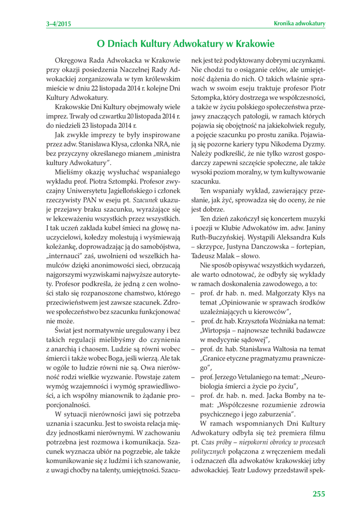 Kronika adwokatury 3–4/2015 O Dniach Kultury Adwokatury w Krakowie Okręgowa Rada Adwokacka w Krakowie przy okazji posiedzenia Naczelnej Rady Adwokackiej zorganizowała w tym królewskim mieście w dniu 22 listopada 2014 r. kolejne Dni Kultury Adwokatury. Krakowskie Dni Kultury obejmowały wiele imprez. Trwały od czwartku 20 listopada 2014 r. do niedzieli 23 listopada 2014 r. Jak zwykle imprezy te były inspirowane przez adw. Stanisława Kłysa, członka NRA, nie bez przyczyny określanego mianem „ministra kultury Adwokatury”. Mieliśmy okazję wysłuchać wspaniałego wykładu prof. Piotra Sztompki. Profesor zwyczajny Uniwersytetu Jagiellońskiego i członek rzeczywisty PAN w eseju pt. Szacunek ukazuje przejawy braku szacunku, wyrażające się w lekceważeniu wszystkich przez wszystkich. I tak uczeń zakłada kubeł śmieci na głowę nauczycielowi, koledzy molestują i wyśmiewają koleżankę, doprowadzając ją do samobójstwa, „internauci” zaś, uwolnieni od wszelkich hamulców dzięki anonimowości sieci, obrzucają najgorszymi wyzwiskami najwyższe autorytety. Profesor podkreśla, że jedną z cen wolności stało się rozpanoszone chamstwo, którego przeciwieństwem jest zawsze szacunek. Zdrowe społeczeństwo bez szacunku funkcjonować nie może. Świat jest normatywnie uregulowany i bez takich regulacji mielibyśmy do czynienia z anarchią i chaosem. Ludzie są równi wobec śmierci i także wobec Boga, jeśli wierzą. Ale tak w ogóle to ludzie równi nie są. Owa nierówność rodzi wielkie wyzwanie. Powstaje zatem wymóg wzajemności i wymóg sprawiedliwości, a ich wspólny mianownik to żądanie proporcjonalności. W sytuacji nierówności jawi się potrzeba uznania i szacunku. Jest to swoista relacja między jednostkami nierównymi. W zachowaniu potrzebna jest rozmowa i komunikacja. Szacunek wyznacza ubiór na pogrzebie, ale także komunikowanie się z ludźmi i ich szanowanie, z uwagi choćby na talenty, umiejętności. Szacu- nek jest też podyktowany dobrymi uczynkami. Nie chodzi tu o osiąganie celów, ale umiejętność dążenia do nich. O takich właśnie sprawach w swoim eseju traktuje profesor Piotr Sztompka, który dostrzega we współczesności, a także w życiu polskiego społeczeństwa przejawy znaczących patologii, w ramach których pojawia się obojętność na jakiekolwiek reguły, a pojęcie szacunku po prostu zanika. Pojawiają się pozorne kariery typu Nikodema Dyzmy. Należy podkreślić, że nie tylko wzrost gospodarczy zapewni szczęście społeczne, ale także wysoki poziom moralny, w tym kultywowanie szacunku. Ten wspaniały wykład, zawierający przesłanie, jak żyć, sprowadza się do oceny, że nie jest dobrze. Ten dzień zakończył się koncertem muzyki i poezji w Klubie Adwokatów im. adw. Janiny Ruth-Buczyńskiej. Wystąpili Aleksandra Kuls – skrzypce, Justyna Danczowska – fortepian, Tadeusz Malak – słowo. Nie sposób opisywać wszystkich wydarzeń, ale warto odnotować, że odbyły się wykłady w ramach doskonalenia zawodowego, a to: – prof. dr hab. n. med. Małgorzaty Kłys na temat „Opiniowanie w sprawach środków uzależniających u kierowców”, – prof. dr. hab. Krzysztofa Woźniaka na temat: „Wirtopsja – najnowsze techniki badawcze w medycynie sądowej”, – prof. dr. hab. Stanisława Waltosia na temat „Granice etyczne pragmatyzmu prawniczego”, – prof. Jerzego Vetulaniego na temat: „Neurobiologia śmierci a życie po życiu”, – prof. dr. hab. n. med. Jacka Bomby na temat: „Współczesne rozumienie zdrowia psychicznego i jego zaburzenia”. W ramach wspomnianych Dni Kultury Adwokatury odbyła się też premiera filmu pt. Czas próby – niepokorni obrońcy w procesach politycznych połączona z wręczeniem medali i odznaczeń dla adwokatów krakowskiej izby adwokackiej. Teatr Ludowy przedstawił spek- 255 Kronika adwokatury takl pt. Zabójca. Była też okazja do zapoznania się z wystawą malarstwa Olgi Boznańskiej. Na wernisażu zaprezentowano też prace Kazimierza Machowiny. Znamienne i przejmujące było spotkanie z ostatnim klezmerem Galicji mistrzem Leopoldem Kozłowskim. W formule przyjacielskiego spotkania z Gościem Klubu Adwokatów, które poprowadził mec. Stanisław Kłys, poznaliśmy wstrząsające sceny z życia będące udziałem Leopolda Kozłowskiego w obozie pracy w Kurowicach. Dowiedzieliśmy się, że w Przemyślanach, dawnym miasteczku galicyjskim, gdzie urodził się maestro Leopold Kozłowski, w zgodzie żyły różne narody, a to: Polacy, Żydzi, Cyganie i Ukraińcy. Od Leopolda Kozłowskiego dowiedzieliśmy się o miłości do ludzi, do sztuki i wielkim cierpieniu, jakie przeżywali Żydzi w czasie II wojny światowej. Opowieść ta była uzupełniana muzyką w wykonaniu samego maestro. Usłyszeliśmy piękne utwory Bełz, Dla mamy, czy też utwór na cześć tragicznie zmarłego brata. Ostatnia niedziela to znana piosenka o rozstaniu zakochanych, ale w interpretacji Leopolda Kozłowskiego, który grał ten utwór przed egzekucją jeńców, brzmiał przejmująco, bardzo, bardzo dramatycznie. Leopold Kozłowski ukończył lwowskie Konserwatorium w klasie fortepianu, a po wojnie dyrygenturę studiował w Państwowej Wyższej Szkole Muzycznej w Krakowie. Jest też kompozytorem muzyki filmowej m.in. do Austerii czy Listy Schindlera. Mistrz nie tylko mówił, ale udowodnił, że muzyka klezmerska jest swoistą modlitwą, albowiem klezmer nie gra, ale modli się na instrumencie, rozmawia z Bogiem. Leopoldowi Kozłowskiemu muzyka uratowała życie, a On mógł zrealizować swoją misję i powołanie, ratując ducha narodu żydowskiego przez muzykę. Zaprezentowane przeżycia i ich dramaturgia, i piękno muzyki Leopolda Kozłowskiego pozostaną nam w pamięci. Jak zwykle na zakończenie odbyło się spotkanie w Piwnicy pod Baranami. Z tym Zespołem adwokaci są związani od zawsze. 256 PALESTRA Staramy się być wrażliwi na sztukę żywego słowa, piosenki, w których