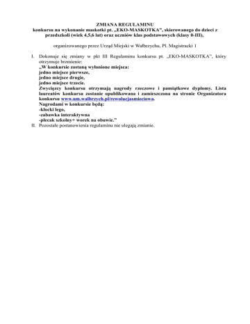 ZMIANA REGULAMINU konkursu na wykonanie maskotki pt. „EKO-MASKOTKA”, skierowanego do dzieci z przedszkoli (wiek 4,5,6 lat) oraz uczniów klas podstawowych (klasy 0-III), organizowanego przez Urząd Miejski w Wałbrzychu, Pl. Magistracki 1 I. Dokonuje się zmiany w pkt III Regulaminu konkursu pt. „EKO-MASKOTKA”, który otrzymuje brzmienie: „W konkursie zostaną wyłonione miejsca: jedno miejsce pierwsze, jedno miejsce drugie, jedno miejsce trzecie. Zwycięzcy konkursu otrzymają nagrody rzeczowe i pamiątkowe dyplomy. Lista laureatów konkursu zostanie opublikowana i zamieszczona na stronie Organizatora konkursu www.um.walbrzych.pl/rewolucjasmieciowa. Nagrodami w konkursie będą: -klocki lego, -zabawka interaktywna -plecak szkolny+ worek na obuwie.” II. Pozostałe postanowienia regulaminu nie ulegają zmianie.