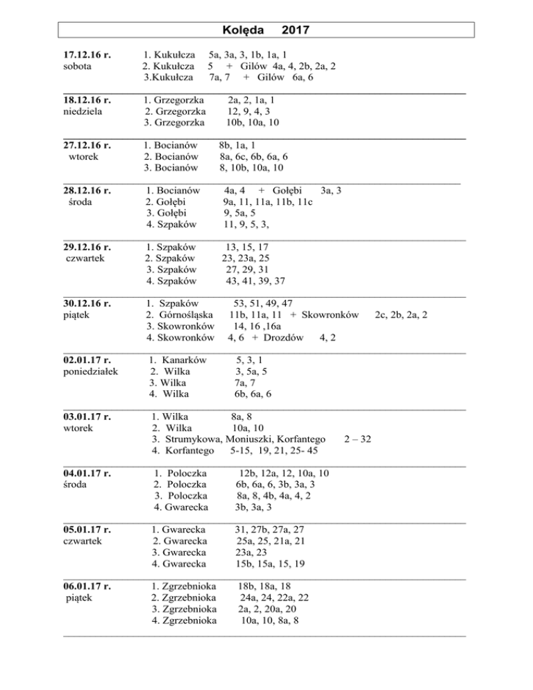 Kolęda 2017 1. Kukułcza 5a, 3a, 3, 1b, 1a, 1 2. Kukułcza 5 + Gilów 4a, 4, 2b, 2a, 2 3.Kukułcza 7a, 7 + Gilów 6a, 6 ___________________________________________________________________________ 18.12.16 r. 1. Grzegorzka 2a, 2, 1a, 1 niedziela 2. Grzegorzka 12, 9, 4, 3 3. Grzegorzka 10b, 10a, 10 ___________________________________________________________________________ 27.12.16 r. 1. Bocianów 8b, 1a, 1 wtorek 2. Bocianów 8a, 6c, 6b, 6a, 6 3. Bocianów 8, 10b, 10a, 10 __________________________________________________________________________ 28.12.16 r. 1. Bocianów 4a, 4 + Gołębi 3a, 3 środa 2. Gołębi 9a, 11, 11a, 11b, 11c 3. Gołębi 9, 5a, 5 4. Szpaków 11, 9, 5, 3, ___________________________________________________________________________ 29.12.16 r. 1. Szpaków 13, 15, 17 czwartek 2. Szpaków 23, 23a, 25 3. Szpaków 27, 29, 31 4. Szpaków 43, 41, 39, 37 ___________________________________________________________________________ 30.12.16 r. 1. Szpaków 53, 51, 49, 47 piątek 2. Górnośląska 11b, 11a, 11 + Skowronków 2c, 2b, 2a, 2 3. Skowronków 14, 16 ,16a 4. Skowronków 4, 6 + Drozdów 4, 2 ___________________________________________________________________________ 02.01.17 r. 1. Kanarków 5, 3, 1 poniedziałek 2. Wilka 3, 5a, 5 3. Wilka 7a, 7 4. Wilka 6b, 6a, 6 ___________________________________________________________________________ 03.01.17 r. 1. Wilka 8a, 8 wtorek 2. Wilka 10a, 10 3. Strumykowa, Moniuszki, Korfantego 2 – 32 4. Korfantego 5-15, 19, 21, 25- 45 ___________________________________________________________________________ 04.01.17 r. 1. Poloczka 12b, 12a, 12, 10a, 10 środa 2. Poloczka 6b, 6a, 6, 3b, 3a, 3 3. Poloczka 8a, 8, 4b, 4a, 4, 2 4. Gwarecka 3b, 3a, 3 ___________________________________________________________________________ 05.01.17 r. 1. Gwarecka 31, 27b, 27a, 27 czwartek 2. Gwarecka 25a, 25, 21a, 21 3. Gwarecka 23a, 23 4. Gwarecka 15b, 15a, 15, 19 ___________________________________________________________________________ 06.01.17 r. 1. Zgrzebnioka 18b, 18a, 18 piątek 2. Zgrzebnioka 24a, 24, 22a, 22 3. Zgrzebnioka 2a, 2, 20a, 20 4. Zgrzebnioka 10a, 10, 8a, 8 ___________________________________________________________________________ 17.12.16 r. sobota 07.01.17 r. sobota 1. Zgrzebnioka 12, 4b, 4a, 4 2. Zgrzebnioka 16a, 16, 14 3. ZMP 20a, 20, 22b, 22a, 22 4. ZMP 14, 14a, 16, 16a, 18 ___________________________________________________________________________ 08.01.17 r. 1. ZMP 2, 6, 6a, 8, 8a, 12 niedziela 2. Kowalskiego 6, 6a, 6b, 6c, 6d, 6e, 6f 3. Kowalskiego 9, 5b, 5a, 5 4. Gwarecka 35b, 35a, 35 ___________________________________________________________________________ 09.01.17 r. 1. Kowalskiego 7c, 7b, 7a, 7, 4b, 4a, 4 poniedziałek 2. Kowalskiego 3d, 3c, 3b, 3a, 3 3. Kowalskiego 2a, 2, 1a, 1 ___________________________________________________________________________ 10.01.17 r. 1. Górnośląska 20d, 20c, 20b, 20a, 20 wtorek 2. Pośpiecha 2d, 2c, 2b, 2a, 2 3. Szramka 5, 1b, 1a, 1, 3a, 3 ___________________________________________________________________________ 11.01.17 r. 1. Brygadzistów 7a, 7, 5b, 5a, 5, 2 środa 2. Brygadzistów 4b, 4a, 4, 2b, 2a 3. Brygadzistów 3a, 3, 1 ___________________________________________________________________________ 12.01.17 r. 1. Kopalniana 14, 12, 10a, 10, 8 czwartek 2. Kopalniana 20a, 20, 18, 16a, 16 3. Kopalniana 22d, 22c, 22b, 22a, 22 4. Sztygarska 7a, 7, 5a, 5 ___________________________________________________________________________ 13.01.17 r. 1. Sztygarska 3a, 3, 2a, 2 piątek 2. Kombajnistów 1a, 1, 2b, 2a, 2 3. Kombajnistów 3, 3a, 3b, 3c 4. Szybowa 6a, 6 __________________________________________________________________________ 14.01.17 r. 1. Szybowa 4b, 4a, 4, 2b, 2a, 2 sobota 2. Sztolniowa 7, 9a, 9, 11a, 11 3. Sztolniowa 4a, 4, 2a, 2, 1a, 1 ___________________________________________________________________________ 15.01.17 r. KOLĘDA DODATKOWA niedziela