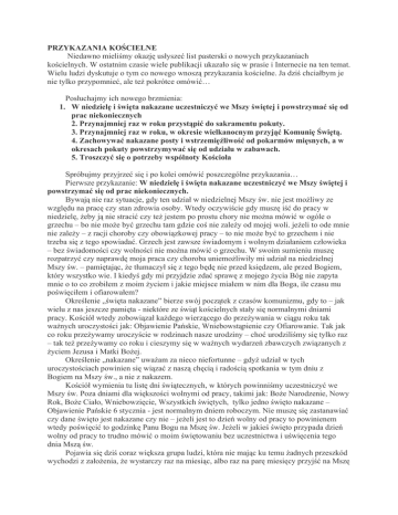 PRZYKAZANIA KOŚCIELNE Niedawno mieliśmy okazję usłyszeć list pasterski o nowych przykazaniach kościelnych. W ostatnim czasie wiele publikacji ukazało się w prasie i Internecie na ten temat. Wielu ludzi dyskutuje o tym co nowego wnoszą przykazania kościelne. Ja dziś chciałbym je nie tylko przypomnieć, ale też pokrótce omówić… Posłuchajmy ich nowego brzmienia: 1. W niedzielę i święta nakazane uczestniczyć we Mszy świętej i powstrzymać się od prac niekoniecznych 2. Przynajmniej raz w roku przystąpić do sakramentu pokuty. 3. Przynajmniej raz w roku, w okresie wielkanocnym przyjąć Komunię Świętą. 4. Zachowywać nakazane posty i wstrzemięźliwość od pokarmów mięsnych, a w okresach pokuty powstrzymywać się od udziału w zabawach. 5. Troszczyć się o potrzeby wspólnoty Kościoła Spróbujmy przyjrzeć się i po kolei omówić poszczególne przykazania… Pierwsze przykazanie: W niedzielę i święta nakazane uczestniczyć we Mszy świętej i powstrzymać się od prac niekoniecznych. Bywają nie raz sytuacje, gdy ten udział w niedzielnej Mszy św. nie jest możliwy ze względu na pracę czy stan zdrowia osoby. Wtedy oczywiście gdy muszę iść do pracy w niedzielę, żeby ją nie stracić czy też jestem po prostu chory nie można mówić w ogóle o grzechu – bo nie może być grzechu tam gdzie coś nie zależy od mojej woli. jeżeli to ode mnie nie zależy – z racji choroby czy obowiązkowej pracy – to nie może być to grzechem i nie trzeba się z tego spowiadać. Grzech jest zawsze świadomym i wolnym działaniem człowieka – bez świadomości czy wolności nie można mówić o grzechu. W swoim sumieniu muszę rozpatrzyć czy naprawdę moja praca czy choroba uniemożliwiły mi udział na niedzielnej Mszy św. – pamiętając, że tłumaczył się z tego będę nie przed księdzem, ale przed Bogiem, który wszystko wie. I kiedyś gdy mi przyjdzie zdać sprawę z mojego życia Bóg nie zapyta mnie o to co zrobiłem z moim życiem i jakie miejsce miałem w nim dla Boga, ile czasu mu poświęciłem i ofiarowałem? Określenie „święta nakazane” bierze swój początek z czasów komunizmu, gdy to – jak wielu z nas jeszcze pamięta - niektóre ze świąt kościelnych stały się normalnymi dniami pracy. Kościół wtedy zobowiązał każdego wierzącego do przeżywania w ciągu roku tak ważnych uroczystości jak: Objawienie Pańskie, Wniebowstąpienie czy Ofiarowanie. Tak jak co roku przeżywamy uroczyście w rodzinach nasze urodziny – choć urodziliśmy się tylko raz – tak też przeżywamy co roku i cieszymy się w ważnych wydarzeń zbawczych związanych z życiem Jezusa i Matki Bożej. Określenie „nakazane” uważam za nieco niefortunne – gdyż udział w tych uroczystościach powinien się wiązać z naszą chęcią i radością spotkania w tym dniu z Bogiem na Mszy św., a nie z nakazem. Kościół wymienia tu listę dni świątecznych, w których powinniśmy uczestniczyć we Mszy św. Poza dniami dla większości wolnymi od pracy, takimi jak: Boże Narodzenie, Nowy Rok, Boże Ciało, Wniebowzięcie, Wszystkich świętych, tylko jedno święto nakazane – Objawienie Pańskie 6 stycznia - jest normalnym dniem roboczym. Nie muszę się zastanawiać czy dane święto jest nakazane czy nie – jeżeli jest to dzień wolny od pracy to powinienem wtedy poświęcić to godzinkę Panu Bogu na Mszę św. Jeżeli w jakieś święto przypada dzień wolny od pracy to trudno mówić o moim świętowaniu bez uczestnictwa i uświęcenia tego dnia Mszą św. Pojawia się dziś coraz większa grupa ludzi, która nie mając ku temu żadnych przeszkód wychodzi z założenia, że wystarczy raz na miesiąc, albo raz na parę miesięcy przyjść na Mszę św. – takie zachowanie jest zwykłem lekceważeniem Boga, łaski Bożej i tego ogromnego daru, jakim jest dla nas Eucharystia – kiedy to Bóg – Stworzyciel Świata – daje się nam marnym stworzeniom jako pokarm. Nie ma lepszej i piękniejszej modlitwy niż ta, kiedy Bóg przychodzi do naszego grzesznego serca – by nam w życiu towarzyszyć i pomagać. I tu już wkraczamy w drugie przykazanie, które brzmi: Przynajmniej raz w roku przystąpić do sakramentu pokuty. Jeden z moich uczniów doszedł kiedyś do wniosku, że nie będzie chodził na Mszę św. i konsekwentnie realizował swoje założenie. Jakież było moje zdziwienie kiedy zobaczyłem go stojącego kolejce do spowiedzi… Zapytałem go w szkole czy zamierza zacząć chodzić na niedzielne Msze św.? Odpowiedział zdecydowanie, że nie. To po co w takim razie przystępował do spowiedzi – brzmiało moje następne pytanie przecież gdy człowiek nie chce się poprawić z grzechu nie może dostać rozgrzeszenia, a nawet jak je otrzyma od księdza, który nie wie o jego założeniu to i tak to rozgrzeszenie jest nieważne. Rzecz się ma podobnie jak w przypadku osób mieszkających ze sobą bez ślubu kościelnego ze swoim ukochanym czy ukochaną – nie mogą dostać rozgrzeszenia – bo ich sytuacja życia nie zakłada możliwości poprawy z grzechu. Jeżeli ktoś przychodzi do spowiedzi i mówi, że zgrzeszył i nadal zamierza to robić to nawet gdyby otrzymał rozgrzeszenie to i tak ono nie będzie ważne – a spowiedź będzie świętokradzka. Żal za grzechy jako podstawowy warunek sakramentu pokuty i otrzymania rozgrzeszenia zakłada konieczność chęci poprawy. Trudno mówić o tym, że człowiek chce się poprawić jeżeli z założenia wyklucza taką możliwość lub też świadomie naraża się na grzech. Zarówno drugie i trzeci przykazanie zaczynają się tak samo: „przynajmniej raz w roku… Przynajmniej raz w roku spowiadać się, komunię święto przyjmować – to oczywiście nie oznacza, że to jest ideał, do którego mam dążyć, ale tylko MINIMUM życia chrześcijańskiego. Sakrament pokuty jest dla nas nie tylko oczyszczeniem z grzechów, ale także źródłem wielu łask od Boga. Nie dziwi fak