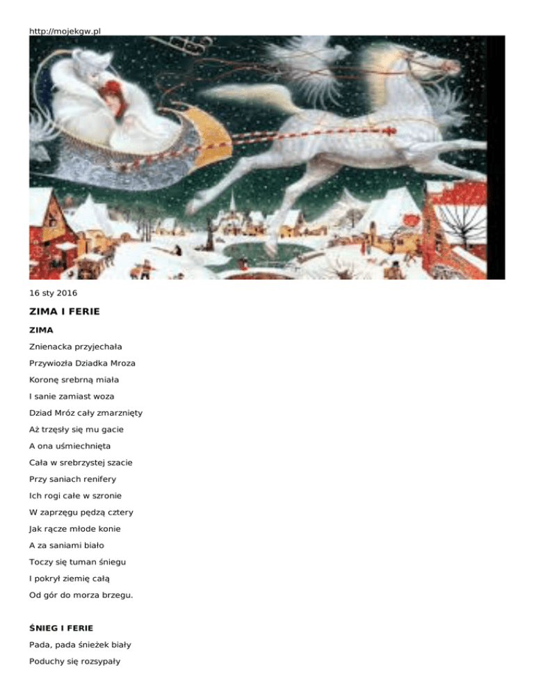 http://mojekgw.pl 16 sty 2016 ZIMA I FERIE ZIMA Znienacka przyjechała Przywiozła Dziadka Mroza Koronę srebrną miała I sanie zamiast woza Dziad Mróz cały zmarznięty Aż trzęsły się mu gacie A ona uśmiechnięta Cała w srebrzystej szacie Przy saniach renifery Ich rogi całe w szronie W zaprzęgu pędzą cztery Jak rącze młode konie A za saniami biało Toczy się tuman śniegu I pokrył ziemię całą Od gór do morza brzegu. ŚNIEG I FERIE Pada, pada śnieżek biały Poduchy się rozsypały Z nieba pada biały puszek Prosto z anielskich poduszek Grupa chętnych się zebrała Na zimowisko zjechała Ferie się zaczęły właśnie Tworzą sie śniegowe baśnie Igloo,zamki i bałwanki W ruch ruszyły narty, sanki Ruch na lodzie, ruch na stoku Raz na sankach , raz na boku Każdy goni bo czas leci Bo umieją liczyć dzieci Ferii dwa tygodnie tylko Więc przelecą jedną chwilką A więc czasu nie marnują Z każdej górki w dół szusują Zimne nogi, nos czerwony Bo śnieg dobrze jest zmrożony Ale harców wciąż za mało By się dłużej pamiętało Dzieci w zimie zakochane Bo to przecież Zakopane. Udanych ferii, przyjemnego wypoczynku wszystkim, którzy kochają aktywny tryb życia i lubią czerpać przyjemności z otaczającej nas przyrody i aury. Pozdrawiam, Halina Dragan. Halina D. z Koło Gospodyń wiejskich Wyszmontów