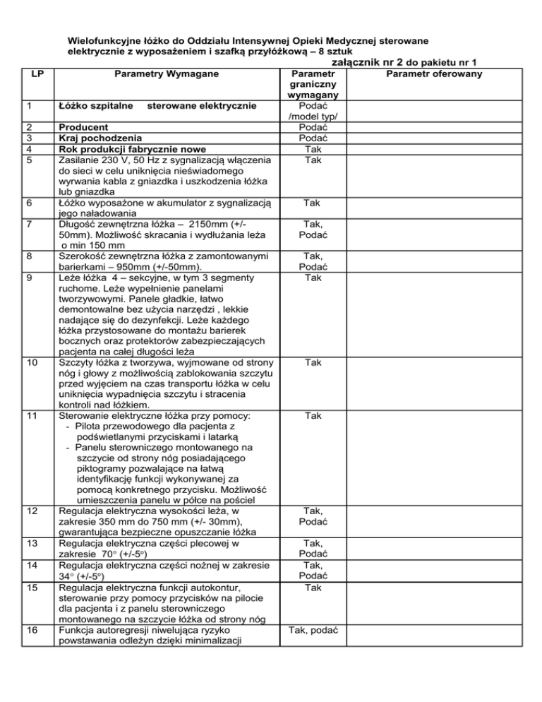 LP 1 2 3 4 5 6 7 8 9 10 11 12 13 14 15 16 Wielofunkcyjne łóżko do Oddziału Intensywnej Opieki Medycznej sterowane elektrycznie z wyposażeniem i szafką przyłóżkową – 8 sztuk załącznik nr 2 do pakietu nr 1 Parametry Wymagane Parametr Parametr oferowany graniczny wymagany Łóżko szpitalne sterowane elektrycznie Podać /model typ/ Producent Podać Kraj pochodzenia Podać Rok produkcji fabrycznie nowe Tak Zasilanie 230 V, 50 Hz z sygnalizacją włączenia Tak do sieci w celu uniknięcia nieświadomego wyrwania kabla z gniazdka i uszkodzenia łóżka lub gniazdka Łóżko wyposażone w akumulator z sygnalizacją Tak jego naładowania Długość zewnętrzna łóżka – 2150mm (+/Tak, 50mm). Możliwość skracania i wydłużania leża Podać o min 150 mm Szerokość zewnętrzna łóżka z zamontowanymi Tak, barierkami – 950mm (+/-50mm). Podać Leże łóżka 4 – sekcyjne, w tym 3 segmenty Tak ruchome. Leże wypełnienie panelami tworzywowymi. Panele gładkie, łatwo demontowalne bez użycia narzędzi , lekkie nadające się do dezynfekcji. Leże każdego łóżka przystosowane do montażu barierek bocznych oraz protektorów zabezpieczających pacjenta na całej długości leża Szczyty łóżka z tworzywa, wyjmowane od strony Tak nóg i głowy z możliwością zablokowania szczytu przed wyjęciem na czas transportu łóżka w celu uniknięcia wypadnięcia szczytu i stracenia kontroli nad łóżkiem. Sterowanie elektryczne łóżka przy pomocy: Tak - Pilota przewodowego dla pacjenta z podświetlanymi przyciskami i latarką - Panelu sterowniczego montowanego na szczycie od strony nóg posiadającego piktogramy pozwalające na łatwą identyfikację funkcji wykonywanej za pomocą konkretnego przycisku. Możliwość umieszczenia panelu w półce na pościel Regulacja elektryczna wysokości leża, w Tak, zakresie 350 mm do 750 mm (+/- 30mm), Podać gwarantująca bezpieczne opuszczanie łóżka Regulacja elektryczna części plecowej w Tak, o Podać zakresie 70 (+/-5 ) Regulacja elektryczna części nożnej w zakresie Tak, Podać 34 (+/-5o) Regulacja elektryczna funkcji autokontur, Tak sterowanie przy pomocy przycisków na pilocie dla pacjenta i z panelu sterowniczego montowanego na szczycie łóżka od strony nóg Funkcja autoregresji niwelująca ryzyko Tak, podać powstawania odleżyn dzięki minimalizacji 17 18 19 20 21 22 23 24 25 26 27 nacisku w odcinku krzyżowo-lędźwiowym a tym samym pełniąca funkcje profilaktyczną przeciwko odleżynom. W segmencie pleców: min.9cm, w segmencie uda: min.5cm. Funkcja Ergoframe, system teleskopowego odsuwania się segmentu pleców oraz uda nie tylko do tyłu, ale i do góry (ruch po okręgu) podczas podnoszenia segmentów, w celu eliminacji sił tarcia będącymi potencjalnym zagrożeniem powstawania odleżyn. Regulacja elektryczna pozycji Trendelenburga 15– sterowanie z panelu sterowniczego montowanego na szczycie łóżka od strony nóg Regulacja elektryczna pozycji antyTrendelenburga 15 – sterowanie z panelu sterowniczego montowanego na szczycie łóżka od strony nóg. Regulacja elektryczna do pozycji krzesła kardiologicznego – sterowanie przy pomocy jednego oznaczonego odpowiednim piktogramem przycisku na panelu sterowniczym montowanym na szczycie łóżka od strony nóg Regulacja elektryczna do pozycji antyszokowej – sterowanie przy pomocy jednego oznaczonego odpowiednim piktogramem przycisku na panelu sterowniczym montowanym na szczycie łóżka od strony nóg Regulacja elektryczna funkcji CPR – sterowanie przy pomocy jednego oznaczonego odpowiednim piktogramem przycisku na panelu sterowniczym montowanym na szczycie łóżka od strony nóg Blokada funkcji elektrycznych na panelu sterowniczym dla regulacji: - regulacji wysokości - regulacji części plecowej - regulacji części nożnej Elektroniczne wskaźniki informujące o zablokowanych, aktywnych funkcjach łóżka na panelu sterowniczym i pilocie pacjenta Alarm dźwiękowy informujący o próbie użycia zablokowanej funkcji Zabezpieczenie przed nieświadomym uruchomieniem funkcji poprzez konieczność wciśnięcia przycisku uruchamiającego dostępność funkcji . Przyciski aktywacji dostępne w sterowaniu: na panelu i pilocie Odłączenie wszelkich regulacji po 180 sekundach nieużywania regulacji (konieczność świadomego ponownego uruchomienia regulacji) Przycisk bezpieczeństwa (STOP lub o innym oznaczeniu) natychmiastowe odłączenie wszystkich funkcji elektrycznych w przypadku wystąpienia zagrożenia dla pacjenta lub personelu również odcinający funkcje w Tak Tak, Podać Tak, Podać Tak Tak Tak Tak Tak Tak Tak Tak przypadku braku podłączenia do sieci – pracy na akumulatorze. 28 Mechaniczna funkcja CPR 29 Koła o średnicy min 125mm z możliwością indywidualnego i centralnego blokowania. 30 Bezpieczne obciążenie robocze dla każdej pozycji leża i segmentów na poziomie minimum 250kg. Pozwalające na wszystkie możliwe regulacje przy tym obciążeniu bez narażenia bezpieczeństwa pacjenta i powstanie incydentu medycznego. System elektrycznej ochrony przed uszkodzeniem łóżka w wyniku przeciążenia, polega na wyłączeniu regulacji łóżka w przypadku przekroczonego obciążenia. 31 wyposażenie: - Barierki boczne metalowe lakierowane składane wzdłuż ramy leża o wysokości min 450mm. Barierki wyposażone w uchwyt z system blokady umożliwiającym odblokowywanie, składanie i rozkładanie za pomocą jednej ręki. Mechanizm wbudowany w górną poprzeczkę barierki - Blat nakładany na barierki boczne - Materac przeciwodleżynowy o grubości min 120mm wykonany z piany poliuretanowej. Materac w pokrowcu z suwakiem nie przepuszczającym płynów infuzyjnych a przepuszczającym powietrze - Wysuwana spad leża - lakierowana półka na pościel z miejscem do odkładania panelu sterowniczego - Listwa z miejscem na zawieszanie worków urologicznych z tworzywowymi zaczepami, wieszak do kroplówki. Szafka przyłóżkowa 32 Szafka przyłóżkowa z moż