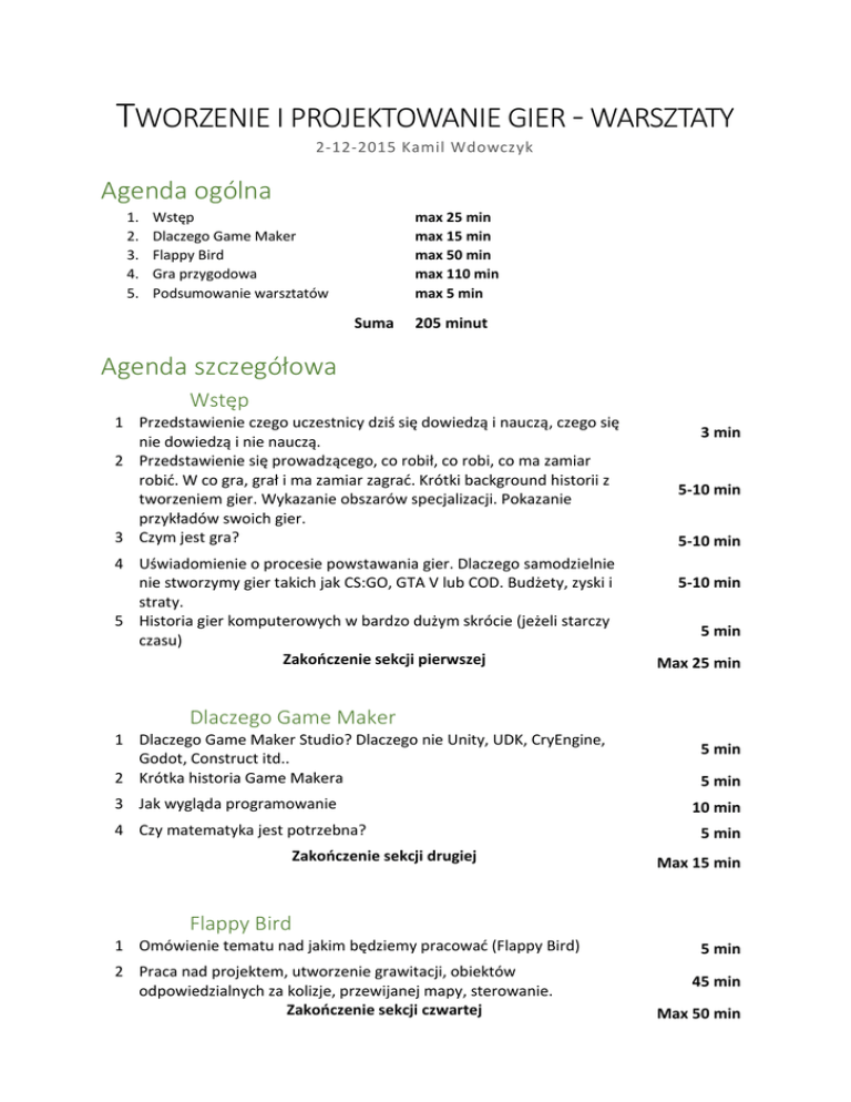 TWORZENIE I PROJEKTOWANIE GIER - WARSZTATY 2-12-2015 Kamil Wdowczyk Agenda ogólna 1. 2. 3. 4. 5. Wstęp Dlaczego Game Maker Flappy Bird Gra przygodowa Podsumowanie warsztatów max 25 min max 15 min max 50 min max 110 min max 5 min Suma 205 minut Agenda szczegółowa Wstęp 1 Przedstawienie czego uczestnicy dziś się dowiedzą i nauczą, czego się nie dowiedzą i nie nauczą. 2 Przedstawienie się prowadzącego, co robił, co robi, co ma zamiar robić. W co gra, grał i ma zamiar zagrać. Krótki background historii z tworzeniem gier. Wykazanie obszarów specjalizacji. Pokazanie przykładów swoich gier. 3 Czym jest gra? 4 Uświadomienie o procesie powstawania gier. Dlaczego samodzielnie nie stworzymy gier takich jak CS:GO, GTA V lub COD. Budżety, zyski i straty. 5 Historia gier komputerowych w bardzo dużym skrócie (jeżeli starczy czasu) Zakończenie sekcji pierwszej 3 min 5-10 min 5-10 min 5-10 min 5 min Max 25 min Dlaczego Game Maker 1 Dlaczego Game Maker Studio? Dlaczego nie Unity, UDK, CryEngine, Godot, Construct itd.. 2 Krótka historia Game Makera 3 Jak wygląda programowanie 4 Czy matematyka jest potrzebna? Zakończenie sekcji drugiej 5 min 5 min 10 min 5 min Max 15 min Flappy Bird 1 Omówienie tematu nad jakim będziemy pracować (Flappy Bird) 2 Praca nad projektem, utworzenie grawitacji, obiektów odpowiedzialnych za kolizje, przewijanej mapy, sterowanie. Zakończenie sekcji czwartej 5 min 45 min Max 50 min Gra przygodowa 1 Omówienie tematu nad jakim będziemy pracować (Gra przygodowa) 2 Praca nad projektem, edytowanie istniejących (wcześniej przygotowanych) komponentów gry przygodowej (zręcznościowo logicznej) Zakończenie sekcji piątej Podsumowanie warsztatów 5-10 min 100 min Max 110 min 5 min Warsztaty Flappy Bird Uczestnicy będą mieli okazję stworzyć kopię bardzo popularnej gry mobilnej Flappy Bird, która zarobiła wiele milionów dolarów. Projekt ma na celu pokazanie, jak niewielkim kosztem i w krótkim czasie przygotować grę, która jest w stanie zarobić miliony, a także zaprezentować podstawowe mechanizmy tworzenia prostych gier. Najlepsza praca zostanie wyeksportowana do formatu APK pozwalającego na instalowanie go na urządzeniach obsługujących urządzenia z systemem operacyjnym Android. Gra przygodowa Uczestnicy otrzymają częściowo gotowy silnik gry przygodowo-zręcznościowej. Poruszanie się, zbieranie przedmiotów, system zdrowia, otwieranie drzwi kluczami i przesuwanie specjalnych obiektów, będzie już zaimplementowane. Uczestnicy będą rozszerzać możliwości gry implementując różne rodzaje pułapek i przeciwników. Pająki, strzały, ogień. Wszystko to w umownej szacie graficznej.