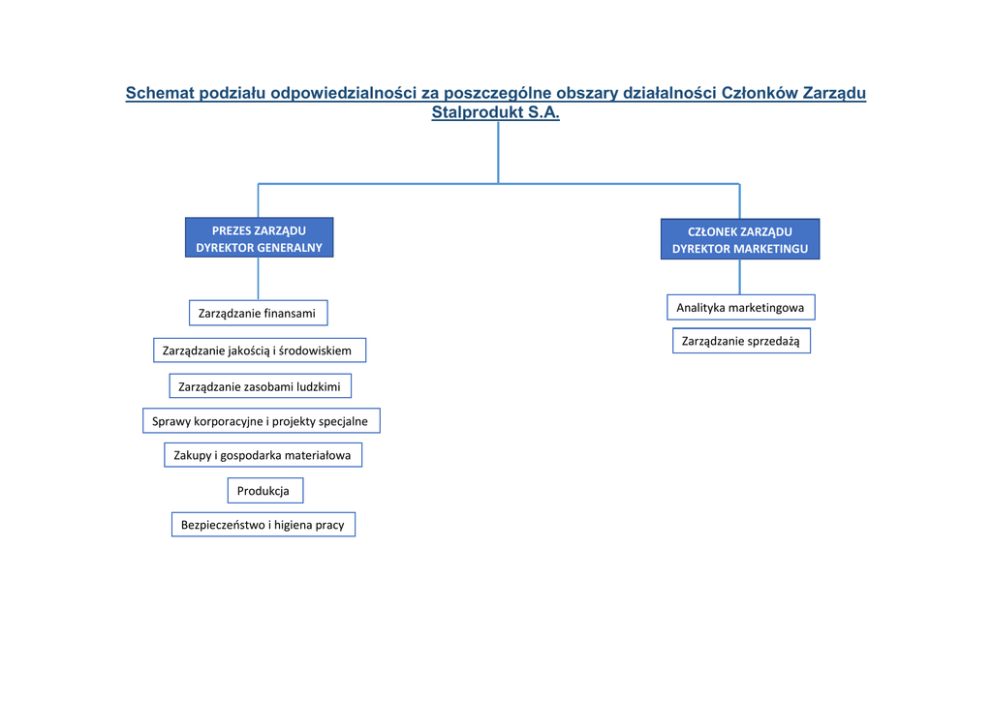 Schemat podziału odpowiedzialności za poszczególne obszary działalności Członków Zarządu Stalprodukt S.A. PREZES ZARZĄDU DYREKTOR GENERALNY CZŁONEK ZARZĄDU DYREKTOR MARKETINGU Zarządzanie finansami Analityka marketingowa Zarządzanie jakością i środowiskiem Zarządzanie zasobami ludzkimi Sprawy korporacyjne i projekty specjalne Zakupy i gospodarka materiałowa Produkcja Bezpieczeństwo i higiena pracy ospodarcza Zarządzanie sprzedażą