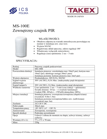 MADE IN JAPAN MS-100E Zewnętrzny czujnik PIR • • • • • WŁAŚCIWOŚCI: Obudowa odporna na warunki atmosferyczne pozwalająca na montaż w instalacja zew. oraz wew. Wyjścia NO/NC Regulowany układ optyczny, zakres regulacji 180’ Wbudowany wyłącznik zmierzchowy Regulacja czasu opóźnienia: 2 sec ~ 5 min SPECYFIKACJA: Rodzaj Model Powierzchnia detekcji Wyjście alarmowe Sygnał wyjścia alarmowego Sygnał tamper'a Wielkości nastawne Miejsce instalacji Zasilanie Pobór prądu Temperatura pracy Zastosowanie Sposób detekcji Opcje Wymiary (O x L) Masa Pasywny czujnik podczerwieni MS-100E Instalacja pionowa: szerokokątna max 10m(5 par), kurtyna max 10m(5 par), dalekiego zasięgu 20m(1 para) Instalacja pozioma: kurtyna pionowa max 3m(5 par) Przekaźnikowe, 30V/0.5A, NO/NC 30V (AC/DC), 0,5A Max. (maksymalny prąd obciążenia) 30V (AC/DC), 2A Max. (maksymalny prąd obciążenia) Czas opóźnienia: 2 sec ~ 5 min (czas reakcji + opóźnienie) Światło dzienne: 10 lux ~ ∞ (wartość luminancji) Czułość PIR: 30%(L) ~ 170%(H) (domyślnie 100%) Instalacja pionowa: wewnętrzna/zewnętrzna (słupek/ściana) (wysokość: 0.8m-1.5m) Instalacja pozioma:wewnętrzna/lekkie zew. (sufit/ściana) (wysokość max 3m) 10.5-30 V DC 30mA max -20’-50’C (-4’ – 120’ F) Zewnętrzne, wewnętrzne Podwójny pyroelement Uchwyt i osłona do montażu na słupie, uchwyt ścienny, uchwyt sufitowy 77 x 171 x 70 mm 220g Dystrybucja ICS Polska, ul.Żuławskiego 4/6, 02-641 Warszawa, tel. (22) 646 11 38, www.ics.pl WYMIARY ZEWNĘTRZNE: KONFIGURACJA TERMINALA: zasilane wyjście tamper Możliwość zmiany trybu pracy NO/NC wyjś alarmowych ułatwia współprace z takimi urządzeniami jak kamery, syntezery mowy itp. Powierzchnia detekcji: Instalacja pionowa: Szerokokątny Kurtyna Daleki zasięg Wysokość montażu: 0.8~1.5m Instalacja pozioma: Sufit: Ściana: Wysokość montażu: 3m MAX Dystrybucja ICS Polska, ul.Żuławskiego 4/6, 02-641 Warszawa, tel. (22) 646 11 38, www.ics.pl