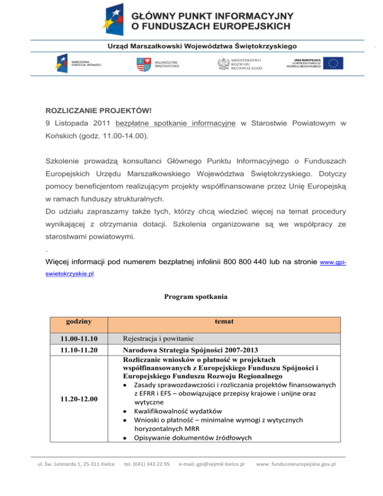 ROZLICZANIE PROJEKTÓW! 9 Listopada 2011 bezpłatne spotkanie