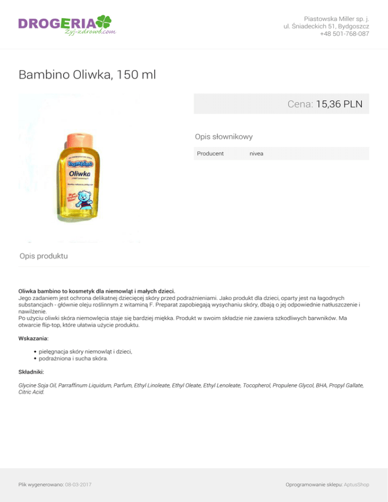 Piastowska Miller sp. j. ul. Śniadeckich 51, Bydgoszcz +48 501-768-087 Bambino Oliwka, 150 ml Cena: 15,36 PLN Opis słownikowy Producent nivea Opis produktu Oliwka bambino to kosmetyk dla niemowląt i małych dzieci. Jego zadaniem jest ochrona delikatnej dziecięcej skóry przed podrażnieniami. Jako produkt dla dzieci, oparty jest na łagodnych substancjach - głównie oleju roślinnym z witaminą F. Preparat zapobiegają wysychaniu skóry, dbają o jej odpowiednie natłuszczenie i nawilżenie. Po użyciu oliwki skóra niemowlęcia staje się bardziej miękka. Produkt w swoim składzie nie zawiera szkodliwych barwników. Ma otwarcie flip-top, które ułatwia użycie produktu. Wskazania: pielęgnacja skóry niemowląt i dzieci, podrażniona i sucha skóra. Składniki: Glycine Soja Oil, Parraffinum Liquidum, Parfum, Ethyl Linoleate, Ethyl Oleate, Ethyl Lenoleate, Tocopherol, Propulene Glycol, BHA, Propyl Gallate, Citric Acid. Plik wygenerowano: 08-03-2017 Oprogramowanie sklepu: AptusShop Piastowska Miller sp. j. ul. Śniadeckich 51, Bydgoszcz +48 501-768-087 Plik wygenerowano: 08-03-2017 Powered by TCPDF (www.tcpdf.org) Oprogramowanie sklepu: AptusShop