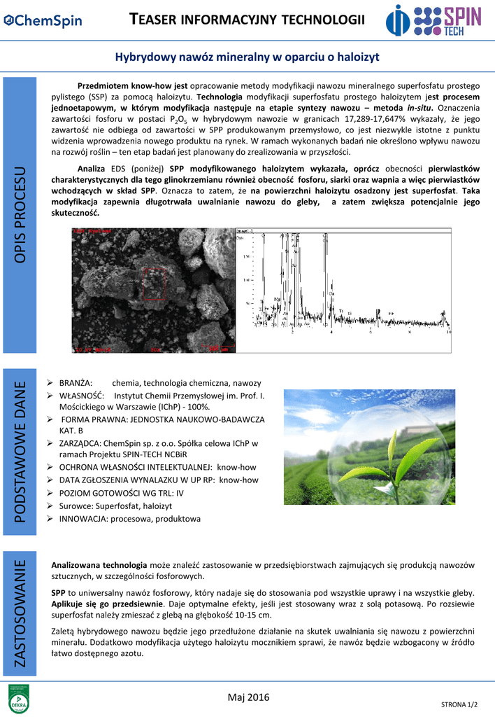 TEASER INFORMACYJNY TECHNOLOGII Hybrydowy nawóz mineralny w oparciu o haloizyt ZASTOSOWANIE PODSTAWOWE DANE OPIS PROCESU Przedmiotem know-how jest opracowanie metody modyfikacji nawozu mineralnego superfosfatu prostego pylistego (SSP) za pomocą haloizytu. Technologia modyfikacji superfosfatu prostego haloizytem jest procesem jednoetapowym, w którym modyfikacja następuje na etapie syntezy nawozu – metoda in-situ. Oznaczenia zawartości fosforu w postaci P2O5 w hybrydowym nawozie w granicach 17,289-17,647% wykazały, że jego zawartość nie odbiega od zawartości w SPP produkowanym przemysłowo, co jest niezwykle istotne z punktu widzenia wprowadzenia nowego produktu na rynek. W ramach wykonanych badań nie określono wpływu nawozu na rozwój roślin – ten etap badań jest planowany do zrealizowania w przyszłości. Analiza EDS (poniżej) SPP modyfikowanego haloizytem wykazała, oprócz obecności pierwiastków charakterystycznych dla tego glinokrzemianu również obecność fosforu, siarki oraz wapnia a więc pierwiastków wchodzących w skład SPP. Oznacza to zatem, że na powierzchni haloizytu osadzony jest superfosfat. Taka modyfikacja zapewnia długotrwała uwalnianie nawozu do gleby, a zatem zwiększa potencjalnie jego skuteczność. BRANŻA: chemia, technologia chemiczna, nawozy WŁASNOŚĆ: Instytut Chemii Przemysłowej im. Prof. I. Mościckiego w Warszawie (IChP) - 100%. FORMA PRAWNA: JEDNOSTKA NAUKOWO-BADAWCZA KAT. B ZARZĄDCA: ChemSpin sp. z o.o. Spółka celowa IChP w ramach Projektu SPIN-TECH NCBiR OCHRONA WŁASNOŚCI INTELEKTUALNEJ: know-how DATA ZGŁOSZENIA WYNALAZKU W UP RP: know-how POZIOM GOTOWOŚCI WG TRL: IV Surowce: Superfosfat, haloizyt INNOWACJA: procesowa, produktowa Analizowana technologia może znaleźć zastosowanie w przedsiębiorstwach zajmujących się produkcją nawozów sztucznych, w szczególności fosforowych. SPP to uniwersalny nawóz fosforowy, który nadaje się do stosowania pod wszystkie uprawy i na wszystkie gleby. Aplikuje się go przedsiewnie. Daje optymalne efekty, jeśli jest stosowany wraz z solą potasową. Po rozsiewie superfosfat należy zmieszać z glebą na głębokość 10-15 cm. Zaletą hybrydowego nawozu będzie jego przedłużone działanie na skutek uwalniania się nawozu z powierzchni minerału. Dodatkowo modyfikacja użytego haloizytu mocznikiem sprawi, że nawóz będzie wzbogacony w źródło łatwo dostępnego azotu. Maj 2016 STRONA 1/2 TEASER INFORMACYJNY TECHNOLOGII Hybrydowy nawóz mineralny w oparciu o haloizyt PRZEWAGI KONK. RYNEK NAWOZÓW SPP/HALOIZYT Superfosfat pylisty prosty (SPP)- nawóz z grupy nawozów NPK, przeznaczony do przedsiewnego stosowania pod wszystkie rośliny uprawne, na wszystkie gleby, niezależnie od ich składu chemicznego. Haloizyt (minerał, glinokrzemian o strukturze nanometrycznej warstwowo-rurkowej) lub modyfikowany haloizyt posiada następujące zalety: kondycjonuje glebę, ulepsza strukturę, poprawia żyzność gleby, zwiększa koncentrację składników pokarmowych, zwiększa zdolność gleby do utrzymywania wody, poprawia wchłanianie substancji odżywczych przez rośliny, pobudza aktywność mikrobiologiczną, ogranicza wchłanianie przez rośliny metali ciężkich (kadm, rtęć, ołów, nikiel) na skażonych terenach Przykładowe aktualne ceny superfosfatów prostych na polskim rynku Sprzedawca Nazwa produktu Cena rynkowa brutto [PLN/t] Zakłady Chemiczne „Siarkopol” Tarnobrzeg Sp. z o.o. Superfosfat prosty granulowany 689,04 Luvena S.A. Superfosfat 19 Superfosfat 20 621,00 707,40 Innowacyjny hybrydowy nawóz – superfosfat prosty modyfikowany haloizytem – jest nawozem o przedłużonym działaniu, gdyż związek mineralny osadzony na glinokrzemianie jest stopniowo uwalniany do gleby, co zapobiega przenawożeniu roślin i gromadzeniu się w ich tkankach szkodliwych substancji. Obecność haloizytu w produkcie wzmacnia działanie nawozu poprzez kondycjonowanie gleby. Ponadto ulepsza strukturę i poprawia żyzność gleby, zwiększa koncentrację składników pokarmowych, zwiększa zdolność gleby do utrzymywania wody, poprawia wchłanianie substancji odżywczych przez rośliny oraz pobudza aktywność mikrobiologiczną. Dodatkowo wcześniejsza modyfikacja haloizytu mocznikiem wzbogaca produkt docelowy o łatwodostępny dla roślin azot. Wartością dodaną, która wiąże się z zastosowaniem w technologii nawozów sztucznych modyfikowanego glinokrzemianu o strukturze nanometrycznej jest możliwość ograniczenia wchłaniania przez rośliny metali ciężkich (kadm, rtęć, ołów, nikiel) na skażonych terenach. Technologia jest procesem jednoetapowym i nie wymaga budowy nowej instalacji a jedynym kosztem jest uzupełnienie istniejącej o węzeł podawania haloizytu. Producent tego typu nawozu dzięki niewielkim nakładom finansowym zyskałby zatem przewagę nad konkurencją dzięki wzbogaceniu swojego asortymentu o innowacyjny nawóz hybrydowy o cechach wymienionych powyżej. Kontakt: Ewa Śmigiera ([email protected] tel. +48 604479112) Maj 2016 STRONA 2/2