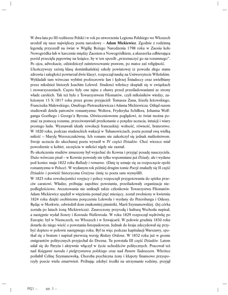 W dwa lata po III rozbiorze Polski i w rok po utworzeniu Legionu Polskiego we Włoszech urodził się nasz największy poeta narodowy – Adam Mickiewicz. Zgodnie z rodzinną legendą przyszedł na świat w Wigilię Bożego Narodzenia 1798 roku w Zaosiu koło Nowogródka lub w karczmie między Zaosiem a Nowogródkiem, a akuszerka odbierająca poród przecięła pępowinę na książce, by w ten sposób „przeznaczyć go na rozumnego”. Po ojcu, adwokacie, odziedziczył zainteresowanie prawem, po matce zaś religijność. Ukończywszy szóstą klasę dominikańskiej szkoły powiatowej (z powodu złego stanu zdrowia i zaległości powtarzał dwie klasy), rozpoczął naukę na Uniwersytecie Wileńskim. Wykładali tam wówczas wybitni profesorowie Jan i Jędrzej Śniadeccy oraz uwielbiany przez młodzież historyk Joachim Lelewel. Studenci wileńscy skupiali się w związkach i stowarzyszeniach. Często były one tajne z obawy przed prześladowaniami ze strony władz carskich. Tak też było z Towarzystwem Filomatów, czyli miłośników wiedzy, założonym 13 X 1817 roku przez grono przyjaciół: Tomasza Zana, Józefa Jeżowskiego, Franciszka Malewskiego, Onufrego Pietraszkiewicza i Adama Mickiewicza. Odtąd razem studiowali dzieła patronów romantyzmu: Woltera, Fryderyka Schillera, Johanna Wolfganga Goethego i George’a Byrona. Oświeceniowemu poglądowi, że świat można poznać za pomocą rozumu, przeciwstawiali przekonanie o potędze uczucia, intuicji i wiary prostego ludu. Wyznawali ideały rewolucji francuskiej: wolność, równość, braterstwo. W 1820 roku, podczas studenckich wakacji w Tuhanowiczach, poeta poznał swą wielką miłość – Marylę Wereszczakównę. Ich romans nie zakończył się jednak małżeństwem. Swoje uczucia do ukochanej poeta wyraził w IV części Dziadów. Choć wieszcz miał powodzenie u kobiet, szczęścia w miłości nigdy nie zaznał. Po ukończeniu studiów zmuszony był wyjechać do Kowna i przyjąć posadę nauczyciela. Dużo wówczas pisał – w Kownie powstały nie tylko wspomniane już Dziady, ale i wydane pod koniec maja 1822 roku Ballady i romanse. (Datę tę uznaje się za rozpoczęcie epoki romantyzmu w Polsce). W wydanym rok później drugim tomie Poezji znalazły się II część Dziadów i powieść historyczna Grażyna (imię to poeta sam wymyślił). W 1823 roku rewolucjoniści rosyjscy i polscy rozpoczęli przygotowania do spisku przeciw caratowi. Władze, próbując zapobiec powstaniu, prześladowały organizacje niepodległościowe. Aresztowania nie uniknęli także członkowie Towarzystwa Filomatów. Adam Mickiewicz spędził w więzieniu ponad pięć miesięcy, został zwolniony w kwietniu 1824 roku dzięki osobistemu poręczeniu Lelewela i wysłany do Petersburga i Odessy. Będąc w Moskwie, odwiedził dom znakomitej pianistki, Marii Szymanowskiej. (Jej córka została po latach żoną Mickiewicza). Zauroczony przyrodą i kulturą Wschodu napisał, a następnie wydał Sonety i Konrada Wallenroda. W roku 1829 rozpoczął wędrówkę po Europie: był w Niemczech, we Włoszech i w Szwajcarii. W połowie grudnia 1830 roku dotarła do niego wieść o powstaniu listopadowym. Jednak do kraju zdecydował się przybyć dopiero w połowie następnego roku. Był tu więc podczas kapitulacji Warszawy, spotkał się z bratem i napisał pierwszą wersję Reduty Ordona. W 1832 roku już w gronie emigrantów politycznych przyjechał do Drezna. Tu powstała III część Dziadów. Latem udał się do Paryża i aktywnie włączył w życie uchodźców politycznych. Pracował też nad Księgami narodu i pielgrzymstwa polskiego oraz nad Panem Tadeuszem. Wkrótce poślubił Celinę Szymanowską. Choroba psychiczna żony i kłopoty finansowe przysporzyły poecie wielu zmartwień. Próbując zdobyć środki na utrzymanie rodziny, przyjął PG1 – str. 1 – posadę wykładowcy literatury łacińskiej w Lozannie, a następnie literatury słowiańskiej w Collège de France. Przełomowym momentem w życiu Mickiewicza było spotkanie z litewskim szlachcicem Andrzejem Towiańskim w połowie 1841 roku. Towiański uważał się za proroka i założył sektę „Koło Sprawy Bożej”. Ponieważ jego poglądy były sprzeczne z doktryną Kościoła i z oficjalną polityką państwa, zwalczał go Kościół, francuska policja i pisma emigracyjne. Kiedy wewnątrz Koła zaczęły się spory i intrygi, Mickiewicz zdecydował się opuścić sektę. Czynnie zaangażował się wówczas w wydarzenia Wiosny Ludów. Za głoszenie swych mistycznych i nielegalnych poglądów stracił posadę w Collège de France. W czasie przewrotu politycznego, gdy we Francji władzę objęła burżuazja, redagował „Trybunę Ludów”. Trzy lata później, a więc po zamachu stanu i objęciu rządów przez Napoleona III, podjął pracę w Bibliotece Arsenału. Postanowił też wyjechać do Turcji, by w czasie trwającego tam konfliktu rosyjsko-tureckiego załagodzić niesnaski między Polakami w Stambule. Z podróży jednak już nie wrócił. Zmarł 26 listopada 1855 roku na cholerę. Pochowany został na cmentarzu w Montmorency. Jego zwłoki sprowadzono do kraju w 1890 roku i złożono w krypcie królewskiej na Wawelu. PG1 – str. 2 –