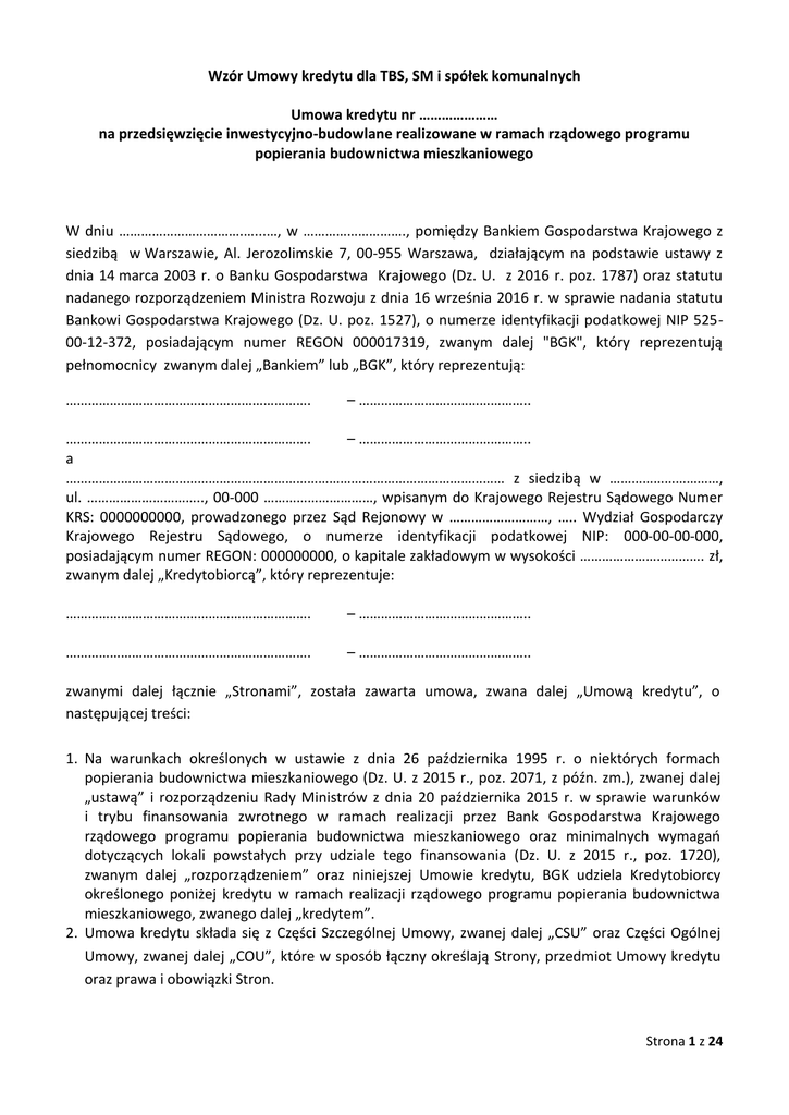 Wzór Umowy kredytu dla TBS, SM i spółek komunalnych
