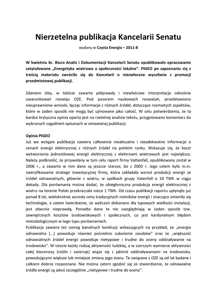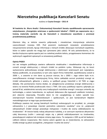 Nierzetelna publikacja Kancelarii Senatu wydany w Czysta Energia – 2011-8 W kwietniu br. Biuro Analiz i Dokumentacji Kancelarii Senatu opublikowało opracowanie zatytułowane „Energetyka wiatrowa a społeczności lokalne”. PIGEO po zapoznaniu się z treścią materiału zwróciło się do Kancelarii o niezwłoczne wycofanie z promocji przedmiotowej publikacji. Zdaniem Izby, w tekście zawarto półprawdy i niewłaściwe interpretacje odnośnie uwarunkowań rozwoju OZE. Pod pozorem naukowych rozważań, przedstawiono nieuprawnione wnioski, łącząc informacje z różnych źródeł, dotyczące rozmaitych aspektów, które w żaden sposób nie mogą być ujmowane jako całość. W celu potwierdzenia, że ta bardzo krytyczna opinia oparta jest na rzetelnej analizie tekstu, przygotowano komentarz do wybranych zagadnień opisanych w omawianej publikacji. Opinia PIGEO Już we wstępie publikacja zawiera całkowicie nieaktualne i nieadekwatne informacje o cenach energii elektrycznej z różnych źródeł na polskim rynku. Wskazuje się, że koszt wytworzenia jednostkowej energii elektrycznej z elektrowni wiatrowych jest największy. Należy podkreślić, że przywołany w tym celu raport firmy Vattenfall, opublikowany został w 2006 r., a zawarte w nim dane są jeszcze starsze, bo z 2003 r. Jego celem było m.in. zweryfikowanie strategii inwestycyjnej firmy, która zakładała wzrost produkcji energii ze źródeł odnawialnych, głównie z wiatru, w spółkach grupy Vatenfall o 10 TWh w ciągu dekady. Dla porównania można dodać, że ubiegłoroczna produkcja energii elektrycznej z wiatru na terenie Polski przekraczała nieco 1 TWh. Od czasu publikacji raportu upłynęło już ponad 8 lat, wielokrotnie wzrosły ceny tradycyjnych nośników energii i znacząco zmieniły się technologie, a zatem twierdzenie, że wyliczeń dokonano dla typowych wielkości instalacji, jest obecnie nieprawdą. Ponadto dane te nie uwzględniają w żaden sposób tzw. zewnętrznych kosztów środowiskowych i społecznych, co jest kardynalnym błędem metodologicznym w tego typu porównaniach. Publikacja zawiera też szereg banalnych konkluzji wskazujących na przykład, że „energia odnawialna [...] powoduje również pośrednio zubożenie zasobów” oraz że „większość odnawialnych źródeł energii powoduje nietypowe i trudne do oceny oddziaływanie na środowisko”. W istocie każdy rodzaj aktywności ludzkiej, a w szerszym wymiarze aktywności całej biocenozy (roślin i zwierząt) wiąże się z jakimiś oddziaływaniami na środowisko, powodującymi większe lub mniejsze zmiany jego stanu. Te związane z OZE są od lat badane i całkiem dobrze rozpoznane. Nie można zatem zgodzić się ze stwierdzenie, że odnawialne źródła energii są jakoś szczególnie „nietypowe i trudne do oceny”. „Winna” energetyka wiatrowa Należy także podkreślić, że w publikacji wskazuje się energetykę wiatrową jako pośredni przyczynek znacznych emisji CO2 wywołanych koniecznością bilansowania energii w systemie. Dowodzi to zasadniczego niezrozumienia zasad funkcjonowania nowoczesnych systemów elektroenergetycznych, w tym w szczególności reguł bilansowania okresowych spadków mocy wytwarzanej w energetyce wiatrowej oraz mylenia tego pojęcia z zasadą utrzymywania rezerwy mocy w systemie elektroenergetycznym. W Polsce problem ten ma obecnie wymiar czysto hipotetyczny. Udział energetyki wiatrowej w produkcji energii elektrycznej kierowanej do Krajowego Systemu Elektroenergetycznego dopiero co przekroczył 1%, a więc okresowy spadek podaży z tego sektora, w szczególności poza godzinami szczytu, łatwo może być zbilansowany poprzez szybkie zwiększenie produkcji w pracujących blokach. Jako nierozpoznane, tajemnicze i celowo ignorowane oddziaływanie na środowisko, a zwłaszcza na zdrowie ludzi, publikacja wskazuje infradźwięki (dźwięki o częstotliwości poniżej dolnego progu słyszalności człowieka – 20 Hz). Zagadnienie to jest w publikacji szeroko, ale mało rzetelnie opisane. Pomieszane są informacje z fragmentarycznych i nie najlepiej udokumentowanych badań prowadzonych w rejonie farm wiatrowych z ustaleniami z zakresu medycyny pracy, które odnoszą się do narażenia na infradźwięki niektórych grup zawodowych (np. kierowców, operatorów maszyn, pilotów itp.), w przypadku których natężenia tego pasma hałasu są setki razy większe niż w odległości 100 m od najpotężniejszych farm wiatrowych. W związku z tym PIGEO pragnie zaznaczyć, że w treści ekspertyzy nie znalazło opisu celu, jakiemu ma ona służyć. Jednak sam wydźwięk opracowania, a zwłaszcza supozycje zawarte w podsumowaniu, pozwalają domniemywać, że celem publikacji jest próba zablokowania rozwoju energetyki wiatrowej, co stoi w sprzeczności z międzynarodowymi zobowiązaniami Polski oraz planami przyjętymi przez rząd w dokumencie Polityka Energetyczna Polski do 2030 r. Rozczarowanie PIGEO Z całą pewnością dla części opinii publicznej, zwłaszcza dla jej przedstawicieli mniej zorientowanych w rzeczywistych problemach rozwoju sektora odnawialnych źródeł energii, fakt, że ekspertyza ta sygnowana jest godłem Kancelarii Senatu przydaje jej cech wiarygodności. PIGEO przyjmuje ten fakt z głębokim rozczarowaniem, gdyż nie tak wyobraża sobie rzeczową, konstruktywną dyskusję o tym zasadniczym wyzwaniu przyszłości. We właściwym informowaniu i edukowaniu społeczeństwa ważną rolę odgrywać powinny nie tylko organizacje branżowe, ale przede wszystkim organy i agendy państwa. Jako izba gospodarcza skupiająca profesjonalistów z tej dziedziny lepiej niż ktokolwiek inny zdajemy sobie sprawę z problemów, jakie napotyka rozwój wszystkich branż odnawialnych źródeł energii. Dlatego też, na wszelkie próby dezinformacji czy bezpodstawnej krytyki dotyczące specyfiki działania obiektów wykorzystujących odnawialne źródła, prezentowane także w materiale wydanym prz