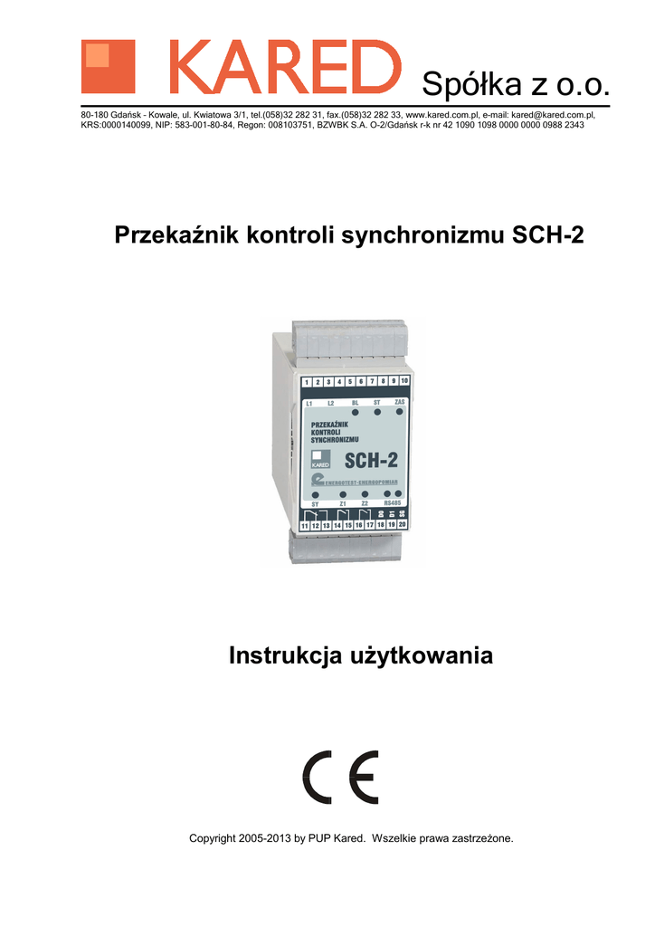 Spółka z o.o. 80-180 Gdańsk – Kowale, ul. Kwiatowa 3/1, tel.(058)32 282 31, fax.(058)32 282 33, www.kared.com.pl, e-mail: [email protected], KRS:0000140099, NIP: 583-001-80-84, Regon: 008103751, BZWBK S.A. O-2/Gdańsk r-k nr 42 1090 1098 0000 0000 0988 2343 Przekaźnik kontroli synchronizmu SCH-2 Instrukcja użytkowania Copyright 2005-2013 by PUP Kared. Wszelkie prawa zastrzeżone. Przekaźnik kontroli synchronizmu SCH-2 – Instrukcja użytkowania PUP KARED zastrzega sobie prawo wprowadzania zmian w swoich produktach polegających na doskonaleniu ich cech technicznych. Zmiany te nie zawsze mogą być na bieżąco uwzględniane w dokumentacji. Marki i nazwy produktów wymienione w niniejszej instrukcji stanowią znaki towarowe lub zarejestrowane znaki towarowe, należące odpowiednio do ich właścicieli. Producent: PUP KARED Sp. z o.o. 80-180 Gdańsk-Kowale, ul. Kwiatowa 3/1 telefon: +48 – 58 – 322 82 31 faks: +48 – 58 – 324 86 46 email: [email protected] www: http://www.kared.com.pl/ Dystrybutor: PUE ENERGOTEST Sp. z o.o. 44-100 Gliwice, ul. Chorzowska 44B tel.: +48 – 32 – 270 45 18 faks: +48 – 32 – 270 45 17 e-mail: [email protected] www: http://www.energotest.com.pl/ imię i nazwisko opracował Grzegorz Redlarski sprawdził Kazimierz Redlarski zatwierdził Adam Redlarski data 2006-09-18 20-11-2007 Plik źródłowy: C:\Users\Public\Documents\WWW.KARED.PL\Dokumentacja\SCH2(2013)\iu_sch2_v.1.06.sxw data modyfikacji: 2013-04-15 PUP KARED Sp. z o.o. podpis str. 2 / 32 godz.: 23:10:22 (#389), wersja: 1.06 www.kared.com.pl w. 1.06 Strona 2 Przekaźnik kontroli synchronizmu SCH-2 – Instrukcja użytkowania Spis treści 1. ZNACZENIE INSTRUKCJI UŻYTKOWANIA ..............................................................................5 2. INFORMACJA O ZGODNOŚCI...................................................................................................6 3. ZASTOSOWANIE URZĄDZENIA...............................................................................................6 4. ZASADY BEZPIECZEŃSTWA....................................................................................................7 4.1. Symbole.....................................................................................................................7 4.2. Instalacja urządzenia.................................................................................................7 4.3. Uruchomienie urządzenia..........................................................................................8 4.4. Eksploatacja urządzania............................................................................................8 4.5. Otwieranie obudowy..................................................................................................8 4.6. Obsługa.....................................................................................................................8 4.7. Przeróbki i zmiany.....................................................................................................8 4.8. Zakłócenia.................................................................................................................8 4.9. Tabliczki znamionowe, informacyjne i naklejki..........................................................8 5. OPIS TECHNICZNY.................................................................................................................... 9 5.1. Opis ogólny................................................................................................................9 6. DANE TECHNICZNE.................................................................................................................. 9 6.1. Warunki środowiskowe..............................................................................................9 6.2. Dane o kompletności.................................................................................................9 6.3. Charakterystyka ogólna wejść.................................................................................10 6.4. Dane wejść analogowych........................................................................................10 6.5. Dane wejść dwustanowych.....................................................................................10 6.6. Charakterystyka zasilania.......................................................................................11 6.7. Charakterystyka wyjść............................................................................................11 7. INSTALACJA............................................................................................................................ 11 8. OBSŁUGA................................................................................................................................. 15 9. ALGORYTM SCH-2.................................................................................................................. 15 9.1. Zastosowane symbole............................................................................................15 9.2. Nastawy...................................................................................................................15 9.3. Definicje...................................................................................................................16 9.4. Algorytm działania SCH-2.......................................................................................17 9.5. Ilustracja graficzna pracy SCH-2.............................................................................18 10. KOMUNIKACJA PRZEZ ŁĄCZE SZEREGOWE.....................................................................20 10.1. Informacja podstawowe.........................................................................................20 PUP KARED Sp. z o.o. www.kared.com.pl w. 1.06 Strona 3 Przekaźnik kontroli synchronizmu SCH-2 – Instrukcja użytkowania 10.2. Program do wprowadzania nastaw......................................