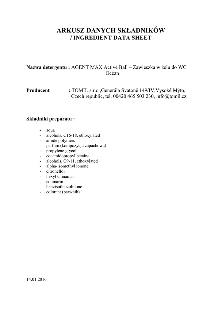 ARKUSZ DANYCH SKŁADNIKÓW / INGREDIENT DATA SHEET Nazwa detergentu : AGENT MAX Active Ball – Zawieszka w żelu do WC Ocean Producent : TOMIL s.r.o.,Generála Svatoně 149/IV,Vysoké Mýto, Czech republic, tel. 00420 465 503 230, [email protected] Składniki preparatu : - aqua alcohols, C16-18, ethoxylated amide polymers parfum (kompozycja zapachowa) propylene glycol cocamidopropyl betaine alcohols, C9-11, ethoxylated alpha-isomethyl ionone citronellol hexyl cinnamal coumarin benzisothiazolinone colorant (barwnik) 14.01.2016