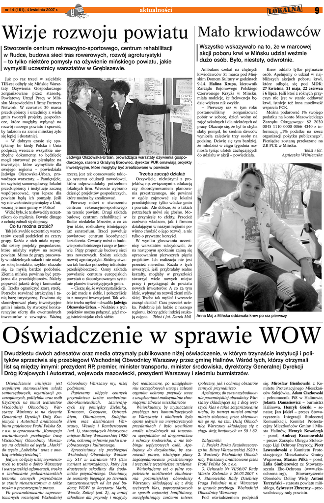 9 aktualności nr 14 (161), 4 kwietnia 2007 r. Wizje rozwoju powiatu Mało krwiodawców Stworzenie centrum rekreacyjno-sportowego, centrum rehabilitacji w Rudce, budowa sieci tras rowerowych, rozwój agroturystyki – to tylko niektóre pomysły na ożywienie mińskiego powiatu, jakie wymyślili uczestnicy warsztatów w Grębiszewie. Wszystko wskazywało na to, że w marcowej akcji poboru krwi w Mińsku udział weźmie dużo osób. Było, niestety, odwrotnie. Już po raz trzeci w zajeździe TIR-est odbyły się Mińskie Warsztaty Ożywienia Gospodarczego zorganizowane przez starostę, Powiatowy Urząd Pracy w Mińsku Mazowieckim i firmę Partners Network. W czwartek 30 marca przedsiębiorcy i urzędnicy z wielu gmin tworzyli projekty gospodarcze, które mogłyby wpłynąć na rozwój naszego powiatu i sprawić, by ludziom na ziemi mińskiej żyło się lepiej i dostatniej. − W dobrym czasie się spotykamy, bo kiedy Polska i Unia podpiszą wreszcie wszystkie niezbędne dokumenty, to będziecie mogli startować po pieniądze na inwestycje, które wymyślicie dla swojego regionu – powiedziała Jadwiga Olszowska-Urban, prowadząca warsztaty. – Pamiętajcie, im szybciej samorządowcy, lokalni przedsiębiorcy i instytucje zaczną współpracować, tym lepsze dla powiatu będą ich pomysły. Jeśli wy nie weźmiecie pieniędzy z Unii, wezmą je inne gminy w Polsce! Widać było, że te słowa dały uczestnikom do myślenia. Pewnie dlatego z ochotą zabrali się do pracy. Co tu można zrobić? Tak jak zwykle uczestnicy warsztatów zostali podzieleni na cztery grupy. Każda z nich miała wymyślić cztery projekty gospodarcze, które miałyby wpływ na rozwój powiatu. Mimo że grupy pracowały w oddzielnych salach i nie miały ze sobą kontaktu, szybko okazało się, że myślą bardzo podobnie. Ziemia mińska powinna być przyjazna dla przedsiębiorców. Należy poprawić jakość dróg i komunikacji. Trzeba ograniczyć szarą strefę. Potrzeba rozwinąć atrakcyjną i tanią bazę turystyczną. Powinno się skoordynować plany inwestycyjne gmin i miasta, by stworzyć konkurencyjne oferty dla ewentualnych inwestorów z zewnątrz. Ważną Jadwiga Olszowska-Urban, prowadząca warsztaty ożywienia gospodarczego, razem z Grażyną Borowiec, dyrektor PUP, omawiają projekty inwestycyjne, które mogłyby być zrealizowane w powiecie rzeczą jest też opracowanie takiego systemu edukacji zawodowej, która odpowiadałaby potrzebom lokalnych firm. Wreszcie wybrano dziesięć projektów gospodarczych, które można by zrealizować. Pierwszy mówi o stworzeniu centrum rekreacyjno-sportowego na terenie powiatu. Drugi zakłada budowę centrum rehabilitacji w Rudce niedaleko Mrozów, a co za tym idzie, rozbudowę istniejącego już sanatorium. Trzeci powołuje powiatowe centrum koordynacji kształcenia. Czwarty mówi o budowie portu lotniczego i cargo w Janowie. Piąty proponuje budowę sieci tras rowerowych. Szósty zakłada rozwój agroturystyki. Siódmy stwarza tak bardzo potrzebny inkubator przedsiębiorczości. Ósmy zakłada powołanie centrum europejskich powstań o skoordynowanym systemie planów inwestycyjnych gmin. − Cieszę się, że wykorzystaliście to, co już macie u siebie, i połączyliście to z nowymi inwestycjami. Tak właśnie trzeba myśleć – chwaliła Jadwiga Olszowska-Urban. – Niektóre z tych projektów można połączyć, gdyż mogą istnieć niejako obok siebie. Ambulans czekał na chętnych krwiodawców 31 marca pod Miejskim Domem Kultury w godzinach 9-14. Halina Krupa, kierownik Zarządu Rejonowego Polskiego Czerwonego Krzyża w Mińsku, miała nadzieję, że frekwencja będzie większa niż zwykle. − Pierwszy raz w tym roku postanowiliśmy zorganizować pobór w sobotę, dzień wolny od zajęć szkolnych i dla niektórych od pracy. Okazuje się, że był to chyba słaby pomysł, bo średnia dawców wyniosła zaledwie trzy osoby na godzinę. Dziwię się tym bardziej, że młodzież w ciągu tygodnia rozniosła tysiąc ulotek zachęcających do udziału w akcji – powiedziała. Krew oddało tylko piętnaście osób. Apelujemy o udział w najbliższych akcjach poboru krwi, które odbędą się pod MDK: 27 kwietnia, 31 maja, 22 czerwca i 6 lipca. Jeśli ktoś z różnych przyczyn nie jest w stanie oddawać krwi, istnieje też inna możliwość wsparcia PCK. Można podarować 1% swojego podatku na konto Mazowieckiego Zarządu Okręgowego: 82 2030 0045 1110 0000 0066 4340 z informacją „1% podatku na rzecz organizacji pożytku publicznego”. Pieniądze zostaną przekazane na ZR PCK w Mińsku. Tekst i fot. Agnieszka Wiśniewska Trzeba zacząć działać Oczywiście, niektórymi z projektów, np. związanymi z edukacją czy skoordynowaniem planowania przestrzennego, nie powinni w ogóle zajmować się lokalni przedsiębiorcy, tylko władze gmin i powiatu. Ale dobrze, że o takich potrzebach mówi się głośno. Może przyniesie to efekty. Przecież zarówno władzom, jak i firmom działającym w naszym regionie powinno chodzić o jego rozwój, a nie tylko o prywatne korzyści. W wyniku głosowania uczestnicy warsztatów zdecydowali, że na następnym spotkaniu zajmą się opracowaniem pierwszych pięciu projektów. Ich realizacja nie jest przecież nierealna. Każda z tych inwestycji, jeśli przybrałaby realne kształty, mogłaby w przyszłości stworzyć wiele nowych miejsc pracy i przyciągnąć do powiatu nowych inwestorów. A co za tym idzie, wpłynąć na rozwój ziemi mińskiej. Trzeba tak myśleć i wreszcie zacząć działać! Czas przecież ucieka. Podobnie jak ludzie z naszego regionu, którzy gdzie indziej szukają zajęcia. Tekst i fot. Darek Mól Anna Maj z Mińska oddawała krew po raz pierwszy Oświadczenie w sprawie WOW Dwudziestu dwóch adresatów oraz media otrzymały publikowane niżej oświadczenie, w którym trzynaście instytucji i polityków sprzeciwia się przebiegowi Wschodniej Obwodnicy Warszawy przez gminę Halinów. Wśród tych, którzy 