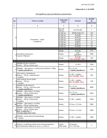 KF 236-5/11/PN Załącznik nr 1 do SIWZ Szczegółowy opis przedmiotu zamówienia Lp. Nazwa wyrobu Jednostka miary Format ILOŚĆ do zamówienia 1 2 3 4 5 2 x A-4 (2) 1 2/3 A-4 (2) x 2 A-3 (2) A-4 (1) A-4 (2) A-5(1) A-6 (1) A-6 (2) 129 60 2 5 10 12 14 A-3 (2) A-4 CZYSTY A-4 (2) WG WZORU NR 1 575 1 Formularze – druki na papierze bloczek 100 szt. bl.100 szt. bl.100 szt. bl.100 szt. bl.100 szt. bl.100 szt. bl.100 szt. bl.100 szt. Sztuka 2 Formularze kartonowe ( karton 190g/m2) Sztuka Sztuka 5000 100 3 Okładka do akt cywilnych (karton – 300 gr, zielony pas) Sztuka 4 Okładka – akta sprawy o wykroczenie (karton)- 250gr. + wpinka plastikowa Sztuka 55 x 35 cm + wpinka plastikowa 5500 Sztuka 2 x B4 + wpinka WG WZORU NR 2 300 Sztuka 2 x B4 + wpinka WG WZORU NR 3 100 Sztuka 55 x 35 cm + wpinka plastikowa 4000 Sztuka 55 x 35 cm + wpinka plastikowa 6500 Sztuka 2 x B4 + wpinka 6500 Sztuka 47,5cm x 31,5cm 5000 Sztuka 47,5cm x 31,5cm 5000 1000 Akta sprawy opiekuńczej 5 (karton – 250 gr., niebieski pas) + wpinka Akta kontroli okresu próby 6 (karton – 250 gr.) + wpinka Okładka do akt karnych 7 (karton – 250 gr., czerwony pas) + wpinka plastikowa Okładka – akta sprawy cywilnej 8 (karton – 250 gr, zielony pas) + wpinka plastikowa Okładka – akta sprawy cywilnej 9 (karton – 250 gr, zielony pas) + wpinka Okładka – akta sprawy cywilnej 10 (karton – 250 gr, zielony pas) Okładka – akta sprawy cywilnej (karton – 250 gr, zielony pas) 11 BEZ NADRUKU !! TYLKO ZIELONY PAS 2 x B-4 12 Okładka- teczka dozoru kuratorskiego + wpinka Sztuka 2 x B4 + wpinka 13 Koperta z nadrukiem adresowym (samoprzylepna) z potwierdzeniem odbioru do spraw cywilnych karton 1000 sztuk C6 koperta 114 x 162 mm 2500 2 14 Koperta z nadrukiem adresowym (samoprzylepna) z potwierdzeniem odbioru do spraw karnych Koperta czysta (samoprzylepna) z potwierdzeniem 15 odbioru – jednostronny nadruk - do komputera - do spraw cywilnych karton 1000 sztuk C6 koperta 114 x 162 mm 2 karton 1000 sztuk C6 koperta 114 x 162 mm WG WZORU NR 6 99 16 Potwierdzenie odbioru ( cywilne) – karton 140gr. Z taśmą samoprzylepną bloczek100 kartkowy A6 (2) 5 17 Potwierdzenie odbioru (karne) – karton 140gr. Z taśmą samoprzylepną bloczek100 kartkowy A6 (2) 63 bloczek100 kartkowy A6 (1) 177 bloczek100 kartkowy A6 (1) 474 Potwierdzenia odbioru do komputera (jednostronny nadruk) 18 - karton 140 gr. cywilne – z taśmą samoprzylepną na stronie niezadrukowanej Potwierdzenia odbioru do komputera (jednostronny nadruk) 19 – karton 140 gr. karne - z taśmą samoprzylepną na stronie niezadrukowanej szt. 20 Urządzenia ewidencyjne ( książkowe, twarda oprawaintroligatorska , okucia metalowe, szyte, numerowane ) szt. szt. A-4 50 kart. WG WZORU NR 4 A-4 100 kart. A-4 200 kartk. 1 szt. – -WG WZORU NR 5 1 1 6 Legitymacja kuratora społecznego szt. A6 50 Legitymacja służbowa dla pracowników z napisem i godłem (oprawa szt. A6 50 21 (oprawa w introligatorska) 22 introligatorska) INFORMACJE DODATKOWE: OPIS: 1. Okładka do akt o wymiarach 55 x 35cm + wpinka plastikowa - to okładka, która jest wgięta w środek , uzyskując w ten sposób wystający grzbiet w środku, do którego przytwierdzona jest wpinka plastikowa tzw. klips archiwizacyjny (opisany niżej). Okładka rozłożona ma wymiary 55 x 35zm, po złożeniu w sposób opisany wyżej ma wymiary 2 x B4. Wpinka plastikowa – to klips archiwizacyjny, dwuczęściowy, plastikowy przeznaczony do archiwizacji dokumentów, umożliwia szybkie i łatwe i wielokrotne dokładanie dokumentów;. 2. Okładka do akt o wymiarach 2 x B4 + wpinka - to okładka zgięta w pół z metalową blaszką i wąsami , które winny być przymocowane przy spojeniu z okładką w sposób trwały np. poprzez wklejenie dodatkowego paska wzmacniającego wytrzymałość. 3. Koperty z nadrukiem i potwierdzenia odbioru – a) wzory nadruku na kopercie oraz na potwierdzeniu odbioru powinny spełniać wymogi zatwierdzone i opracowane oraz ogłoszone przez Ministerstwo Sprawiedliwości. Wszelkie zmiany wzoru w trakcie realizacji umowy winny zostać niezwłocznie stosowane.; b) koperta czysta (samoprzylepna) z potwierdzeniem odbioru – jednostronny nadruk - do komputera - do spraw cywilnych – sklejenie zwrotki z kopertą winno być na stronie gdzie skleja się kopertę; wielkość po złożeniu koperty ze zwrotką nie powinna się różnić; UWAGA! W zależności od potrzeb, Zamawiający może zmieniać ilości zamawianych produktów w poszczególnych pozycjach przedmiotu zamówienia przy zachowaniu cen jednostkowych produktów podanych w ofercie oraz limitu maksymalnej ceny zamówienia ( przy czym zaokrąglenia będą korzystne dla Zamawiającego). Zmiany takiej będzie można dokonać przez doręczenie Wykonawcy stosownego oświadczenia.