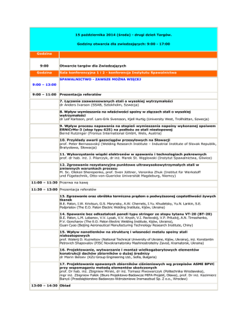 15 października 2014 (środa) - drugi dzień Targów. Godziny otwarcia dla zwiedzających: 9:00 - 17:00 Godzina 9:00 Godzina Otwarcie targów dla Zwiedzających Sala konferencyjna 1 i 2 - konferencja Instytutu Spawalnictwa SPAWALNICTWO - ZAWSZE MOŻNA WIĘCEJ 9:00 – 13:00 9:00 – 11:00 Prezentacja referatów 7. Łączenie zaawansowanych stali o wysokiej wytrzymałości dr Anders Ivarson (SSAB, Sztokholm, Szwecja) 8. Wpływ wymieszania na właściwości spoiny w złączach stali o wysokiej wytrzymałości dr Leif Karlsson, prof. Lars-Erik Svensson, Kjell Hurtig (University West, Trollhättan, Szwecja) 9. Wpływ procesu napawania na stopień wymieszania napoiny wykonanej spoiwem ERNiCrMo-3 (stop typu 625) na podłożu ze stali niestopowej Bernd Rutzinger (Fronius International GmbH, Wels, Austria) 10. Przykłady awarii gazociągów przesyłowych na Słowacji prof. Peter Bernasovský (Welding Research Institute – Industrial Institute of Slovak Republik, Bratysława, Słowacja) 11. Wykorzystanie wiązki elektronów w spawaniu i technologiach pokrewnych prof. dr hab. inż. J. Pilarczyk, dr inż. Marek St. Węglowski (Instytut Spawalnictwa, Gliwice) 12. Zgrzewanie rezystancyjne punktowe ultrawysokowytrzymałych stali w zmiennych warunkach procesu M. Sc. Oleksii Sherepenko, prof. Sven Jüttner, Veronika Zhuk (Institut für Werkstoff und Fügetechnik, Otto-von-Guericke Universität Magdeburg, Niemcy) 11:00 – 11:30 Przerwa na kawę 11:30 – 13:00 Prezentacja referatów 13. Zgrzewanie oraz obróbka termiczna prądem o podwyższonej częstotliwości żywych tkanek B.E. Paton, I.W. Krivtsun, G.S. Marynsky, A.W. Chernets, I.Yu. Khudetsky, Yu.N. Lankin, S.E. Podpriatov (The E.O. Paton Electric Welding Institute, Kijów, Ukraina) 14. Spawanie bez odkształceń paneli typu stringer ze stopu tytanu VT-20 (ВТ-20) B.E. Paton, L.M. Lobanov, V.V. Lysak, V.V. Knysh, V.I. Pavlovskij, V.P. Priluckij, A.N. Timoshenko, P.V. Goncharov (The E.O. Paton Electric Welding Institute, Kijów, Ukraina), Guan Cyao (Beijing Aeronautical Manufacturing Technology Research Institute, Chiny) 15. Wpływ nanotlenków na strukturę i własności metalu spoiny stali niskostopowych prof. Walerij D. Kuznetsov (National Technical University of Ukraine, Kijów, Ukraina), inż. Konstantin Petrovich Shapovalov (PJSC Novokramatorsky Mashinostroitelny Zavod, Kramatorsk, Ukraina) 16. Projektowanie, wytwarzanie i montaż wielkogabarytowych elementów konstrukcji dachów zbiorników o dużej średnicy dr Marin Beloev (KZU Group Engineering Ltd., Sofia, Bułgaria) 17. Projektowanie spawanych zbiorników ciśnieniowych wg przepisów ASME BPVC przy wspomaganiu metodą elementów skończonych prof. Dr hab. inż. Zbigniew Mirski, dr inż. Tomasz Piwowarczyk (Politechnika Wrocławska), mgr inż. Zbigniew Fałek (Biuro Projektowo-Badawcze MIFA-Projekt, Oława), prof. Dr inż. Kazimierz Banyś (Przedsiębiorstwo Badawczo-Wdrożeniowe Insmaszbud Sp. Z o.o., Wrocław) 13:00 – 14:30 Obiad 13:00 – 17:00 Zwiedzanie Targów Godzina Sala konferencyjna na pawilonie Expo Silesia - konferencja czasopisma Promotor BHP, wydawnictwo Elamed „BEZPIECZNA PRACA SPAWACZA” 9:00 10:00 Rejestracja uczestników konferencji (strefa wejścia na halę) Rozpoczęcie konferencji PROGRAM 1. Narażenie na promieniowanie optyczne podczas prac spawalniczych 2. BHP przy nowoczesnych metodach spawania ze szczególnym uwzględnieniem spawania laserowego z chłodzeniem mikro-jetowym Przykładowe nieprawidłowości związane z organizacją stanowiska pracy spawacza Odzież ochronna dla spawacza – na co zwrócić uwagę? Optymalizacja zarządzaniem środkami ochrony indywidualnej Ochrona dróg oddechowych spawacza – profilaktyka Środki chroniące twarz i oczy przy spawaniu Rękawice dla prac spawalniczych – jak je odpowiednio dobrać? Wypadki przy pracy podczas wykonywania prac spawalniczych PRELEGENCI 3. 4. 5. 6. 7. 8. 9. 1. dr n. przyr. Stanisław Marzec – kierownik Zakładu Szkodliwości Fizycznych, Godzina 14.30 kierownik Pracowni Promieniowania Niejonizującego, Instytut Medycyny Pracy – Sosnowiec 2. Dariusz Sroga, starszy inspektor pracy, Okręgowy Inspektorat Pracy w Katowicach 3. prof nzw., dr hab. inż. Tomasz Węgrzyn – prof. Nzw. W Pol. Śl., profesor nadzwyczajny w Wyższej Szkole Zarządzania i Ochroną Pracy w Katowicach, profesor nadzwyczajny Politechniki Śląskiej Sala konferencyjna 1 i 2 – konferencja Konferencja firmy TÜV Rheinland Polska Sp. z o.o. 1. Zaawansowane metody NDT wykorzystywane w przemyśle – mgr inż. Grzegorz Dąbrowski – Rzeczoznawca TÜV. 2. Certyfikacja zakładów produkcyjnych według przepisów ASME – mgr inż. Marcin Filus – Rzeczoznawca TÜV. 3. Certyfikacja wytwórców konstrukcji stalowych na zgodność z wymaganiami EN 1090 – mgr inż. Leszek Zadroga - Rzeczoznawca TÜV. Rozwiązania dla branży spawalniczej Godzina 17:00 Zamknięcia drugiego dnia Targów