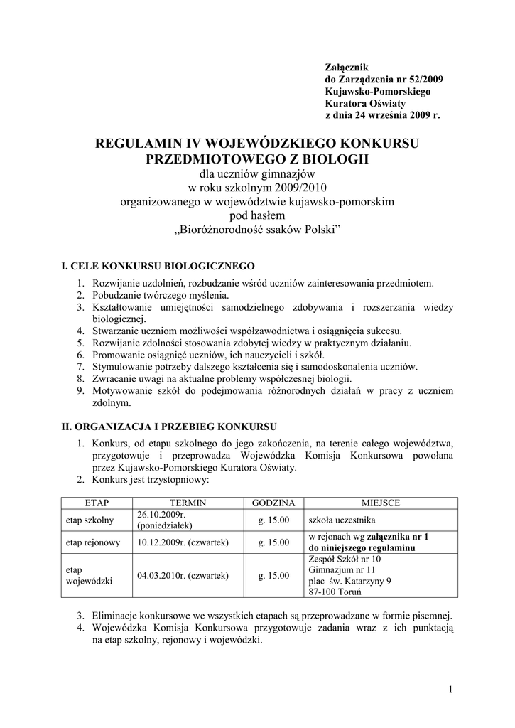 Załącznik do Zarządzenia nr 52/2009 Kujawsko-Pomorskiego Kuratora Oświaty z dnia 24 września 2009 r. REGULAMIN IV WOJEWÓDZKIEGO KONKURSU PRZEDMIOTOWEGO Z BIOLOGII dla uczniów gimnazjów w roku szkolnym 2009/2010 organizowanego w województwie kujawsko-pomorskim pod hasłem „BioróŜnorodność ssaków Polski” I. CELE KONKURSU BIOLOGICZNEGO 1. Rozwijanie uzdolnień, rozbudzanie wśród uczniów zainteresowania przedmiotem. 2. Pobudzanie twórczego myślenia. 3. Kształtowanie umiejętności samodzielnego zdobywania i rozszerzania wiedzy biologicznej. 4. Stwarzanie uczniom moŜliwości współzawodnictwa i osiągnięcia sukcesu. 5. Rozwijanie zdolności stosowania zdobytej wiedzy w praktycznym działaniu. 6. Promowanie osiągnięć uczniów, ich nauczycieli i szkół. 7. Stymulowanie potrzeby dalszego kształcenia się i samodoskonalenia uczniów. 8. Zwracanie uwagi na aktualne problemy współczesnej biologii. 9. Motywowanie szkół do podejmowania róŜnorodnych działań w pracy z uczniem zdolnym. II. ORGANIZACJA I PRZEBIEG KONKURSU 1. Konkurs, od etapu szkolnego do jego zakończenia, na terenie całego województwa, przygotowuje i przeprowadza Wojewódzka Komisja Konkursowa powołana przez Kujawsko-Pomorskiego Kuratora Oświaty. 2. Konkurs jest trzystopniowy: ETAP etap szkolny TERMIN 26.10.2009r. (poniedziałek) GODZINA g. 15.00 etap rejonowy 10.12.2009r. (czwartek) g. 15.00 etap wojewódzki 04.03.2010r. (czwartek) g. 15.00 MIEJSCE szkoła uczestnika w rejonach wg załącznika nr 1 do niniejszego regulaminu Zespół Szkół nr 10 Gimnazjum nr 11 plac św. Katarzyny 9 87-100 Toruń 3. Eliminacje konkursowe we wszystkich etapach są przeprowadzane w formie pisemnej. 4. Wojewódzka Komisja Konkursowa przygotowuje zadania wraz z ich punktacją na etap szkolny, rejonowy i wojewódzki. 1 5. W kaŜdym etapie uczestnicy rozwiązują zadania zamknięte i otwarte o róŜnym stopniu trudności. 6. Konkurs przeprowadza się w wydzielonych salach z uwzględnieniem zasady samodzielności. Część pisemną eliminacji przeprowadza się anonimowo, a prace są kodowane. 7. We wszystkich etapach konkursu w sali mogą przebywać wyłącznie uczestnicy, członkowie komisji konkursowej oraz obserwatorzy z ramienia Kuratora Oświaty. W składzie komisji nie moŜe zasiadać nauczyciel, który jest rodzicem uczestnika danego etapu konkursu. 8. Niestawienie się ucznia o godzinie rozpoczęcia konkursu oznacza rezygnację z udziału w konkursie. 9. KaŜdy uczestnik jest zobowiązany mieć ze sobą waŜną legitymację szkolną. 10. W etapie rejonowym konkursu moŜe wziąć udział co najwyŜej 400 uczestników konkursu, którzy uzyskali najwyŜszą liczbę punktów w etapie szkolnym, jednak nie mniej niŜ 65% punktów moŜliwych do uzyskania. 11. W etapie wojewódzkim konkursu moŜe wziąć udział co najwyŜej 100 uczestników konkursu, którzy uzyskali najwyŜszą liczbę punktów w etapie rejonowym, jednak nie mniej niŜ 75% punktów moŜliwych do uzyskania. 12. Tytuł laureata konkursu otrzymuje 40 uczestników konkursu, którzy uzyskali najwyŜszą liczbę punktów w etapie wojewódzkim, jednak nie mniej niŜ 80% punktów moŜliwych do uzyskania, a takŜe ci uczestnicy, którzy zdobyli identyczną liczbę punktów, jaką uzyskał czterdziesty finalista. JeŜeli jednak liczba laureatów jest mniejsza niŜ 10% uczniów biorących udział w finale konkursu wówczas naleŜy przyjąć, Ŝe laureatami zostają uczniowie, którzy uzyskali 80% ze średniej arytmetycznej punktów zdobytych przez pierwszych trzech uczniów z najlepszymi wynikami. 13. Sprawy nieuregulowane w niniejszym regulaminie rozstrzyga przewodniczący właściwej komisji konkursowej. II.1. Organizacja i przebieg etapu szkolnego 1) Eliminacje konkursowe stopnia szkolnego, na własny koszt, przeprowadzają szkolne komisje konkursowe. 2) Eliminacje szkolne odbywają się dnia 26 października 2009 roku, o godz.15.00. Czas trwania eliminacji szkolnych: 60 minut. 3) Udział uczniów w konkursie jest dobrowolny. W etapie szkolnym konkursu mogą brać udział wszyscy uczniowie zainteresowani konkursem. 4) Czas pracy uczniów zaczyna liczyć się od chwili otrzymania przez nich arkusza z zadaniami. 5) Do zadań dyrektora szkoły naleŜy: a) udzielanie uczniom, nauczycielom i rodzicom (prawnym opiekunom) informacji o organizacji Konkursu, jego terminie i zasadach udziału; b) powołanie (w formie pisemnej) Szkolnej Komisji Konkursowej zgodnie z załącznikiem nr 3 do Regulaminu ogólnego konkursów w r. szk. 2009/2010; c) zabezpieczenie odpowiedniej ilości materiałów (w zaleŜności od liczby uczniów przystępujących do etapu szkolnego): stosownych ilości papieru do kopiowania kart z zadaniami dla kaŜdego ucznia oraz papieru do rozwiązywania zadań i udzielania odpowiedzi; d) przestrzeganie tajności, terminów i procedury przeprowadzania szkolnego etapu konkursu przedmiotowego; 2 e) zapewnienie uczniom moŜliwości przystąpienia do konkursów w innej szkole, jeśli nie jest organizowany konkurs w szkole macierzystej; f) stworzenie uczniom odpowiednich warunków do spokojnej i samodzielnej pracy; g) odebranie 20 października 2009 r. od godz. 12.00 do 15.00 odpowiednio w Kuratorium Oświaty w Bydgoszczy, Delegaturze w Toruniu lub w Delegaturze we Włocławku płyty CD z zadaniami i kluczem odpowiedzi. Klucz odpowiedzi dyrektor deponuje w sejfie szkoły; h) przekazanie przewodniczącemu Szkolnej Komisji Konkursowej, po uprzednim zobowiązaniu go do zachowania tajności, materiałów konkursowych, karty zadań konkursowych do skopiowania dla kaŜdego ucznia i przyjęcie ich do przechowania do czasu rozpoczęcia etapu szkolnego; i) udostępnienie skopiowanych kart zadań w dniu przeprowadzania konkursu o wyznaczonej godzinie przewodniczącemu Szkolnej Komisji Konkursowej; j) zgłoszenie uczniów na karcie zgłoszenia (załącznik nr 5 do Regulaminu ogólnego konkursów w r. szk. 2009/2010) w wersji elektronicznej oraz pisemnej wraz z pr