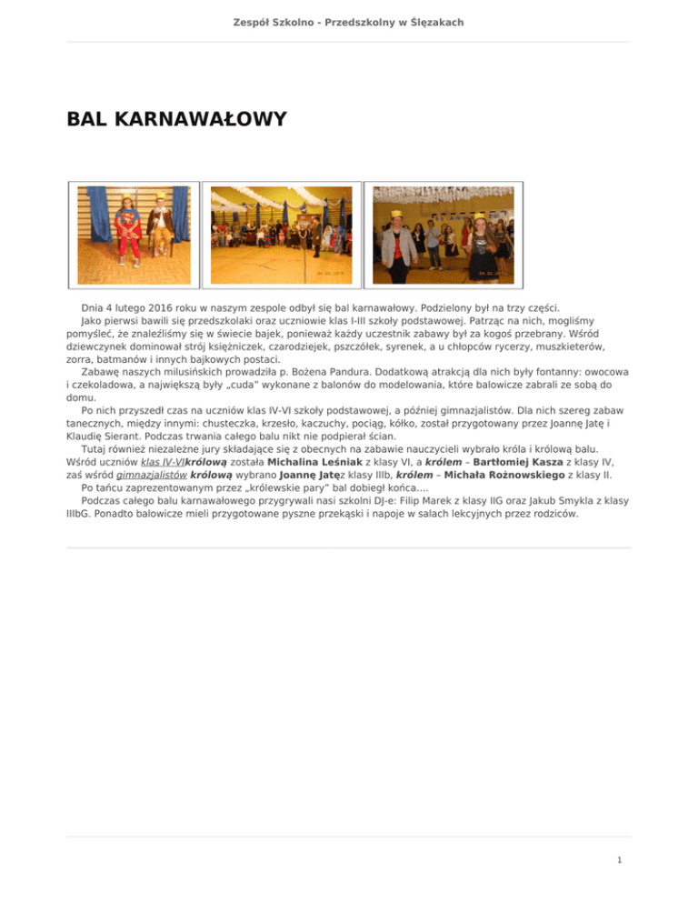 Zespół Szkolno - Przedszkolny w Ślęzakach BAL KARNAWAŁOWY Dnia 4 lutego 2016 roku w naszym zespole odbył się bal karnawałowy. Podzielony był na trzy części. Jako pierwsi bawili się przedszkolaki oraz uczniowie klas I-III szkoły podstawowej. Patrząc na nich, mogliśmy pomyśleć, że znaleźliśmy się w świecie bajek, ponieważ każdy uczestnik zabawy był za kogoś przebrany. Wśród dziewczynek dominował strój księżniczek, czarodziejek, pszczółek, syrenek, a u chłopców rycerzy, muszkieterów, zorra, batmanów i innych bajkowych postaci. Zabawę naszych milusińskich prowadziła p. Bożena Pandura. Dodatkową atrakcją dla nich były fontanny: owocowa i czekoladowa, a największą były „cuda” wykonane z balonów do modelowania, które balowicze zabrali ze sobą do domu. Po nich przyszedł czas na uczniów klas IV-VI szkoły podstawowej, a później gimnazjalistów. Dla nich szereg zabaw tanecznych, między innymi: chusteczka, krzesło, kaczuchy, pociąg, kółko, został przygotowany przez Joannę Jatę i Klaudię Sierant. Podczas trwania całego balu nikt nie podpierał ścian. Tutaj również niezależne jury składające się z obecnych na zabawie nauczycieli wybrało króla i królową balu. Wśród uczniów klas IV-VIkrólową została Michalina Leśniak z klasy VI, a królem – Bartłomiej Kasza z klasy IV, zaś wśród gimnazjalistów królową wybrano Joannę Jatęz klasy IIIb, królem – Michała Rożnowskiego z klasy II. Po tańcu zaprezentowanym przez „królewskie pary” bal dobiegł końca…. Podczas całego balu karnawałowego przygrywali nasi szkolni DJ-e: Filip Marek z klasy IIG oraz Jakub Smykla z klasy IIIbG. Ponadto balowicze mieli przygotowane pyszne przekąski i napoje w salach lekcyjnych przez rodziców. 1