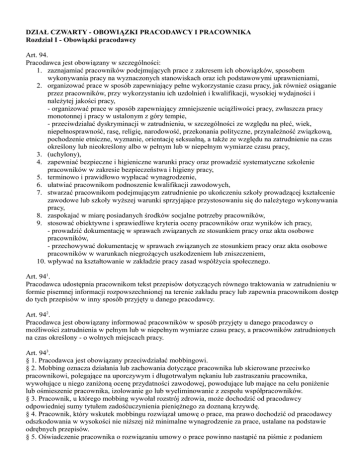 DZIAŁ CZWARTY - OBOWIĄZKI PRACODAWCY I PRACOWNIKA Rozdział I - Obowiązki pracodawcy Art. 94. Pracodawca jest obowiązany w szczególności: 1. zaznajamiać pracowników podejmujących prace z zakresem ich obowiązków, sposobem wykonywania pracy na wyznaczonych stanowiskach oraz ich podstawowymi uprawnieniami, 2. organizować prace w sposób zapewniający pełne wykorzystanie czasu pracy, jak również osiąganie przez pracowników, przy wykorzystaniu ich uzdolnień i kwalifikacji, wysokiej wydajności i należytej jakości pracy, - organizować prace w sposób zapewniający zmniejszenie uciążliwości pracy, zwłaszcza pracy monotonnej i pracy w ustalonym z góry tempie, - przeciwdziałać dyskryminacji w zatrudnieniu, w szczególności ze względu na płeć, wiek, niepełnosprawność, rasę, religię, narodowość, przekonania polityczne, przynależność związkową, pochodzenie etniczne, wyznanie, orientację seksualną, a także ze względu na zatrudnienie na czas określony lub nieokreślony albo w pełnym lub w niepełnym wymiarze czasu pracy, 3. (uchylony), 4. zapewniać bezpieczne i higieniczne warunki pracy oraz prowadzić systematyczne szkolenie pracowników w zakresie bezpieczeństwa i higieny pracy, 5. terminowo i prawidłowo wypłacać wynagrodzenie, 6. ułatwiać pracownikom podnoszenie kwalifikacji zawodowych, 7. stwarzać pracownikom podejmującym zatrudnienie po ukończeniu szkoły prowadzącej kształcenie zawodowe lub szkoły wyższej warunki sprzyjające przystosowaniu się do należytego wykonywania pracy, 8. zaspokajać w miarę posiadanych środków socjalne potrzeby pracowników, 9. stosować obiektywne i sprawiedliwe kryteria oceny pracowników oraz wyników ich pracy, - prowadzić dokumentację w sprawach związanych ze stosunkiem pracy oraz akta osobowe pracowników, - przechowywać dokumentację w sprawach związanych ze stosunkiem pracy oraz akta osobowe pracowników w warunkach niegrożących uszkodzeniem lub zniszczeniem, 10. wpływać na kształtowanie w zakładzie pracy zasad współżycia społecznego. Art. 941. Pracodawca udostępnia pracownikom tekst przepisów dotyczących równego traktowania w zatrudnieniu w formie pisemnej informacji rozpowszechnionej na terenie zakładu pracy lub zapewnia pracownikom dostęp do tych przepisów w inny sposób przyjęty u danego pracodawcy. Art. 942. Pracodawca jest obowiązany informować pracowników w sposób przyjęty u danego pracodawcy o możliwości zatrudnienia w pełnym lub w niepełnym wymiarze czasu pracy, a pracowników zatrudnionych na czas określony - o wolnych miejscach pracy. Art. 943. § 1. Pracodawca jest obowiązany przeciwdziałać mobbingowi. § 2. Mobbing oznacza działania lub zachowania dotyczące pracownika lub skierowane przeciwko pracownikowi, polegające na uporczywym i długotrwałym nękaniu lub zastraszaniu pracownika, wywołujące u niego zaniżoną ocenę przydatności zawodowej, powodujące lub mające na celu poniżenie lub ośmieszenie pracownika, izolowanie go lub wyeliminowanie z zespołu współpracowników. § 3. Pracownik, u którego mobbing wywołał rozstrój zdrowia, może dochodzić od pracodawcy odpowiedniej sumy tytułem zadośćuczynienia pieniężnego za doznaną krzywdę. § 4. Pracownik, który wskutek mobbingu rozwiązał umowę o prace, ma prawo dochodzić od pracodawcy odszkodowania w wysokości nie niższej niż minimalne wynagrodzenie za prace, ustalane na podstawie odrębnych przepisów. § 5. Oświadczenie pracownika o rozwiązaniu umowy o prace powinno nastąpić na piśmie z podaniem przyczyny, o której mowa w § 2, uzasadniającej rozwiązanie umowy. Art. 95. (uchylony). Art. 96. (uchylony). Art. 97. § 1. W związku z rozwiązaniem lub wygaśnięciem stosunku pracy pracodawca jest obowiązany niezwłocznie wydać pracownikowi świadectwo pracy. Wydanie świadectwa pracy nie może być uzależnione od uprzedniego rozliczenia się pracownika z pracodawcą. § 11. W przypadku rozwiązania lub wygaśnięcia umowy o prace z pracownikiem, z którym dotychczasowy pracodawca nawiązuje kolejną umowę o prace bezpośrednio po rozwiązaniu lub wygaśnięciu poprzedniej umowy o prace, pracodawca jest obowiązany wydać pracownikowi świadectwo pracy, tylko na jego żądanie. § 2. W świadectwie pracy należy podać informacje dotyczące okresu i rodzaju wykonywanej pracy, zajmowanych stanowisk, trybu rozwiązania albo okoliczności wygaśnięcia stosunku pracy, a także inne informacje niezbędne do ustalenia uprawnień pracowniczych i uprawnień z ubezpieczenia społecznego. Ponadto w świadectwie pracy zamieszcza się wzmiankę o zajęciu wynagrodzenia za prace w myśl przepisów o postępowaniu egzekucyjnym. Na żądanie pracownika w świadectwie pracy należy podać także informację o wysokości i składnikach wynagrodzenia oraz o uzyskanych kwalifikacjach. § 21. Pracownik może w ciągu 7 dni od otrzymania świadectwa pracy wystąpić z wnioskiem do pracodawcy o sprostowanie świadectwa. W razie nieuwzględnienia wniosku pracownikowi przysługuje, w ciągu 7 dni od zawiadomienia o odmowie sprostowania świadectwa pracy, prawo wystąpienia z żądaniem jego sprostowania do sądu pracy. § 3. Jeżeli z orzeczenia sądu pracy wynika, że rozwiązanie z pracownikiem umowy o prace bez wypowiedzenia z jego winy nastąpiło z naruszeniem przepisów o rozwiązywaniu w tym trybie umów o prace, pracodawca jest obowiązany zamieścić w świadectwie pracy informację, że rozwiązanie umowy o prace nastąpiło za wypowiedzeniem dokonanym przez pracodawcę. § 4. Minister Pracy i Polityki Socjalnej określi, w drodze rozporządzenia, szczegółową treść świadectwa pracy oraz sposób i tryb jego wydawania i prostowania. Art. 98. (uchylony). Art. 99. § 1. Pracownikowi przysługuje roszczenie o naprawienie szkody wyrządzonej przez pracodawcę wskutek niewydania w terminie lub wydania niewłaściwego świadectwa pracy. § 2. Odszkodowanie, o którym mowa w