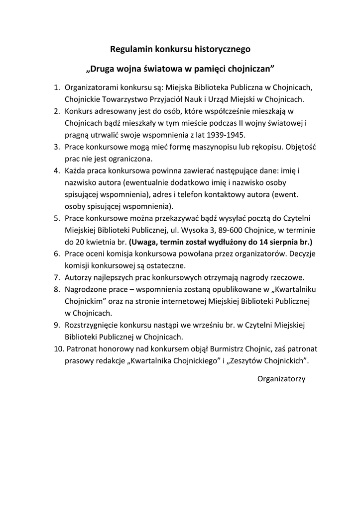 Regulamin konkursu historycznego „Druga wojna światowa w pamięci chojniczan” 1. Organizatorami konkursu są: Miejska Biblioteka Publiczna w Chojnicach, Chojnickie Towarzystwo Przyjaciół Nauk i Urząd Miejski w Chojnicach. 2. Konkurs adresowany jest do osób, które współcześnie mieszkają w Chojnicach bądź mieszkały w tym mieście podczas II wojny światowej i pragną utrwalić swoje wspomnienia z lat 1939-1945. 3. Prace konkursowe mogą mieć formę maszynopisu lub rękopisu. Objętość prac nie jest ograniczona. 4. Każda praca konkursowa powinna zawierać następujące dane: imię i nazwisko autora (ewentualnie dodatkowo imię i nazwisko osoby spisującej wspomnienia), adres i telefon kontaktowy autora (ewent. osoby spisującej wspomnienia). 5. Prace konkursowe można przekazywać bądź wysyłać pocztą do Czytelni Miejskiej Biblioteki Publicznej, ul. Wysoka 3, 89-600 Chojnice, w terminie do 20 kwietnia br. (Uwaga, termin został wydłużony do 14 sierpnia br.) 6. Prace oceni komisja konkursowa powołana przez organizatorów. Decyzje komisji konkursowej są ostateczne. 7. Autorzy najlepszych prac konkursowych otrzymają nagrody rzeczowe. 8. Nagrodzone prace – wspomnienia zostaną opublikowane w „Kwartalniku Chojnickim” oraz na stronie internetowej Miejskiej Biblioteki Publicznej w Chojnicach. 9. Rozstrzygnięcie konkursu nastąpi we wrześniu br. w Czytelni Miejskiej Biblioteki Publicznej w Chojnicach. 10. Patronat honorowy nad konkursem objął Burmistrz Chojnic, zaś patronat prasowy redakcje „Kwartalnika Chojnickiego” i „Zeszytów Chojnickich”. Organizatorzy