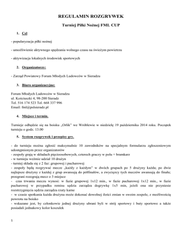 REGULAMIN ROZGRYWEK Turniej Piłki Nożnej FML CUP 1. Cel - popularyzacja piłki nożnej - umożliwienie aktywnego spędzania wolnego czasu na świeżym powietrzu - aktywizacja lokalnych środowisk sportowych 2. Organizatorzy: - Zarząd Powiatowy Forum Młodych Ludowców w Sieradzu 3. Biuro organizacyjne: Forum Młodych Ludowców w Sieradzu ul. Kościuszki 4, 98-200 Sieradz Tel. 516 174 523 Tel. 668 337 996 Email: [email protected] 4. Miejsce i termin. Turnieje odbędzie się na boisku „Orlik” we Wróblewie w niedzielę 19 października 2014 roku. Początek turnieju o godz. 13.00 5. System rozgrywek i przepisy gry. - do turnieju można zgłosić maksymalnie 10 zawodników na specjalnym formularzu zgłoszeniowym udostępnionym przez organizatorów - zespoły grają w składach pięcioosobowych, czterech graczy w polu + bramkarz - w turnieju weźmie udział 10 drużyn - turniej składa się z 2 faz: grupowej i pucharowej - zespoły będą rozgrywać mecze „każdy z każdym” w dwóch grupach po 5 drużyny każda; po dwie najlepsze drużyny z każdej z grup awansują do półfinałów, a zwycięzcy tych meczów awansują do finału; przegrani rozegrają mecz o 3 miejsce - czas trwania meczu wynosi: w fazie grupowej 1x12 min., w fazie pucharowej 1x12 min., w fazie pucharowej w przypadku remisu sędzia zarządza dogrywkę 1x5 min, jeżeli ona nie przyniesie rozstrzygnięcia sędzia zarządza rzuty karne - w czasie spotkania każda drużyna może dokonać dowolnej ilości zmian w swoim zespole, z możliwością powrotu na boisko - wskazane jest, by członkowie jednej drużyny ubrani byli w strój sportowy i buty sportowe a także posiadali jednakowy kolor koszulek 1 - kolejność drużyny w fazie grupowej ustala się wg przepisów gry w piłkę nożną zwycięski zespół otrzymuje 3 pkt , remis 1 pkt., porażka 0 pkt. - wyniki w grupach ustala wg następujących zasad: ilość zdobytych punktów, wynik bezpośredniego pojedynku ( dotyczy w przypadku uzyskania przez dwie drużyny takiej samej ilości punktów), korzystniejsza różnica bramek , większa ilość strzelonych bramek, rezultat pomocniczych rzutów karnych, w przypadku gdy żadne z powyższych kryteriów okazały się nie wystarczające, o kolejności drużyn w tabeli decydować będzie losowanie, dla więcej niż dwóch drużyn z jednakową ilością punktów tworzy się małą tabelę z zainteresowanymi zespołami, - każda Drużyna musi mieć swoją nazwę oraz Kapitana – jedyna osoba uprawiona do kontaktów z Organizatorem przed, w trakcie oraz po zakończeniu Turnieju; kapitan drużyny odpowiada za cały swój zespół - w rozgrywkach obowiązują kary upomnienia: 1 min, 2 min, całkowite wykluczenie; w przypadku niesportowego zachowania zawodnik może być odsunięty od trzech spotkań lub całkowicie wykluczony z rozgrywek 6. Zgłoszenia i losowanie. Zgłoszenie chęci uczestnictwa w turnieju uczestnik dokonuje wypełniając formularz „Karty Zgłoszenia Drużyny” i dostarczając organizatorowi nie później niż dzień przed rozpoczęciem turnieju. Odprawa techniczna połączona z losowaniem odbędzie się w terminie podanym przez organizatora nie później niż 30 minut przed rozpoczęciem turnieju. Organizowany turniej jest turniejem amatorskim. Dopuszcza się możliwość zgłoszenia przez drużynę maksymalnie 2 zawodników zrzeszonych w klubach sportowych grających w klasie okręgowej bądź niższej. W dniu turnieju zostanie przeprowadzona odprawa w której będą uczestniczyli: organizatorzy, sędziowie i kapitanowie drużyn. 7. Organizatorzy zabezpieczają: - obsługę sędziowską i techniczną - prowadzenie dokumentacji rozgrywek - nagrody w postaci pucharów, nagród rzeczowych i dyplomów 8. Postanowienia końcowe: - organizator ma prawo do odwołania Turnieju ze względu na złe warunki atmosferyczne bądź z innych nieprzewidzianych powodów - o sprawach nie ujętych w niniejszym regulaminie decyduje Organizator - ostateczna interpretacja regulaminu należy do organizatora - własnoręcznym podpis zawodnika karcie zgłoszenia jest równoznaczny ze stwierdzeniem dobrego stanu zdrowia - drużyny ubezpieczają się na swój koszt 2