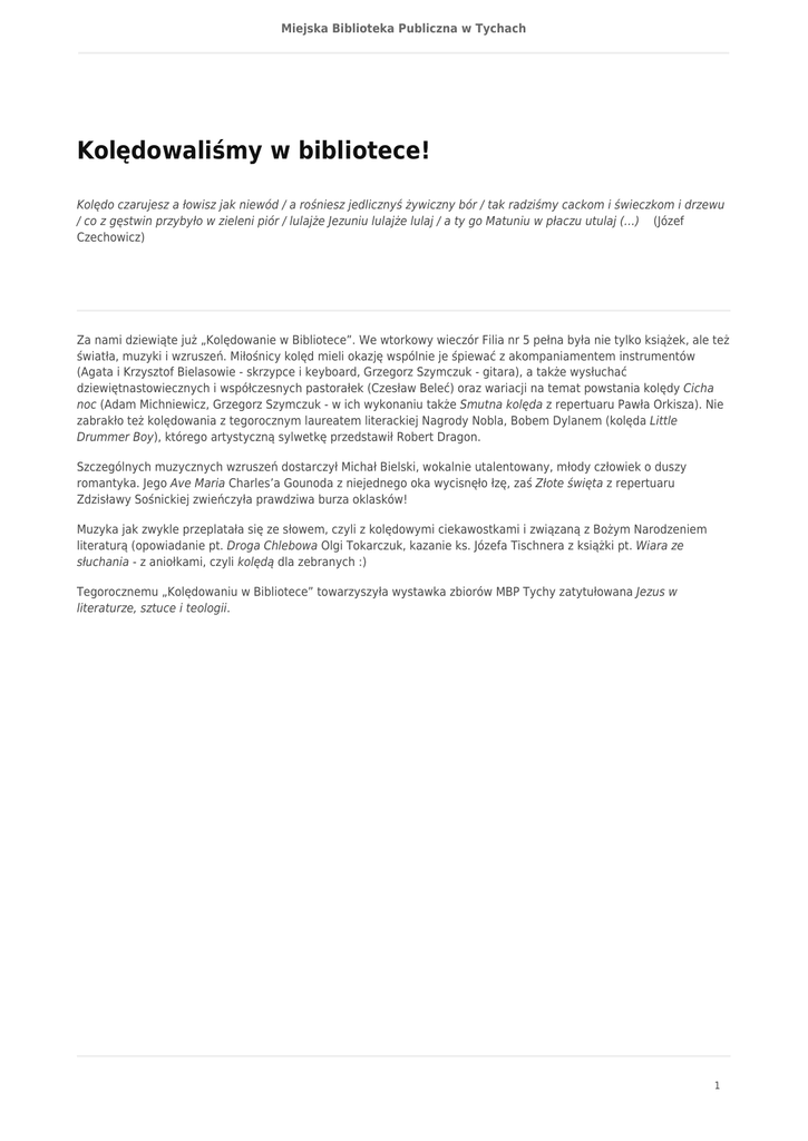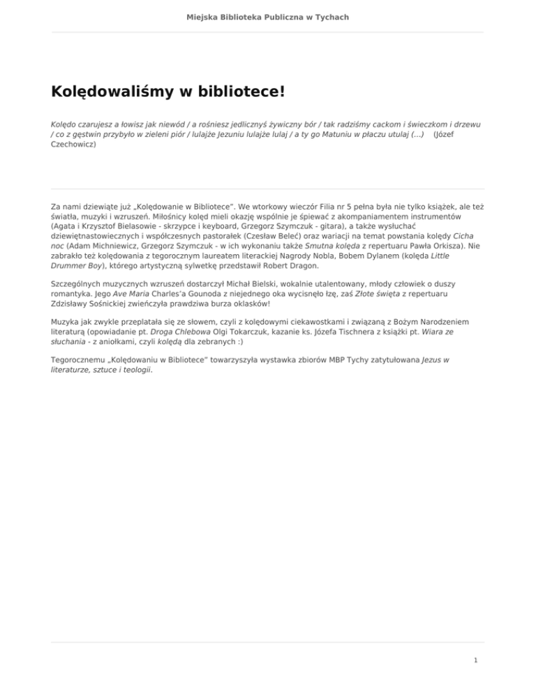 Miejska Biblioteka Publiczna w Tychach Kolędowaliśmy w bibliotece! Kolędo czarujesz a łowisz jak niewód / a rośniesz jedlicznyś żywiczny bór / tak radziśmy cackom i świeczkom i drzewu / co z gęstwin przybyło w zieleni piór / lulajże Jezuniu lulajże lulaj / a ty go Matuniu w płaczu utulaj (…) (Józef Czechowicz) Za nami dziewiąte już „Kolędowanie w Bibliotece”. We wtorkowy wieczór Filia nr 5 pełna była nie tylko książek, ale też światła, muzyki i wzruszeń. Miłośnicy kolęd mieli okazję wspólnie je śpiewać z akompaniamentem instrumentów (Agata i Krzysztof Bielasowie - skrzypce i keyboard, Grzegorz Szymczuk - gitara), a także wysłuchać dziewiętnastowiecznych i współczesnych pastorałek (Czesław Beleć) oraz wariacji na temat powstania kolędy Cicha noc (Adam Michniewicz, Grzegorz Szymczuk - w ich wykonaniu także Smutna kolęda z repertuaru Pawła Orkisza). Nie zabrakło też kolędowania z tegorocznym laureatem literackiej Nagrody Nobla, Bobem Dylanem (kolęda Little Drummer Boy), którego artystyczną sylwetkę przedstawił Robert Dragon. Szczególnych muzycznych wzruszeń dostarczył Michał Bielski, wokalnie utalentowany, młody człowiek o duszy romantyka. Jego Ave Maria Charles’a Gounoda z niejednego oka wycisnęło łzę, zaś Złote święta z repertuaru Zdzisławy Sośnickiej zwieńczyła prawdziwa burza oklasków! Muzyka jak zwykle przeplatała się ze słowem, czyli z kolędowymi ciekawostkami i związaną z Bożym Narodzeniem literaturą (opowiadanie pt. Droga Chlebowa Olgi Tokarczuk, kazanie ks. Józefa Tischnera z książki pt. Wiara ze słuchania - z aniołkami, czyli kolędą dla zebranych :) Tegorocznemu „Kolędowaniu w Bibliotece” towarzyszyła wystawka zbiorów MBP Tychy zatytułowana Jezus w literaturze, sztuce i teologii. 1