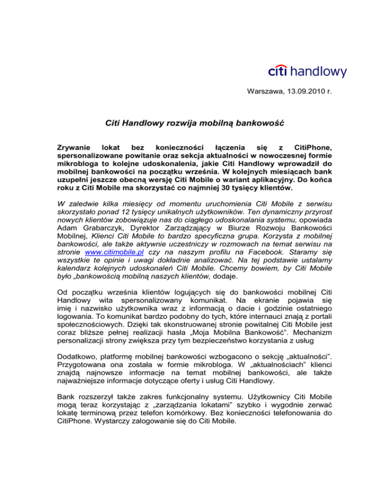 Warszawa, 13.09.2010 r. Citi Handlowy rozwija mobilną bankowość Zrywanie lokat bez konieczności łączenia się z CitiPhone, spersonalizowane powitanie oraz sekcja aktualności w nowoczesnej formie mikrobloga to kolejne udoskonalenia, jakie Citi Handlowy wprowadził do mobilnej bankowości na początku września. W kolejnych miesiącach bank uzupełni jeszcze obecną wersję Citi Mobile o wariant aplikacyjny. Do końca roku z Citi Mobile ma skorzystać co najmniej 30 tysięcy klientów. W zaledwie kilka miesięcy od momentu uruchomienia Citi Mobile z serwisu skorzystało ponad 12 tysięcy unikalnych uŜytkowników. Ten dynamiczny przyrost nowych klientów zobowiązuje nas do ciągłego udoskonalania systemu, opowiada Adam Grabarczyk, Dyrektor Zarządzający w Biurze Rozwoju Bankowości Mobilnej, Klienci Citi Mobile to bardzo specyficzna grupa. Korzysta z mobilnej bankowości, ale takŜe aktywnie uczestniczy w rozmowach na temat serwisu na stronie www.citimobile.pl czy na naszym profilu na Facebook. Staramy się wszystkie te opinie i uwagi dokładnie analizować. Na tej podstawie ustalamy kalendarz kolejnych udoskonaleń Citi Mobile. Chcemy bowiem, by Citi Mobile było „bankowością mobilną naszych klientów, dodaje. Od początku września klientów logujących się do bankowości mobilnej Citi Handlowy wita spersonalizowany komunikat. Na ekranie pojawia się imię i nazwisko uŜytkownika wraz z informacją o dacie i godzinie ostatniego logowania. To komunikat bardzo podobny do tych, które internauci znają z portali społecznościowych. Dzięki tak skonstruowanej stronie powitalnej Citi Mobile jest coraz bliŜsze pełnej realizacji hasła „Moja Mobilna Bankowość”. Mechanizm personalizacji strony zwiększa przy tym bezpieczeństwo korzystania z usług Dodatkowo, platformę mobilnej bankowości wzbogacono o sekcję „aktualności”. Przygotowana ona została w formie mikrobloga. W „aktualnościach” klienci znajdą najnowsze informacje na temat mobilnej bankowości, ale takŜe najwaŜniejsze informacje dotyczące oferty i usług Citi Handlowy. Bank rozszerzył takŜe zakres funkcjonalny systemu. UŜytkownicy Citi Mobile mogą teraz korzystając z „zarządzania lokatami” szybko i wygodnie zerwać lokatę terminową przez telefon komórkowy. Bez konieczności telefonowania do CitiPhone. Wystarczy zalogowanie się do Citi Mobile. Citi Mobile dostępny jest dla wszystkich klientów bankowości internetowej Citi Handlowy. Dla wygody klientów, bank zachował dotychczasowe zasady logowania. Klient korzysta z tej samej nazwy uŜytkownika i hasła, które uŜywa do systemu Citibank Online. Działania realizowane na Citi Mobile zabezpieczane są przez szyfrowane połączenia protokołem SSL. Citi Mobile moŜna znaleźć pod adresem www.mobile.citibank.pl Szczegółowe informacje na temat usług dostępnych w ramach Citi Mobile znaleźć moŜna na stronie www.citimobile.pl oraz na profilu Moja Mobilna Bankowość na Facebook i BLIP. ### Dodatkowych informacji udziela: Paweł Zegarłowicz, Dyrektor Biura Prasowego, tel. (0-22) 657 72 97 E-mail: [email protected] Dorota Szostek-Rustecka, Kierownik ds. Kontaktów z Mediami, tel. (0-22) 690 10 49 E-mail: [email protected] Bank Handlowy w Warszawie SA to jedna z największych instytucji finansowych w Polsce, oferująca pod marką Citi Handlowy bogaty i nowoczesny asortyment produktów i usług bankowości korporacyjnej, inwestycyjnej i detalicznej. Bank Handlowy obsługuje 20 tys. klientów korporacyjnych i 1 mln klientów indywidualnych poprzez nowoczesne kanały dystrybucji oraz sieć ponad 200 oddziałów. W skład grupy kapitałowej Banku wchodzą takie podmioty jak: Dom Maklerski Banku Handlowego i Handlowy Leasing. PrzynaleŜność do Citigroup, największej na świecie instytucji finansowej, zapewnia klientom Banku Handlowego dostęp do usług finansowych w ponad 100 krajach. Dodatkowe informacje moŜna uzyskać na stronie internetowej www.citihandlowy.pl. Citi (NYSE:C) to wiodąca globalna instytucja finansowa, mająca około 200 milionów klientów w ponad 140 krajach. Poprzez swoje dwie odrębne jednostki operacyjne: Citicorp i Citi Holdings, Citi obsługuje klientów indywidualnych, korporacyjnych, rządowych i instytucjonalnych zapewniając im bogaty wachlarz produktów i usług finansowych w zakresie bankowości detalicznej, bankowości korporacyjnej i inwestycyjnej, usług maklerskich i zarządzania aktywami. Dodatkowe informacje moŜna uzyskać na stronie internetowej www.citigroup.com lub or www.citi.com.