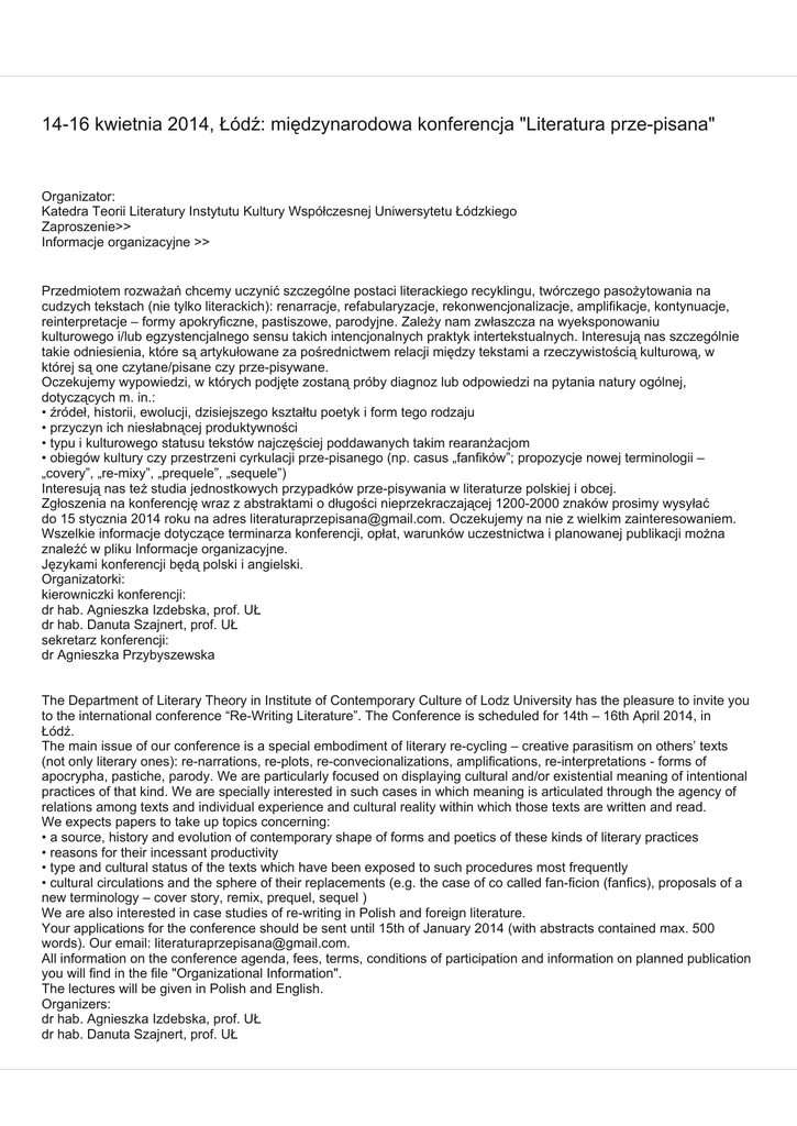 14-16 kwietnia 2014, Łódź: międzynarodowa konferencja "Literatura prze-pisana" Organizator: Katedra Teorii Literatury Instytutu Kultury Współczesnej Uniwersytetu Łódzkiego Zaproszenie>> Informacje organizacyjne >> Przedmiotem rozważań chcemy uczynić szczególne postaci literackiego recyklingu, twórczego pasożytowania na cudzych tekstach (nie tylko literackich): renarracje, refabularyzacje, rekonwencjonalizacje, amplifikacje, kontynuacje, reinterpretacje – formy apokryficzne, pastiszowe, parodyjne. Zależy nam zwłaszcza na wyeksponowaniu kulturowego i/lub egzystencjalnego sensu takich intencjonalnych praktyk intertekstualnych. Interesują nas szczególnie takie odniesienia, które są artykułowane za pośrednictwem relacji między tekstami a rzeczywistością kulturową, w której są one czytane/pisane czy prze-pisywane. Oczekujemy wypowiedzi, w których podjęte zostaną próby diagnoz lub odpowiedzi na pytania natury ogólnej, dotyczących m. in.: • źródeł, historii, ewolucji, dzisiejszego kształtu poetyk i form tego rodzaju • przyczyn ich niesłabnącej produktywności • typu i kulturowego statusu tekstów najczęściej poddawanych takim rearanżacjom • obiegów kultury czy przestrzeni cyrkulacji prze-pisanego (np. casus „fanfików”; propozycje nowej terminologii – „covery”, „re-mixy”, „prequele”, „sequele”) Interesują nas też studia jednostkowych przypadków prze-pisywania w literaturze polskiej i obcej. Zgłoszenia na konferencję wraz z abstraktami o długości nieprzekraczającej 1200-2000 znaków prosimy wysyłać do 15 stycznia 2014 roku na adres [email protected]. Oczekujemy na nie z wielkim zainteresowaniem. Wszelkie informacje dotyczące terminarza konferencji, opłat, warunków uczestnictwa i planowanej publikacji można znaleźć w pliku Informacje organizacyjne. Językami konferencji będą polski i angielski. Organizatorki: kierowniczki konferencji: dr hab. Agnieszka Izdebska, prof. UŁ dr hab. Danuta Szajnert, prof. UŁ sekretarz konferencji: dr Agnieszka Przybyszewska The Department of Literary Theory in Institute of Contemporary Culture of Lodz University has the pleasure to invite you to the international conference “Re-Writing Literature”. The Conference is scheduled for 14th – 16th April 2014, in Łódź. The main issue of our conference is a special embodiment of literary re-cycling – creative parasitism on others’ texts (not only literary ones): re-narrations, re-plots, re-convecionalizations, amplifications, re-interpretations - forms of apocrypha, pastiche, parody. We are particularly focused on displaying cultural and/or existential meaning of intentional practices of that kind. We are specially interested in such cases in which meaning is articulated through the agency of relations among texts and individual experience and cultural reality within which those texts are written and read. We expects papers to take up topics concerning: • a source, history and evolution of contemporary shape of forms and poetics of these kinds of literary practices • reasons for their incessant productivity • type and cultural status of the texts which have been exposed to such procedures most frequently • cultural circulations and the sphere of their replacements (e.g. the case of co called fan-ficion (fanfics), proposals of a new terminology – cover story, remix, prequel, sequel ) We are also interested in case studies of re-writing in Polish and foreign literature. Your applications for the conference should be sent until 15th of January 2014 (with abstracts contained max. 500 words). Our email: [email protected]. All information on the conference agenda, fees, terms, conditions of participation and information on planned publication you will find in the file "Organizational Information". The lectures will be given in Polish and English. Organizers: dr hab. Agnieszka Izdebska, prof. UŁ dr hab. Danuta Szajnert, prof. UŁ dr Agnieszka Przybyszewska Conference invitation >>