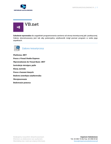 IMPERIUMSZKOLENIOWE.PL | 1 VB.net Szkolenie wprowadza do zagadnień programowania zarówno od strony teoretycznej jak i praktycznej. Zakres skonstruowany jest tak aby potencjalny użytkownik mógł poznać program w wielu jego aspektach. Zakres tematyczny Platforma .NET Praca z Visual Studio Express Wprowadzenie do Visual Basic .NET Instrukcje sterujące, pętle Klasy, metody Praca z bazami danych Budowa interfejsu użytkownika Wersjonowanie Budowanie pomocy Dziękujemy wszystkim dotychczasowym Klientom za obdarzenie nas zaufaniem. Skontaktuj się z nami po więcej informacji. Imperium Szkoleniowe Tel. 22 402 15 04, Fax: 22 258 23 62 [email protected]