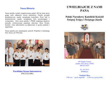 Nasza Historia Nasza parafia została zorganizowana ponad 100 lat temu przez grupę osób oddanych wierze katolickiej. Parafia przyjęła demokratyczne zasady zarządzania kościołem. Przez lata te demokratyczne zasady zarządzania były przestrzegane i wzmacniane. Dziś nasza parafia i PNKK zaspokaja duchowe potrzeby zróżnicowanej populacji etnicznej. Msze Święte, homilie i inne nabożeństwa są odprawiane w języku polskim i angielskim. UWIELBIAJCIE Z NAMI PANA Polski Narodowy Katolicki Kościół Świętej Trójcy i Świętego Józefa Nasza parafia jest zaspokajanie potrzeb Wspólnot Centralnego New Jersey od 1930 roku. 407 Ziegler Avenue Linden, New Jersey 07036 908-925-6537 Parafialna Strona Internetowa: Ks. Jan Kość Proboszcz PNCCNJ.ORG Niedziela Msze 9:00 a.m. – język angielski 11:00 a.m. język polski Jesteśmy Wspólnotą Katolicką Otwarta Rodzina Parafialna Czym jest PNKK? Nasze drzwi są otwarte dla wszystkich. Dla tych, którzy nie znają Chrystusa, którzy wzrastali w innej wierze; dla tych, którzy nie czują się zrealizowani w swojej wspólnocie religijnej; ci,którzy są rozwiedzeni, którzy poszukują Boga, wiary, oraz wspólnoty, gdzie żyje się miłością Boga i blźniego – dla tych wszystkich nasze serca oraz drzwi naszego kośćioła są zawsze otwarte. Jesteśmy Kościołem Katolickim - opartym na Piśmie Świętym i Tradycji Kościoła Jesteśmy Kościołem Apostolskim Jesteśmy Kościołem nauczającym Jesteśmy Kościołem sakramentalnym uznającym siedem sakramentów Nie jesteśmy (Papieskim) Rzymskim Kościołem Katolickim Jesteśmy Kościołem demokratycznym Jesteśmy Kościołem ekumenicznym Jesteśmy Kościołem pomagającym Jesteśmy Kościołem modlącym się Jesteśmy Kościołem otwartym na innych
