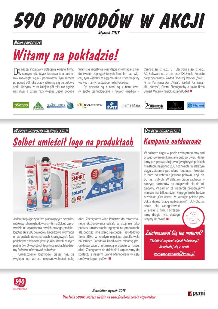 590 powodów w akcji Styczeń 2013 Nowi partnerzy Witamy na pokładzie! D o naszej inicjatywy dołączają kolejne firmy. W samym tylko styczniu nasza lista partnerów rozwinęła się o 9 podmiotów. Tym samym po ponad pół roku pracy zbliżamy się do połowy setki. Liczymy, że za kolejne pół roku nie będzie nas dwa, a cztery razy więcej. Jeżeli podoba Wam się inicjatywa rozsyłajcie informacje o niej do swoich zaprzyjaźnionych firm. Im nas więcej, tym większy zasięg ma akcja i tym większy wpływ mamy na świadomość Polaków. Od stycznia są z nami są z nami cztery spółki technologiczne i nowych mediów - pSenso sp. z o.o., BT Electronics sp. z o.o., AC Software sp. z o.o. oraz XXLStock. Ponadto dołączyły do nas - Zakład Produkcji Pościeli „Świt”, Firma Kamieniarska „Maja”, Zakład Kamieniarski „Kamyk”, Okami Photography a także firma Simed. Witamy na pokładzie 590-tki! n Wzrost rozpoznawalności akcji Do celu coraz bliżej Solbet umieścił logo na produktach Kampania outdoorowa Jedna z największych firm produkujących beton komórkowy i chemię budowlaną – firma Solbet, wprowadziła na opakowania swoich nowego produktu logotyp akcji 590 powodów. Dodatkowo informacja o nas znalazła się na stronach katalogowych. Nad podobnym działaniem pracuje kilku innych naszych partnerów. O wszystkich tego typu ruchach będziemy Państwa informować na bieżąco. Umieszczenie logotypów cieszy nas, ze względu na wzrost rozpoznawalności całej akcji. Zachęcamy więc Państwa do maksymalnego eksponowania udziału w akcji nie tylko poprzez umieszczanie logotypu na produktach, ale poprzez inne przedsięwzięcia. Przykładowo firma SEKO w zeszłym miesiącu opublikowała na łamach Poradnika Handlowca reklamę produktową wraz z informacją o udziale w naszej akcji. Zachęcamy do działania i zapraszamy do kontaktu z naszym Brand Managerem w celu omówienia pomysłów! n W dalszym ciągu w pocie czoła pracujemy nad przygotowaniem kampanii outdoorowej. Planujemy przeprowadzić ją w największych polskich miastach, na ponad 250 nośnikach. W dalszym ciągu zbieramy potrzebne fundusze. Pozostało nam do zebrania jeszcze połowa, czyli ok. 50 tys. złotych. W dalszym ciągu zachęcamy naszych partnerów do dołączenia się do inicjatywy. W zamian za wsparcie proponujemy miejsce na billboardzie, którego treść będzie brzmiała: „Czy wiesz, że kupując polskie produkty dajesz pracę najbliższym?”. Dotychczas udało się zaangażować w akcję 8 firm. Potrzebujemy drugie tyle, dlatego liczymy na Was! n 590 Zainteresował Cię ten materiał? Chciałbyś uzyskać więcej informacji? Skontaktuj się z nami! [email protected] Newsletter styczeń 2013 Działania 590tki możesz śledzić na www.facebook.com/590powodow