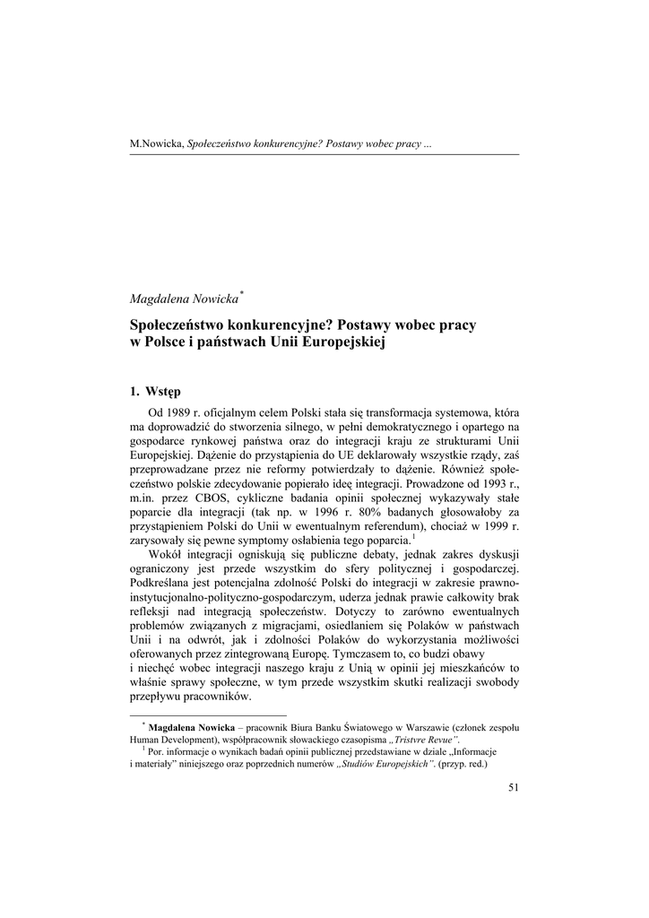 M.Nowicka, Społeczeństwo konkurencyjne? Postawy wobec pracy ... Magdalena Nowicka * Społeczeństwo konkurencyjne? Postawy wobec pracy w Polsce i państwach Unii Europejskiej 1. Wstęp Od 1989 r. oficjalnym celem Polski stała się transformacja systemowa, która ma doprowadzić do stworzenia silnego, w pełni demokratycznego i opartego na gospodarce rynkowej państwa oraz do integracji kraju ze strukturami Unii Europejskiej. Dążenie do przystąpienia do UE deklarowały wszystkie rządy, zaś przeprowadzane przez nie reformy potwierdzały to dążenie. Również społeczeństwo polskie zdecydowanie popierało ideę integracji. Prowadzone od 1993 r., m.in. przez CBOS, cykliczne badania opinii społecznej wykazywały stałe poparcie dla integracji (tak np. w 1996 r. 80% badanych głosowałoby za przystąpieniem Polski do Unii w ewentualnym referendum), chociaż w 1999 r. zarysowały się pewne symptomy osłabienia tego poparcia. 1 Wokół integracji ogniskują się publiczne debaty, jednak zakres dyskusji ograniczony jest przede wszystkim do sfery politycznej i gospodarczej. Podkreślana jest potencjalna zdolność Polski do integracji w zakresie prawnoinstytucjonalno-polityczno-gospodarczym, uderza jednak prawie całkowity brak refleksji nad integracją społeczeństw. Dotyczy to zarówno ewentualnych problemów związanych z migracjami, osiedlaniem się Polaków w państwach Unii i na odwrót, jak i zdolności Polaków do wykorzystania możliwości oferowanych przez zintegrowaną Europę. Tymczasem to, co budzi obawy i niechęć wobec integracji naszego kraju z Unią w opinii jej mieszkańców to właśnie sprawy społeczne, w tym przede wszystkim skutki realizacji swobody przepływu pracowników. * Magdalena Nowicka – pracownik Biura Banku Światowego w Warszawie (członek zespołu Human Development), współpracownik słowackiego czasopisma „Tristvre Revue”. 1 Por. informacje o wynikach badań opinii publicznej przedstawiane w dziale „Informacje i materiały” niniejszego oraz poprzednich numerów „Studiów Europejskich”. (przyp. red.) 51 Studia Europejskie, 4/1999 W Polsce dominuje przekonanie, że komunizm w sposób sztuczny oderwał nas „na chwilę” od Europy, natomiast po jego upadku do Europy po prostu powracamy. Takie podejście nie pozostawia miejsca na refleksję nad tym, czy odmienne warunki historyczne, a przede wszystkim lata komunizmu nie pozostawiły czegoś więcej niż zacofania gospodarczego. Izolacja od idei i zjawisk występujących w państwach członkowskich Wspólnot Europejskich i odmienne warunku rozwoju wykształciły inne mechanizmy działań jednostek. Nawet społeczeństwa, które nie przeszły w swoim rozwoju tak drastycznych wydarzeń jak Polacy, przystępując do Wspólnot musiały dostosować się do społeczeństwa zintegrowanego. Ich akcesja oznaczała konieczność zmian obejmujących nie tylko instytucje prawne, polityczne i ekonomiczne, ale również zmiany we wszystkich wymiarach działań jednostek. Integracja w wymiarze społecznym oznacza zdolność danego społeczeństwa do włączenia się na równoprawnych zasadach do wspólnoty innych państw. W rezultacie udanej integracji nowi członkowie wspólnoty powinni korzystać ze wszystkich szans przez nią oferowanych. Czy społeczeństwo polskie różni się od społeczeństwa „europejskiego” (tak dla potrzeb poniższej analizy nazywam wszystkich obywateli państw członkowskich UE)? Z pewnością każdy Polak potrafi wskazać na cechy, które odróżniają go od Niemca czy Francuza. Określenie różnic jest bowiem niezbędnym elementem tożsamości zarówno jednostek, jak i całych państw. W obliczu integracji ze strukturami Unii Europejskiej podkreślane są w publicznych debatach głównie kulturowe różnice pomiędzy Polakami i mieszkańcami krajów Unii. Zakłada się, że w sferze ekonomicznej nasi rodacy zachowują się i myślą tak jak wszyscy mieszkańcy „cywilizowanej” części świata, czyli jak homo economicus. Moim zdaniem odmienne doświadczenia z przeszłości miały jednak wpływ na postawy społeczeństwa polskiego, zwłaszcza w stosunku do pracy zarobkowej. Praca jest niezbędnym elementem życia każdej jednostki, niezależnie od kultury, w której funkcjonuje. Znaczenie jej nadawane ma wpływ na wszystkie inne aspekty życia, na zdolności funkcjonowania w grupie, a zatem również na procesy integracyjne w obrębie społeczeństw. 2. Teoria habitusu Dla wyjaśnienia wpływu komunizmu na postawy Polaków użyteczna jest teoria habitusu. Teoria ta, wprowadzona do nauk społecznych przez Pierre’a Bourdieu, zakłada, że istnieje mechanizm kształtujący doświadczenie oczywistości świata, umożliwiający jednostce adaptację do środowiska i jednoczesne oddziaływanie na owo środowisko. Habitus to system nieuświadamianych wzorów postrzegania i dyspozycji do działania, pośredniczący pomiędzy instytucjami społecznymi a jednostką. W zetknięciu ze zmianami w strukturze instytucji, 52 M.Nowicka, Społeczeństwo konkurencyjne? Postawy wobec pracy ... jednostka korzysta z habitusu, wykształconego wcześniej, przed zaistnieniem zmian, co powoduje częściową, stopniową modyfikację zarówno habitusu jednostki, jak i jego otoczenia. Habitus określa zgodność pomiędzy subiektywnym poczuciem miejsca jednostki w społeczeństwie i jej aspiracjami, a obiektywnymi relacjami i strukturami. W przypadku transformacji całych struktur społecznych następuje „rozsunięcie” i nieprzystawalność struktur subiektywnych i obiektywnych jednostek. Każda zmiana wymaga dostosowania się do niej, nim jednak to nastąpi, przeszłe zachowania są nadal powtarzane, a część jednostek niezdolnych do adaptacji pozostaje wykluczona z rzeczywistości. 2 Taka sytuacja może mieć miejsce w czasie transformacji polskiego systemu i dostosowywania go do systemu Unii Europejskiej. W okres transformacji Polacy weszli z pewnym bagażem doświadczeń, zasadnicz