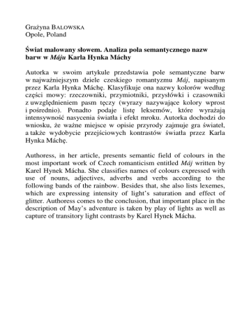 Grażyna BALOWSKA Opole, Poland Świat malowany słowem. Analiza pola semantycznego nazw barw w Máju Karla Hynka Máchy Autorka w swoim artykule przedstawia pole semantyczne barw w najważniejszym dziele czeskiego romantyzmu Máj, napisanym przez Karla Hynka Máchę. Klasyfikuje ona nazwy kolorów według części mowy: rzeczowniki, przymiotniki, przysłówki i czasowniki z uwzględnieniem pasm tęczy (wyrazy nazywające kolory wprost i pośrednio). Ponadto podaje listę leksemów, które wyrażają intensywność nasycenia światła i efekt mroku. Autorka dochodzi do wniosku, że ważne miejsce w opisie przyrody zajmuje gra świateł, a także wydobycie przejściowych kontrastów światła przez Karla Hynka Máchę. Authoress, in her article, presents semantic field of colours in the most important work of Czech romanticism entitled Máj written by Karel Hynek Mácha. She classifies names of colours expressed with use of nouns, adjectives, adverbs and verbs according to the following bands of the rainbow. Besides that, she also lists lexemes, which are expressing intensity of light’s saturation and effect of glitter. Authoress comes to the conclusion, that important place in the description of May’s adventure is taken by play of lights as well as capture of transitory light contrasts by Karel Hynek Mácha.
