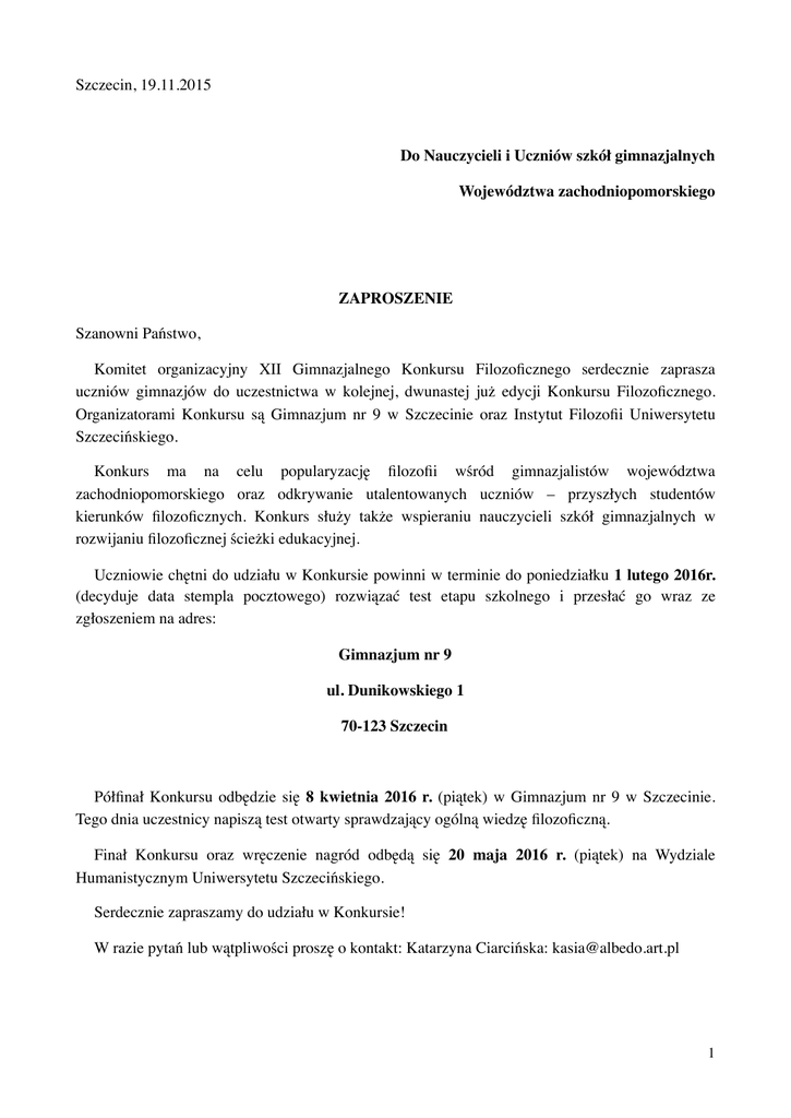 Szczecin, 19.11.2015 Do Nauczycieli i Uczniów szkół gimnazjalnych Województwa zachodniopomorskiego ZAPROSZENIE Szanowni Państwo, Komitet organizacyjny XII Gimnazjalnego Konkursu Filozoficznego serdecznie zaprasza uczniów gimnazjów do uczestnictwa w kolejnej, dwunastej już edycji Konkursu Filozoficznego. Organizatorami Konkursu są Gimnazjum nr 9 w Szczecinie oraz Instytut Filozofii Uniwersytetu Szczecińskiego. Konkurs ma na celu popularyzację filozofii wśród gimnazjalistów województwa zachodniopomorskiego oraz odkrywanie utalentowanych uczniów – przyszłych studentów kierunków filozoficznych. Konkurs służy także wspieraniu nauczycieli szkół gimnazjalnych w rozwijaniu filozoficznej ścieżki edukacyjnej. Uczniowie chętni do udziału w Konkursie powinni w terminie do poniedziałku 1 lutego 2016r. (decyduje data stempla pocztowego) rozwiązać test etapu szkolnego i przesłać go wraz ze zgłoszeniem na adres: Gimnazjum nr 9 ul. Dunikowskiego 1 70-123 Szczecin Półfinał Konkursu odbędzie się 8 kwietnia 2016 r. (piątek) w Gimnazjum nr 9 w Szczecinie. Tego dnia uczestnicy napiszą test otwarty sprawdzający ogólną wiedzę filozoficzną. Finał Konkursu oraz wręczenie nagród odbędą się 20 maja 2016 r. (piątek) na Wydziale Humanistycznym Uniwersytetu Szczecińskiego. Serdecznie zapraszamy do udziału w Konkursie! W razie pytań lub wątpliwości proszę o kontakt: Katarzyna Ciarcińska: [email protected] 1 REGULAMIN XII GIMNAZJALNEGO KONKURSU FILOZOFICZNEGO: Organizator: - Gimnazjum nr 9 w Szczecinie Współpraca i opieka merytoryczna: - Instytut Filozofii, Wydział Humanistyczny Uniwersytetu Szczecińskiego Zespół organizacyjny: - dr hab. prof. US Maciej Witek – wicedyrektor Instytutu Filozofii Uniwersytetu Szczecińskiego - mgr Teresa Ostrowska – dyrektor Gimnazjum nr 9 - mgr Katarzyna Ciarcińska – doktorantka IF US - mgr Małgorzata Kacprzykowska – nauczycielka Gimnazjum nr 9 Cele konkursu: 1. Wspieranie nauczycieli szkół gimnazjalnych w rozwijaniu filozoficznej ścieżki edukacyjnej. 2. Propagowanie filozofii wśród gimnazjalistów województwa zachodniopomorskiego. 3. Zainteresowanie uczniów edukacją filozoficzną i etyką. Uczestnicy Uczestnikami konkursu mogą być uczniowie szkół gimnazjalnych województwa zachodniopomorskiego. Chętni mogą zgłaszać się indywidualnie lub za pośrednictwem opiekuna. Etapy Konkursu 1. Etap szkolny (grudzień 2015 r. – 1 luty 2016 r.) Uczestnicy rozwiązują samodzielnie lub pod kierunkiem nauczyciela test sprawdzający ogólną wiedzę z filozofii i etyki. Rozwiązania wraz ze zgłoszeniem należy przesyłać na adres: Gimnazjum nr 9 ul. Dunikowskiego 1 70-123 Szczecin z dopiskiem: XII Gimnazjalny Konkurs Filozoficzny. Termin nadsyłania prac upływa 1 lutego 2016 r. (decyduje data stempla pocztowego). 2 2. Półfinał Konkursu (8 kwietnia 2016 r.) Półfinał odbędzie się w Gimnazjum nr 9 w Szczecinie. Uczniowie napiszą test otwarty sprawdzający ich wiedzę filozoficzną. Uczniowie, którzy uzyskają najwyższą liczbę punktów z testu awansują do finału Konkursu, o czym zostaną poinformowani listownie w terminie do 30 kwietnia 2016 r. Maksymalna liczba punktów do zdobycia w półfinale wynosi 60. Wszyscy uczestnicy półfinału są zaproszeni do wzięcia udziału w jednodniowych Warsztatach Filozoficznych organizowanych przez Instytut Filozofii Uniwersytetu Szczecińskiego (ul. Krakowska 71/79, Szczecin). Warsztaty odbędą się 6 maja 2016 r. 3. Finał konkursu (20 maja 2016 r.) Finał Konkursu odbędzie się na Wydziale Humanistycznym Uniwersytetu Szczecińskiego. Finał składa się z dwóch części, ocenianych oddzielnie. Za każdą część można otrzymać maksymalnie po 30 punktów. Część pierwsza to samodzielnie przygotowane i wygłoszone przez finalistę przemówienie na wybrany temat filozoficzny (listę tematów do wyboru otrzymają finaliści wraz z wynikami półfinału). W części drugiej finaliści losują 5 pytań, z których wybierają trzy. Maksymalna liczna punktów do zdobycia w finale wynosi 60. Zwycięzcy otrzymują tytuły Laureatów oraz nagrody rzeczowe. Zakres materiału Zakres materiału XII Gimnazjalnego Konkursu Filozoficznego realizuje Podstawę programową kształcenia ogólnego MEN oraz treści programowe filozoficznej ścieżki edukacyjnej. Wobec tych dokumentów Konkurs ma charakter uzupełniający i rozszerzający. 3 Zagadnienia konkursowe: • Podstawowe pytania, problemy i dyscypliny filozoficzne; • Ontologia: wieczne idee Platona; Arystoteles: hylemorfizm, teoria aktu i potencjalności; • Epistemologia: spór Sokratesa z sofistami o prawdę, jaskinia Platona, klasyczna definicja prawdy, starożytny sceptycyzm, cogito i racjonalizm Kartezjusza, empiryzm i tabula rasa Locke’a, idealizm transcendentalny Kanta, pragmatyczna koncepcja prawdy Jamesa; • Etyka: intelektualizm etyczny Sokratesa, spór Sokratesa z sofistami o relatywizm etyczny, etyka cnót i teoria złotego środka Arystotelesa, hedonizm, epikureizm, stoicyzm, etyka obowiązku Kanta, utylitaryzm Milla; • Aksjologia: triada platońska, sceptycyzm Pirrona, relatywizm, rodzaje wartości, koncepcja wartości Kanta, przewartościowanie wartości według Nietzschego, teoria wartości Maksa Schelera; • Filozofia języka: język naturalny i idealny, gry językowe, teoria aktów mowy, teoria komunikacji, znaczenie i sens językowy, teoria deskrypcji, teoria prawdy Tarskiego; • Kognitywistyka: przedmiot kognitywistyki, teatr kartezjański, rola zmysłów w procesie poznawczym, sensepcja a percepcja; • Filozofia umysłu: świadomość, intencjonalność, problem psychofizyczny (umysł–ciało, umysł–mózg, umysł–organizm), eksternalizm i internalizm w badaniach świadomości, emocje i uczucia; • Inne zagadnienia filozoficzne: o Sposoby uprawiania filozofii, np.: metoda majeutyczna Sokratesa, analityczna we współczesnej filozofii; o Filozofia a sztuka: klasyczna koncep