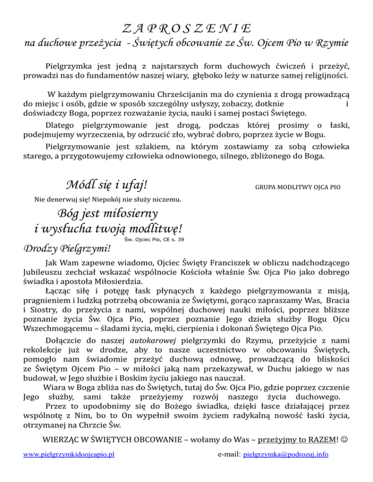 ZAPROSZENIE na duchowe przeżycia - Świętych obcowanie ze Św. Ojcem Pio w Rzymie Pielgrzymka jest jedną z najstarszych form duchowych ćwiczeń i przeżyć, prowadzi nas do fundamentów naszej wiary, głęboko leży w naturze samej religijności. W każdym pielgrzymowaniu Chrześcijanin ma do czynienia z drogą prowadzącą do miejsc i osób, gdzie w sposób szczególny usłyszy, zobaczy, dotknie i doświadczy Boga, poprzez rozważanie życia, nauki i samej postaci Świętego. Dlatego pielgrzymowanie jest drogą, podczas której prosimy o łaski, podejmujemy wyrzeczenia, by odrzucić zło, wybrać dobro, poprzez życie w Bogu. Pielgrzymowanie jest szlakiem, na którym zostawiamy za sobą człowieka starego, a przygotowujemy człowieka odnowionego, silnego, zbliżonego do Boga. Módl się i ufaj! GRUPA MODLITWY OJCA PIO Nie denerwuj się! Niepokój nie służy niczemu. Bóg jest miłosierny i wysłucha twoją modlitwę! Św. Ojciec Pio, CE s. 39 Drodzy Pielgrzymi! Jak Wam zapewne wiadomo, Ojciec Święty Franciszek w obliczu nadchodzącego Jubileuszu zechciał wskazać wspólnocie Kościoła właśnie Św. Ojca Pio jako dobrego świadka i apostoła Miłosierdzia. Łącząc siłę i potęgę łask płynących z każdego pielgrzymowania z misją, pragnieniem i ludzką potrzebą obcowania ze Świętymi, gorąco zapraszamy Was, Bracia i Siostry, do przeżycia z nami, wspólnej duchowej nauki miłości, poprzez bliższe poznanie życia Św. Ojca Pio, poprzez poznanie Jego dzieła służby Bogu Ojcu Wszechmogącemu – śladami życia, męki, cierpienia i dokonań Świętego Ojca Pio. Dołączcie do naszej autokarowej pielgrzymki do Rzymu, przeżyjcie z nami rekolekcje już w drodze, aby to nasze uczestnictwo w obcowaniu Świętych, pomogło nam świadomie przeżyć duchową odnowę, prowadzącą do bliskości ze Świętym Ojcem Pio – w miłości jaką nam przekazywał, w Duchu jakiego w nas budował, w Jego służbie i Boskim życiu jakiego nas nauczał. Wiara w Boga zbliża nas do Świętych, tutaj do Św. Ojca Pio, gdzie poprzez czczenie Jego służby, sami także przeżyjemy rozwój naszego życia duchowego. Przez to upodobnimy się do Bożego świadka, dzięki łasce działającej przez wspólnotę z Nim, bo to On wypełnił swoim życiem radykalną nowość łaski życia, otrzymanej na Chrzcie Św. WIERZĄC W ŚWIĘTYCH OBCOWANIE – wołamy do Was – przeżyjmy to RAZEM! www.pielgrzymkidoojcapio.pl e-mail: [email protected] Pielgrzymka do Rzymu w Roku Miłosierdzia 3-7 luty 2016 r. PROGRAM: 1. dzień /3 luty/ 5.00 – Msza Św. w parafii pw. Matki Bożej Różańcowej w Sosnowcu 6.00 – wyjazd do Rzymu. Przejazd tranzytowy przez Czechy i Austrię do Włoch. Dojazd do hotelu około godz. 22.00, nocleg. 2. dzień /4 luty/ 7.00 – śniadanie. Po śniadaniu przejazd do bazyliki św. Wawrzyńca za Murami, gdzie odbędzie się Msza Św. dla grupy. Nawiedzenia bazyliki św. Jana na Lateranie, Schody Święte. Przejazd do hotelu, zakwaterowanie, obiadokolacja, nocleg. 3. dzień /5 luty/ 6.45 – śniadanie. Po śniadaniu przejazd do kościoła św. Zbawiciela in Lauro, który jest główną rzymską świątynią Grup Modlitwy Ojca Pio i uczestniczymy w uroczystej procesji przeniesienia ciała Ojca Pio z tegoż kościoła do bazyliki św. Piotra na Watykanie, gdzie zostanie umieszczone w pobliżu Drzwi Świętych. Nawiedzenie bazyliki św. Piotra i grobu św. Jana Pawła II, zwiedzanie Placu św. Piotra, Msza św. Przejazd do hotelu, obiadokolacja, nocleg. 4. dzień /6 luty/ 6. 45 – śniadanie, wykwaterowanie z hotelu, 7.30 – wyjazd do Rzymu. Spotkanie Papieża Franciszka z grupami modlitwy o. Pio w Auli Pawła VI, gdzie mamy specjalne bilety wstępu. Rzym Starożytny. Msza św. Rzym nocą. Przejazd nocny do Padwy. Nawiedzenie bazyliki św. Antoniego i kościoła Kapucynów – św. Leopolda. Powrót do kraju w późnych godzinach nocnych CENA: /dla grupy 50 osób/ – 650 zł + 80 euro od osoby /zapewniamy: 3 śniadania, 2 obiadokolacje, 3 noclegi, przejazd autokarem klasy LUX, opieka pilota, opieka duchowa kapłana, ubezpieczenie KL, NNW /bez chorób przewlekłych/ Bez dodatkowych kosztów. Zapisy i kontakt: tel. 508 987 670 www.podrozuj.info [email protected]