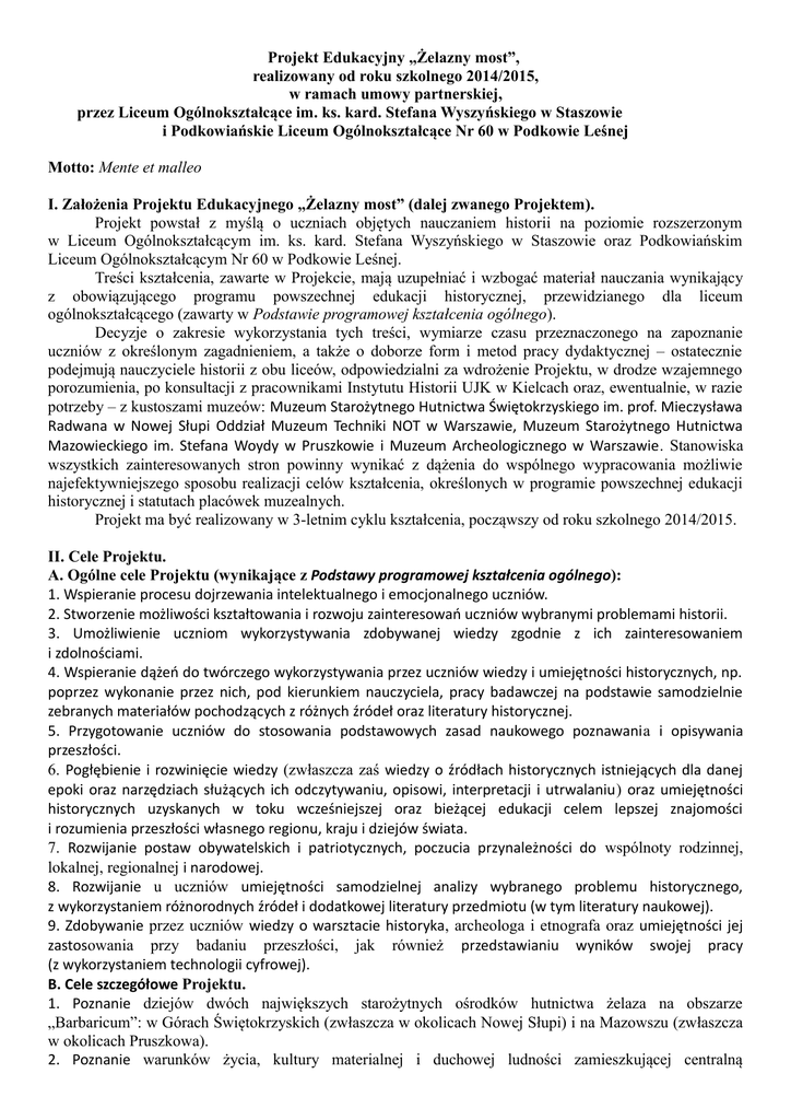 Projekt Edukacyjny „Żelazny most”, realizowany od roku szkolnego 2014/2015, w ramach umowy partnerskiej, przez Liceum Ogólnokształcące im. ks. kard. Stefana Wyszyńskiego w Staszowie i Podkowiańskie Liceum Ogólnokształcące Nr 60 w Podkowie Leśnej Motto: Mente et malleo I. Założenia Projektu Edukacyjnego „Żelazny most” (dalej zwanego Projektem). Projekt powstał z myślą o uczniach objętych nauczaniem historii na poziomie rozszerzonym w Liceum Ogólnokształcącym im. ks. kard. Stefana Wyszyńskiego w Staszowie oraz Podkowiańskim Liceum Ogólnokształcącym Nr 60 w Podkowie Leśnej. Treści kształcenia, zawarte w Projekcie, mają uzupełniać i wzbogać materiał nauczania wynikający z obowiązującego programu powszechnej edukacji historycznej, przewidzianego dla liceum ogólnokształcącego (zawarty w Podstawie programowej kształcenia ogólnego). Decyzje o zakresie wykorzystania tych treści, wymiarze czasu przeznaczonego na zapoznanie uczniów z określonym zagadnieniem, a także o doborze form i metod pracy dydaktycznej – ostatecznie podejmują nauczyciele historii z obu liceów, odpowiedzialni za wdrożenie Projektu, w drodze wzajemnego porozumienia, po konsultacji z pracownikami Instytutu Historii UJK w Kielcach oraz, ewentualnie, w razie potrzeby – z kustoszami muzeów: Muzeum Starożytnego Hutnictwa Świętokrzyskiego im. prof. Mieczysława Radwana w Nowej Słupi Oddział Muzeum Techniki NOT w Warszawie, Muzeum Starożytnego Hutnictwa Mazowieckiego im. Stefana Woydy w Pruszkowie i Muzeum Archeologicznego w Warszawie. Stanowiska wszystkich zainteresowanych stron powinny wynikać z dążenia do wspólnego wypracowania możliwie najefektywniejszego sposobu realizacji celów kształcenia, określonych w programie powszechnej edukacji historycznej i statutach placówek muzealnych. Projekt ma być realizowany w 3-letnim cyklu kształcenia, począwszy od roku szkolnego 2014/2015. II. Cele Projektu. A. Ogólne cele Projektu (wynikające z Podstawy programowej kształcenia ogólnego): 1. Wspieranie procesu dojrzewania intelektualnego i emocjonalnego uczniów. 2. Stworzenie możliwości kształtowania i rozwoju zainteresowań uczniów wybranymi problemami historii. 3. Umożliwienie uczniom wykorzystywania zdobywanej wiedzy zgodnie z ich zainteresowaniem i zdolnościami. 4. Wspieranie dążeń do twórczego wykorzystywania przez uczniów wiedzy i umiejętności historycznych, np. poprzez wykonanie przez nich, pod kierunkiem nauczyciela, pracy badawczej na podstawie samodzielnie zebranych materiałów pochodzących z różnych źródeł oraz literatury historycznej. 5. Przygotowanie uczniów do stosowania podstawowych zasad naukowego poznawania i opisywania przeszłości. 6. Pogłębienie i rozwinięcie wiedzy (zwłaszcza zaś wiedzy o źródłach historycznych istniejących dla danej epoki oraz narzędziach służących ich odczytywaniu, opisowi, interpretacji i utrwalaniu) oraz umiejętności historycznych uzyskanych w toku wcześniejszej oraz bieżącej edukacji celem lepszej znajomości i rozumienia przeszłości własnego regionu, kraju i dziejów świata. 7. Rozwijanie postaw obywatelskich i patriotycznych, poczucia przynależności do wspólnoty rodzinnej, lokalnej, regionalnej i narodowej. 8. Rozwijanie u uczniów umiejętności samodzielnej analizy wybranego problemu historycznego, z wykorzystaniem różnorodnych źródeł i dodatkowej literatury przedmiotu (w tym literatury naukowej). 9. Zdobywanie przez uczniów wiedzy o warsztacie historyka, archeologa i etnografa oraz umiejętności jej zastosowania przy badaniu przeszłości, jak również przedstawianiu wyników swojej pracy (z wykorzystaniem technologii cyfrowej). B. Cele szczegółowe Projektu. 1. Poznanie dziejów dwóch największych starożytnych ośrodków hutnictwa żelaza na obszarze „Barbaricum”: w Górach Świętokrzyskich (zwłaszcza w okolicach Nowej Słupi) i na Mazowszu (zwłaszcza w okolicach Pruszkowa). 2. Poznanie warunków życia, kultury materialnej i duchowej ludności zamieszkującej centralną i południową część ziem polskich w środkowej i schyłkowej fazie epoki żelaza, w okresie kultury przeworskiej (III/II w. p.n.e. – V w. n.e.). 3. Poznanie stanowisk archeologicznych z okresu kultury przeworskiej w rejonie Staszowa i Podkowy Leśnej. 4. Poszerzenie i pogłębienie posiadanej przez uczniów wiedzy na temat kontaktów Imperium Rzymskiego z ziemiami polskimi w okresie od III/II w. p.n.e. do V w. n.e. 5. Poszerzenie i pogłębienie posiadanej przez uczniów ogólnej wiedzy historycznej oraz rozwijanie ich myślenia historycznego dzięki wykorzystaniu potencjału edukacyjnego różnych instytucji, szczególnie szkół ponadgimnazjalnych (liceów ogólnokształcących), szkoły wyższej (Instytutu Historii Uniwersytetu Jana Kochanowskiego w Kielcach) oraz muzeów (Muzeum Starożytnego Hutnictwa Świętokrzyskiego im. prof. Mieczysława Radwana w Nowej Słupi Oddział Muzeum Techniki NOT w Warszawie, Muzeum Starożytnego Hutnictwa Mazowieckiego im. Stefana Woydy w Pruszkowie i Muzeum Archeologicznego w Warszawie). 6. Kształtowanie i doskonalenie umiejętności dokonywania przez uczniów samodzielnej oceny oraz rekonstruowania faktu lub zjawiska historycznego na podstawie różnych źródeł. 7. Kształtowanie i doskonalenie umiejętności dostrzegania przez uczniów zależności między rozmaitymi dziedzinami życia społecznego oraz powiązań losów „Małej Ojczyzny” (w aspekcie politycznym, gospodarczym, kulturowym, historii wojskowości) z dziejami państwa i narodu polskiego oraz historią powszechną (z naciskiem na ich wymiar europejski). 8. Kształtowanie i doskonalenie umiejętności praktycznego wykorzystania przez uczniów zdobytej wiedzy, zwłaszcza w zakresie: wdrażania ich do samodzielnego wysiłku poznawczego, wyrabiania u nich nawyku utrwalania i archiwizowania danych naukowych (z wykorzystaniem technologii cyfrowej) oraz potrzeby promocji regio