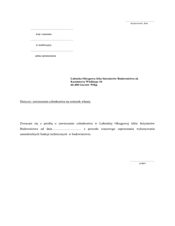 …………………………… miejscowość, data ................................................................. imię i nazwisko ................................................................. nr ewidencyjny ................................................................. adres zamieszkania Lubuska Okręgowa Izba Inżynierów Budownictwa ul. Kazimierza Wielkiego 10 66-400 Gorzów Wlkp. Dotyczy: zawieszenia członkostwa na wniosek własny Zwracam się z prośbą o zawieszenie członkostwa w Lubuskiej Okręgowej Izbie Inżynierów Budownictwa od dnia……………………… z powodu czasowego zaprzestania wykonywania samodzielnych funkcji technicznych w budownictwie. ......................................... . podpis